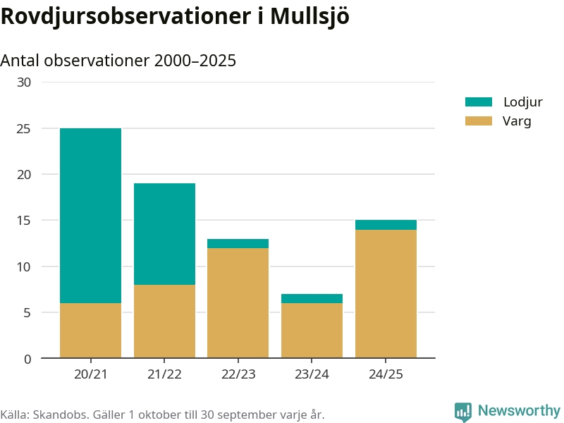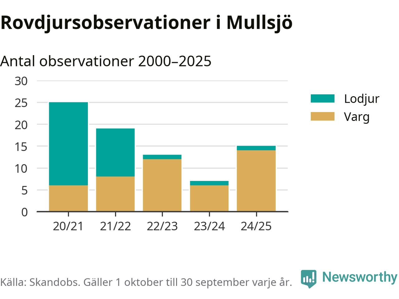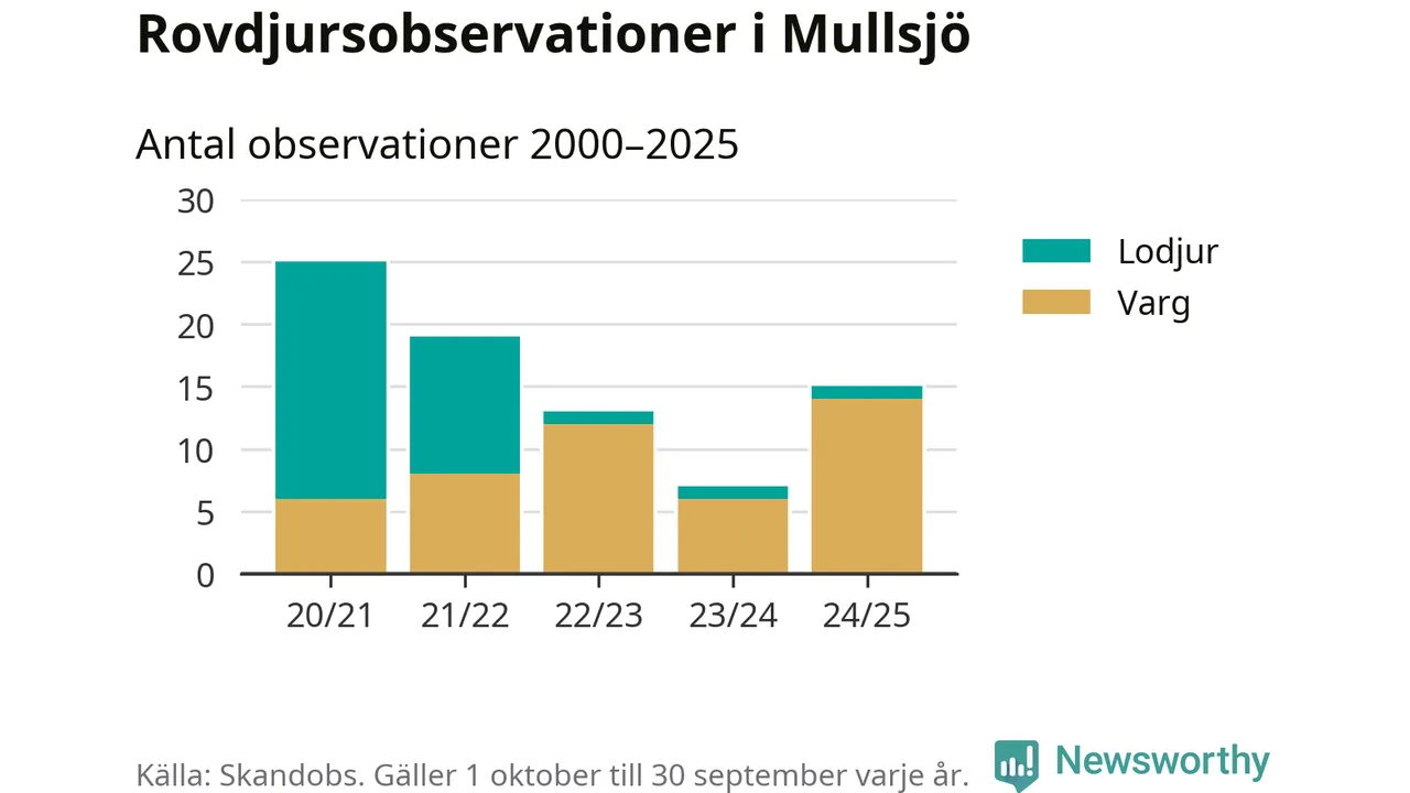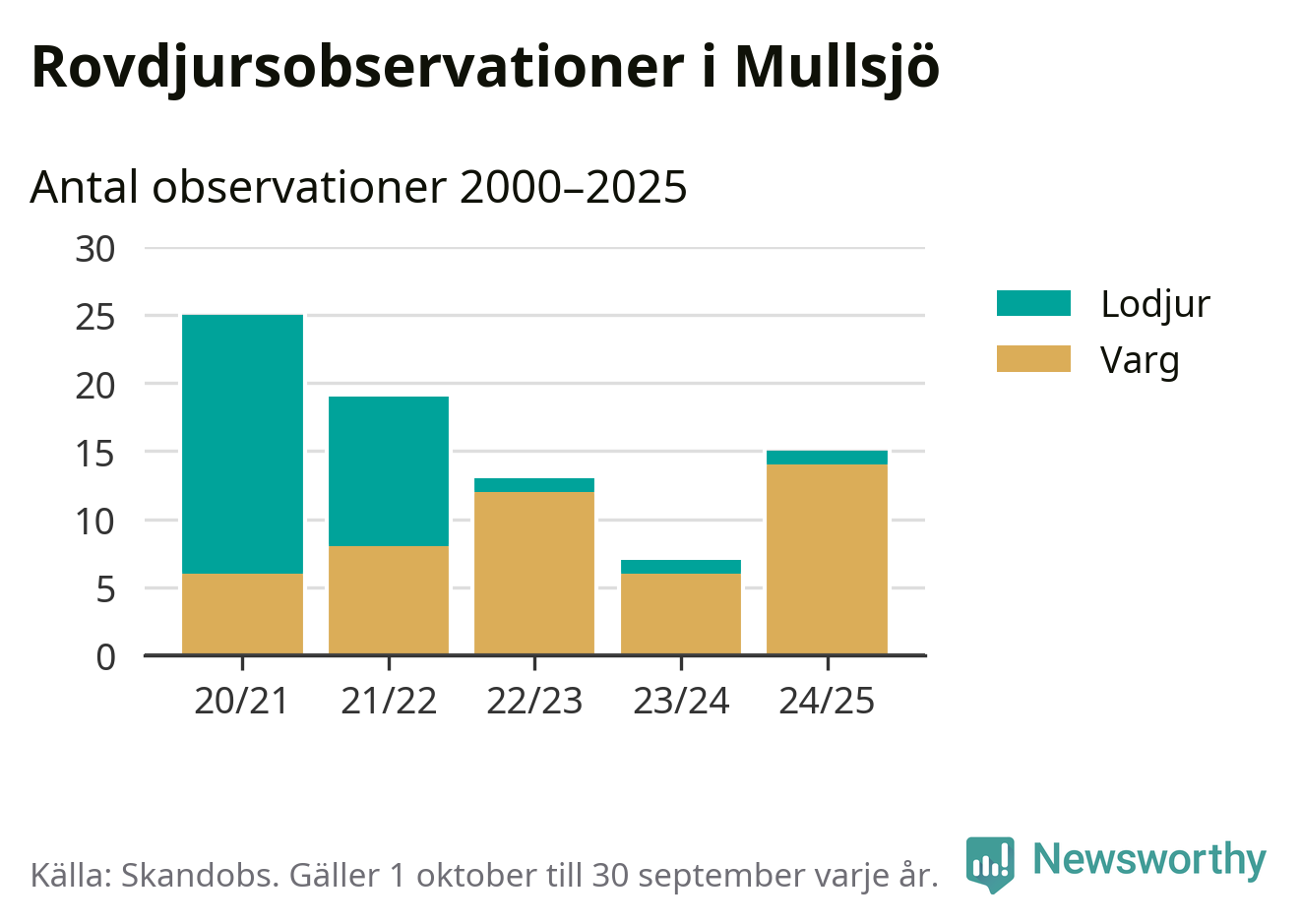 Där kan vem som helst rapportera sina observationer av de stora rovdjuren björn, varg, lodjur och järv. Mellan 1 oktober 2024 och 30 september i år har knappt 10 000 observationer registrerats i landet. Det kan vara synobservationer, foton, spår, spillning, döda bytesdjur eller andra tecken på rovdjursförekomst. I Mullsjö handlar det om totalt 15 observationer av varg eller lodjur.