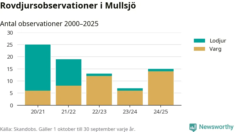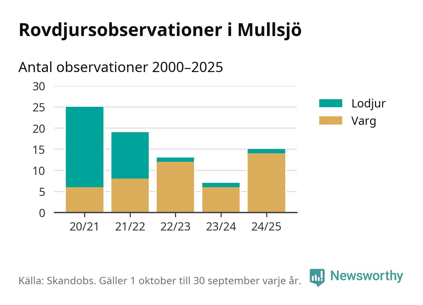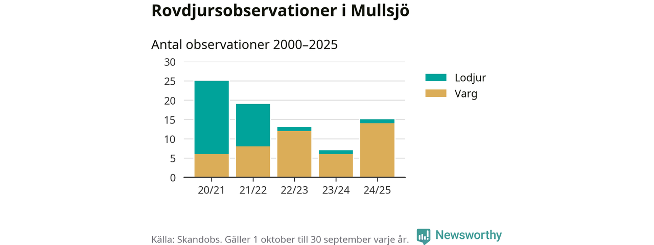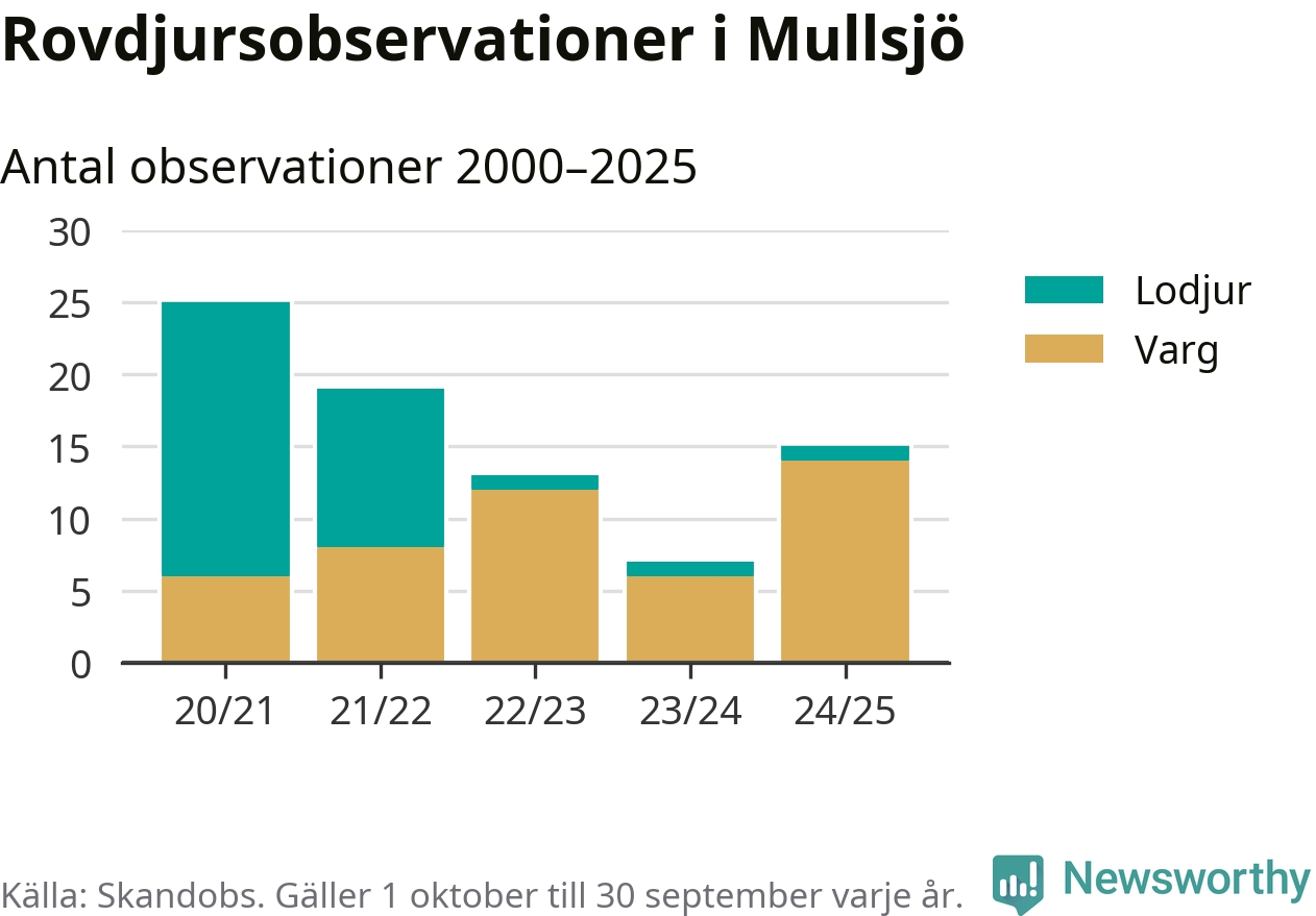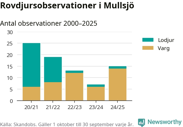 Där kan vem som helst rapportera sina observationer av de stora rovdjuren björn, varg, lodjur och järv. Mellan 1 oktober 2024 och 30 september i år har knappt 10 000 observationer registrerats i landet. Det kan vara synobservationer, foton, spår, spillning, döda bytesdjur eller andra tecken på rovdjursförekomst. I Mullsjö handlar det om totalt 15 observationer av varg eller lodjur.