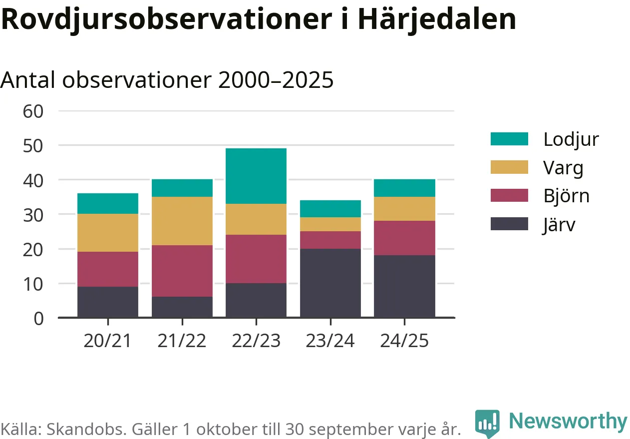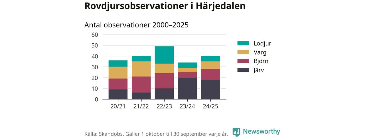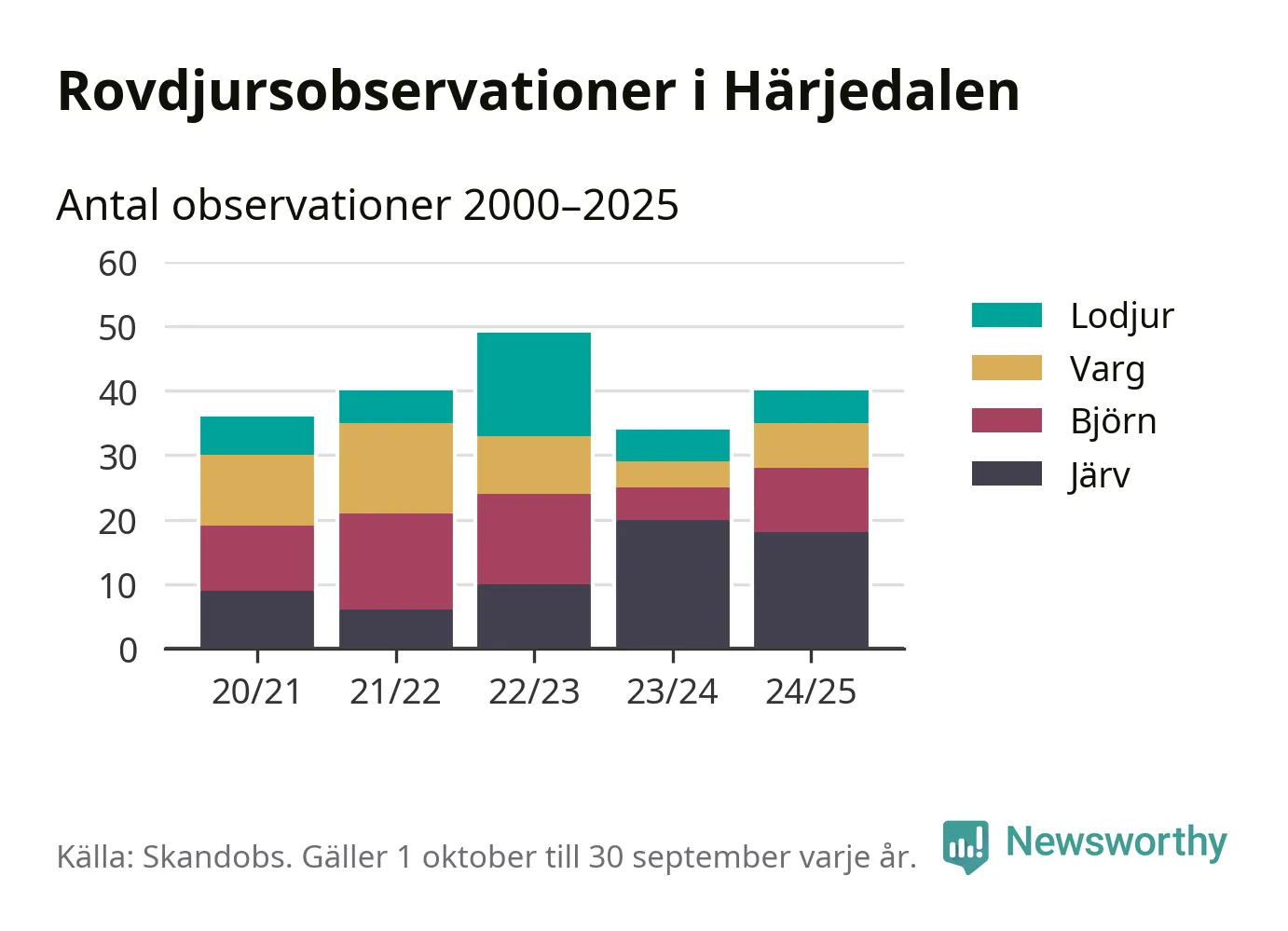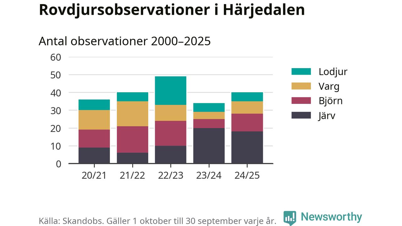 Där kan vem som helst rapportera sina observationer av de stora rovdjuren björn, varg, lodjur och järv. Mellan 1 oktober 2024 och 30 september i år har knappt 10 000 observationer registrerats i landet. Det kan vara synobservationer, foton, spår, spillning, döda bytesdjur eller andra tecken på rovdjursförekomst. I Härjedalen finns totalt 40 rapporter, om alla fyra rovdjur.