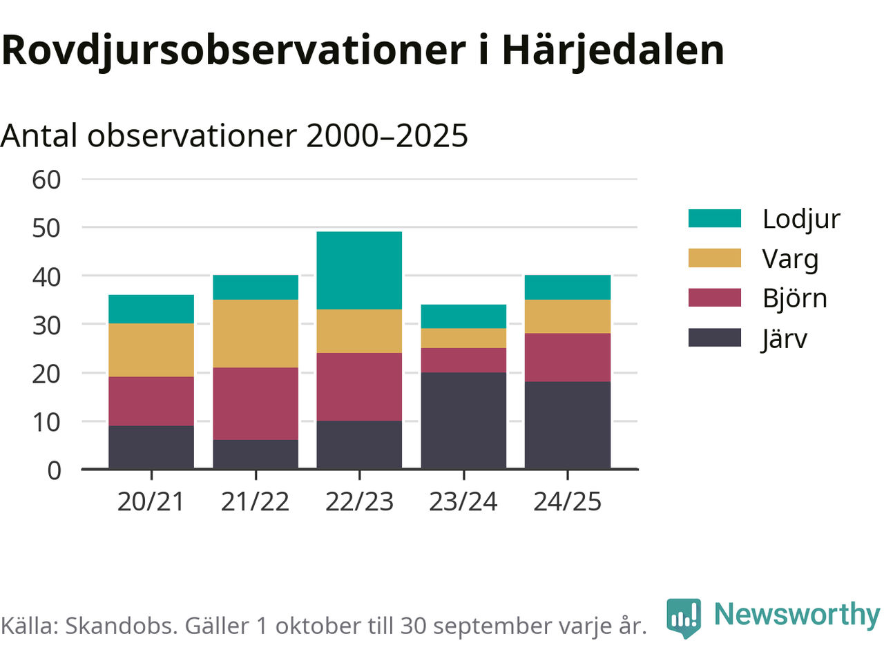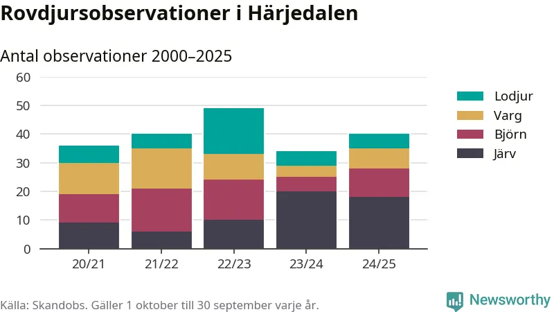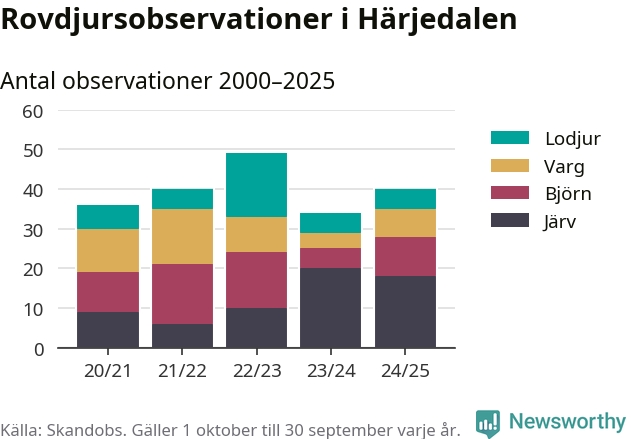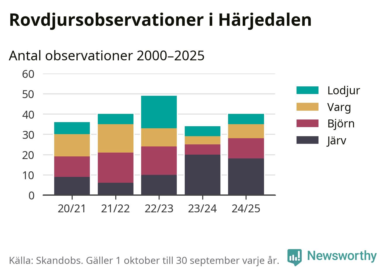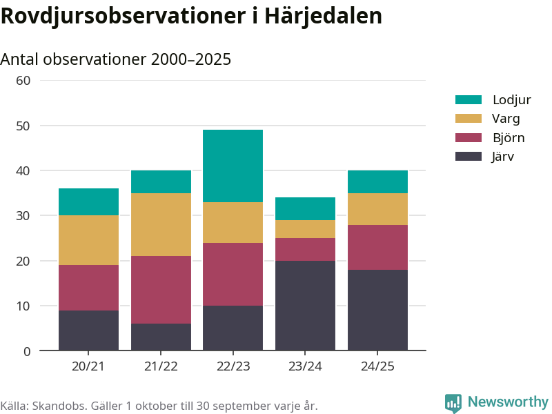 Där kan vem som helst rapportera sina observationer av de stora rovdjuren björn, varg, lodjur och järv. Mellan 1 oktober 2024 och 30 september i år har knappt 10 000 observationer registrerats i landet. Det kan vara synobservationer, foton, spår, spillning, döda bytesdjur eller andra tecken på rovdjursförekomst. I Härjedalen finns totalt 40 rapporter, om alla fyra rovdjur.
