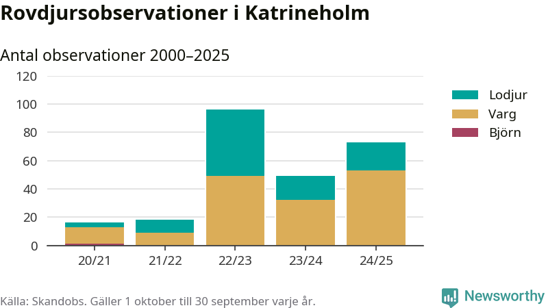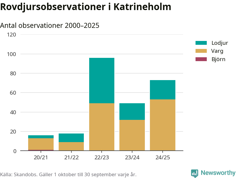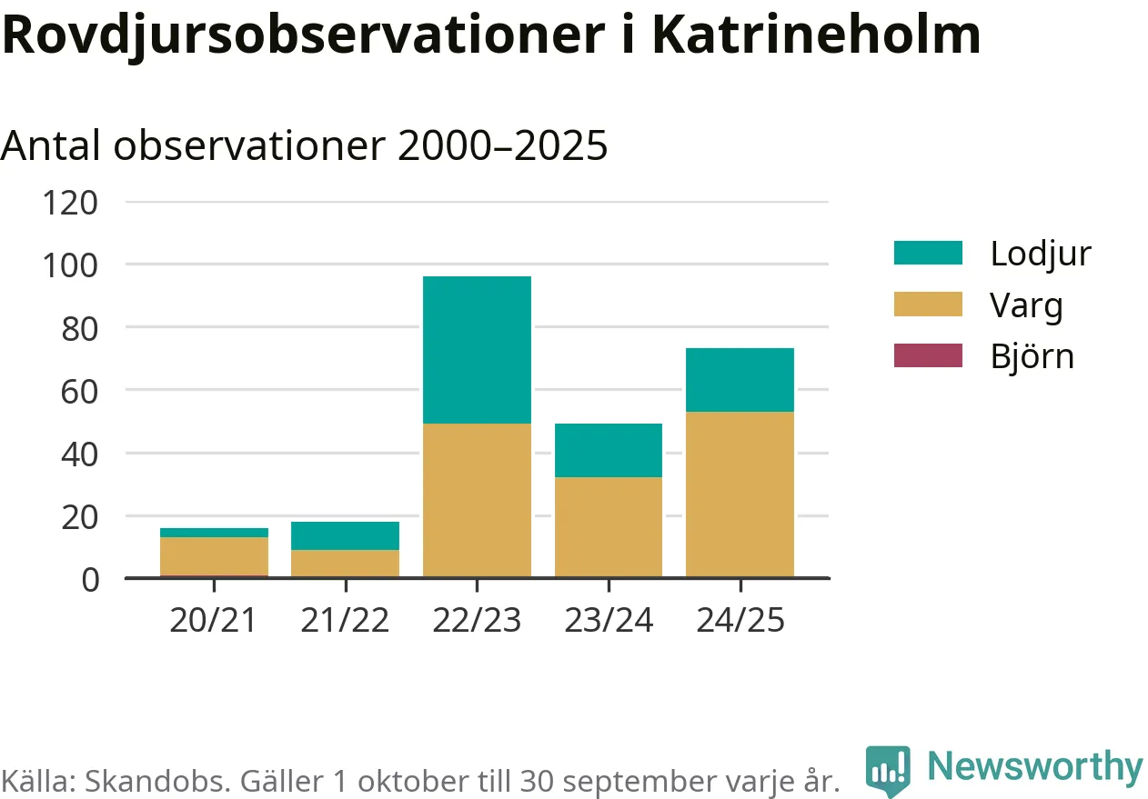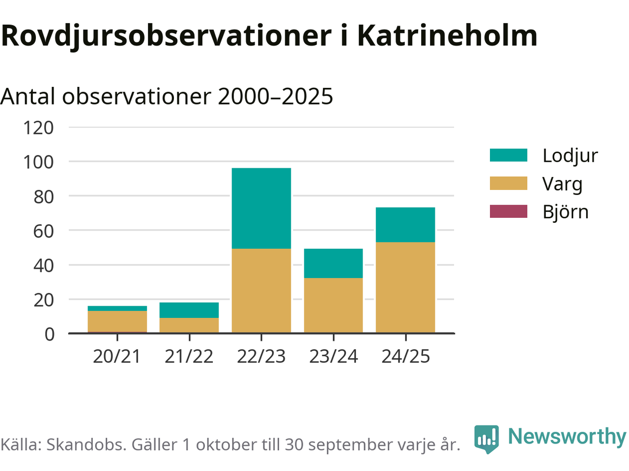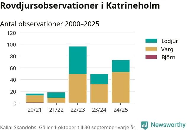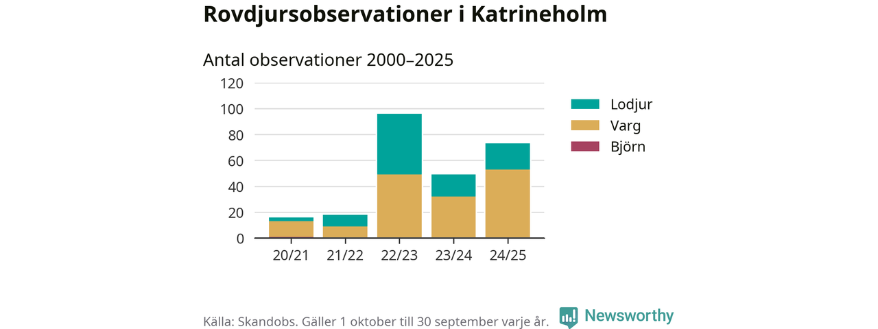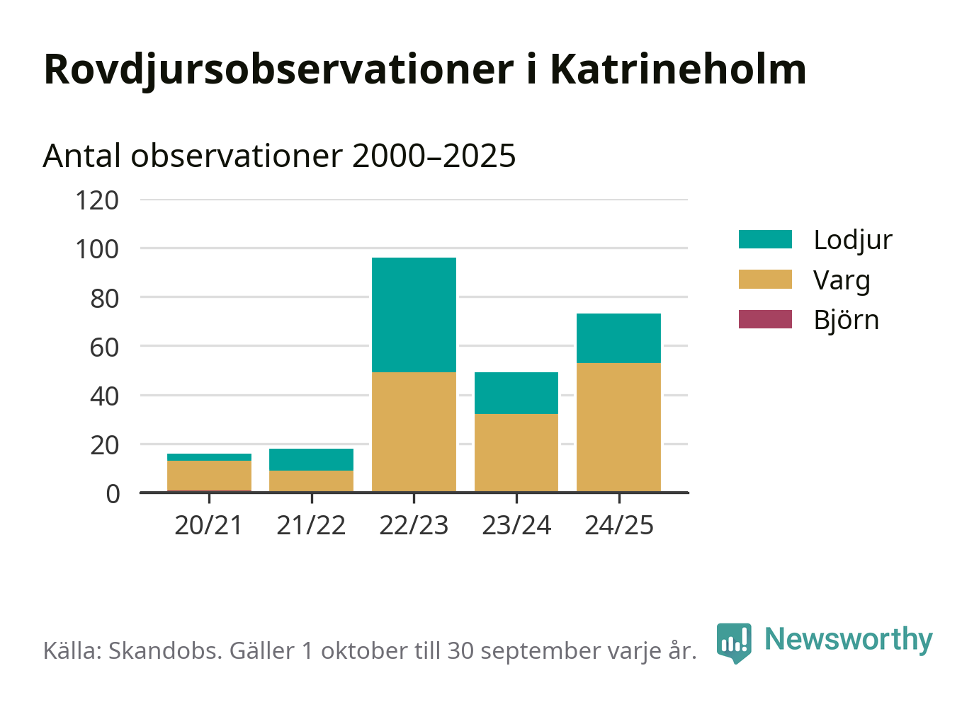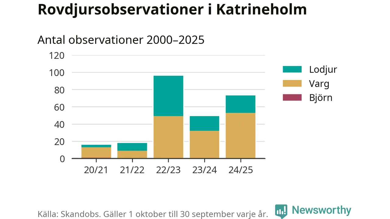 Där kan vem som helst rapportera sina observationer av de stora rovdjuren björn, varg, lodjur och järv. Mellan 1 oktober 2024 och 30 september i år har knappt 10 000 observationer registrerats i landet. Det kan vara synobservationer, foton, spår, spillning, döda bytesdjur eller andra tecken på rovdjursförekomst. I Katrineholm handlar det om totalt 73 observationer av varg eller lodjur.
