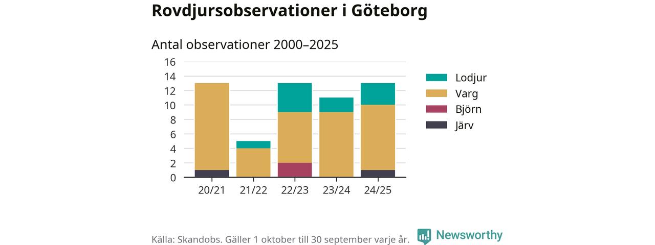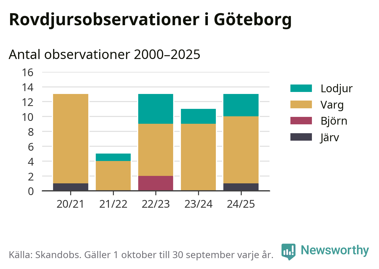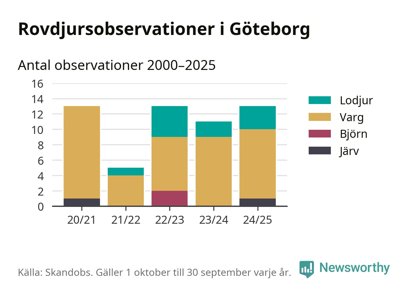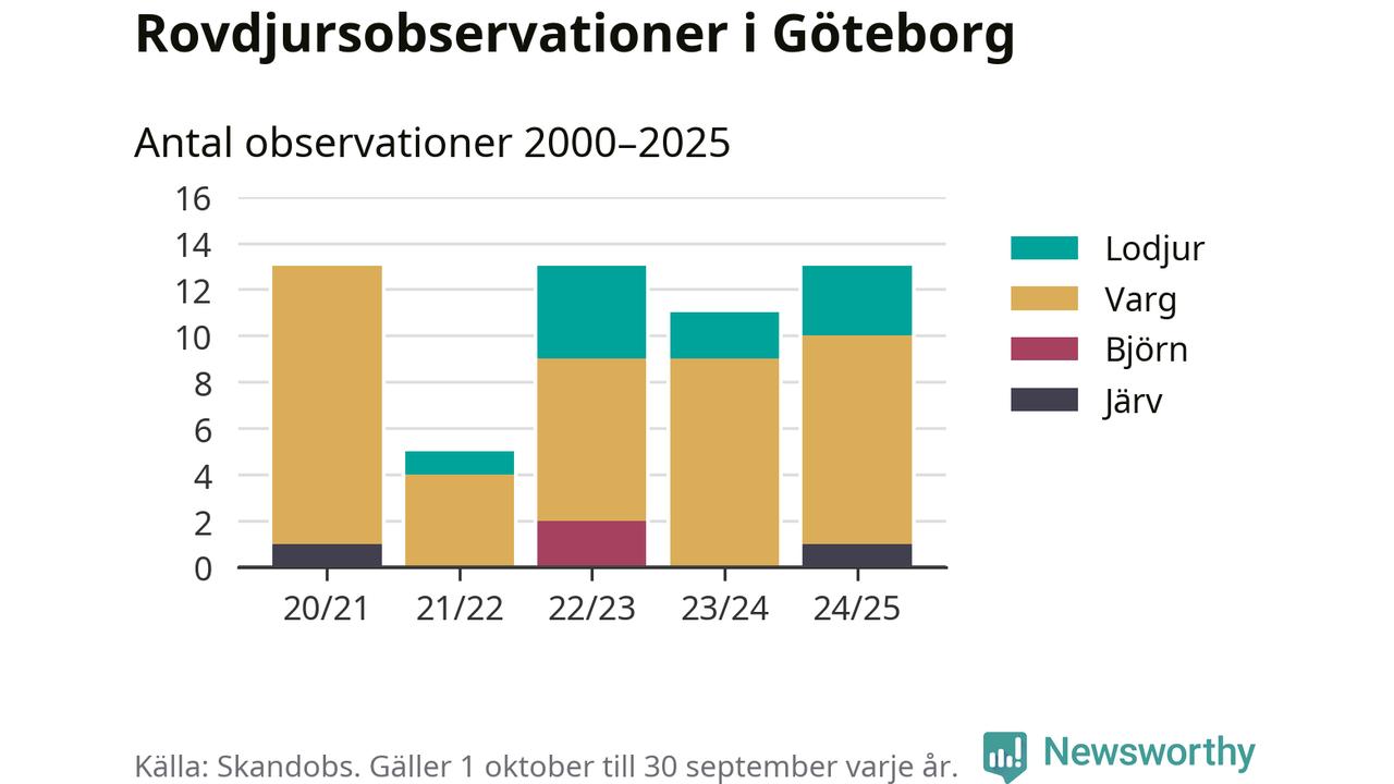 Där kan vem som helst rapportera sina observationer av de stora rovdjuren björn, varg, lodjur och järv. Mellan 1 oktober 2024 och 30 september i år har knappt 10 000 observationer registrerats i landet. Det kan vara synobservationer, foton, spår, spillning, döda bytesdjur eller andra tecken på rovdjursförekomst. I Göteborg handlar det om totalt 13 observationer av varg, lodjur eller järv.