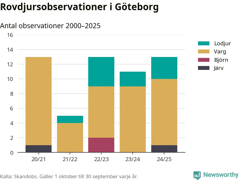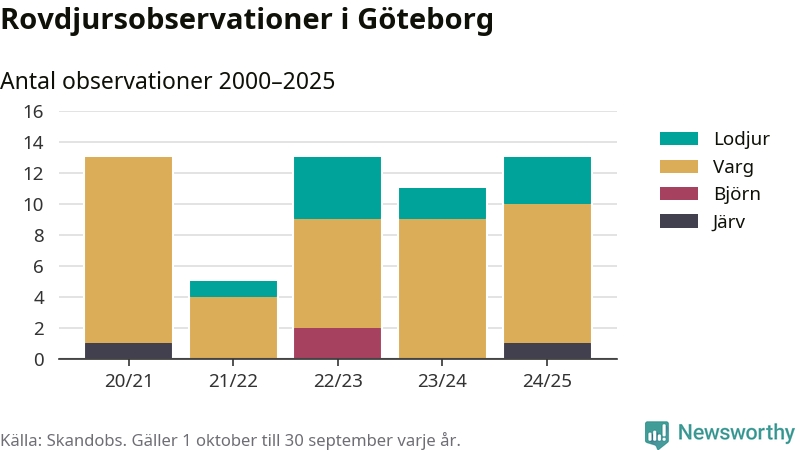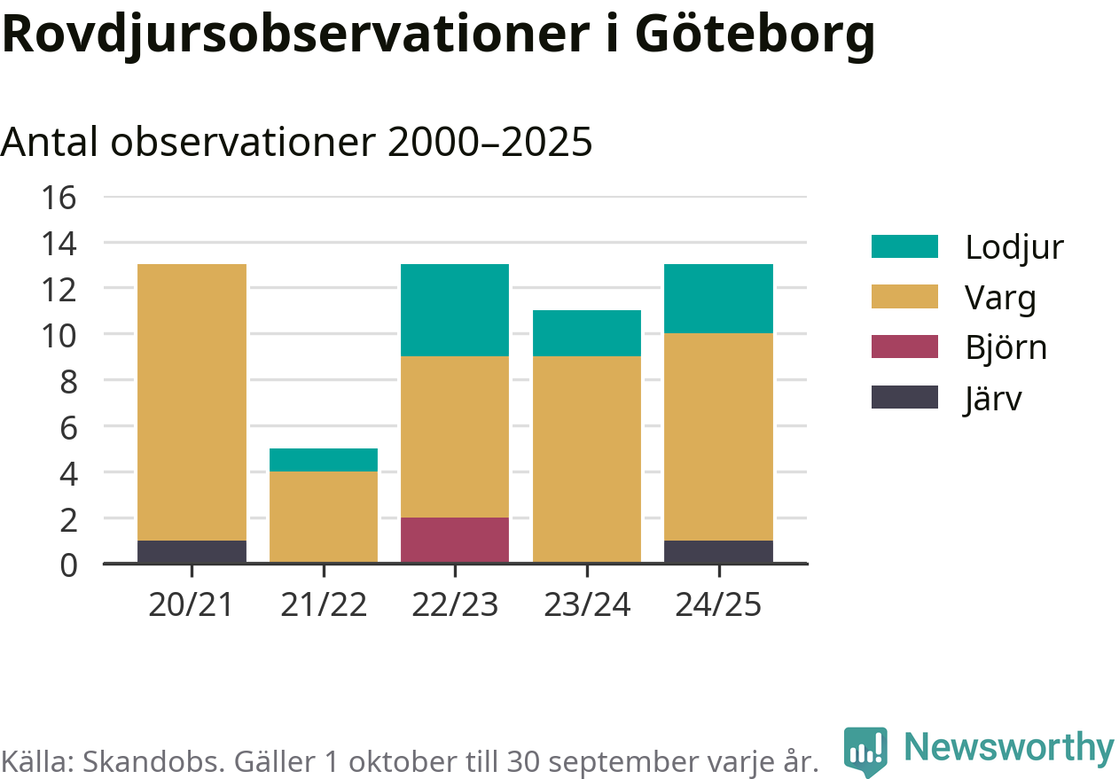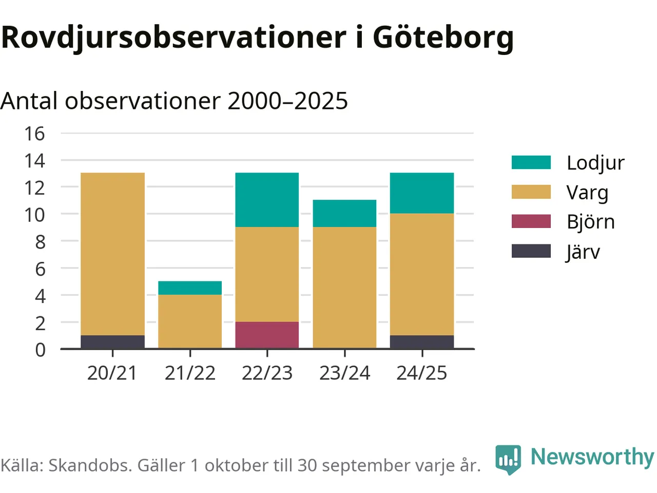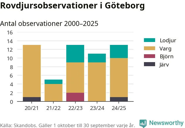 Där kan vem som helst rapportera sina observationer av de stora rovdjuren björn, varg, lodjur och järv. Mellan 1 oktober 2024 och 30 september i år har knappt 10 000 observationer registrerats i landet. Det kan vara synobservationer, foton, spår, spillning, döda bytesdjur eller andra tecken på rovdjursförekomst. I Göteborg handlar det om totalt 13 observationer av varg, lodjur eller järv.