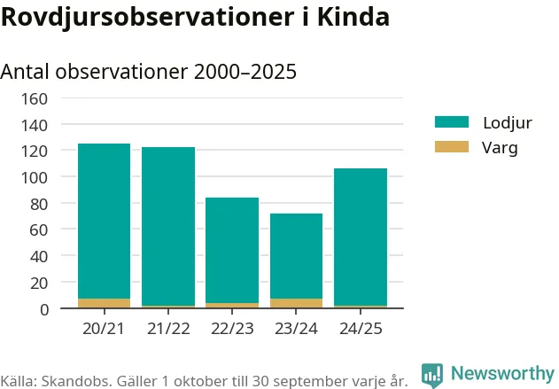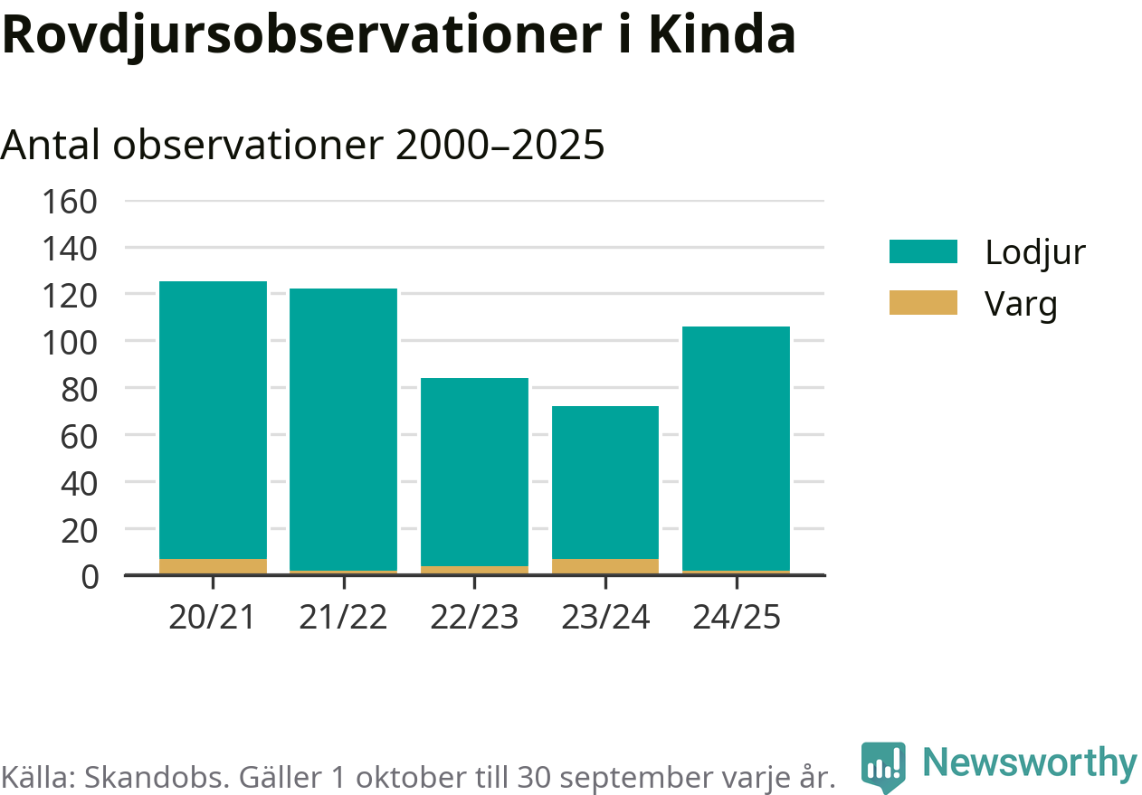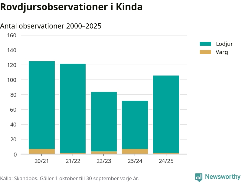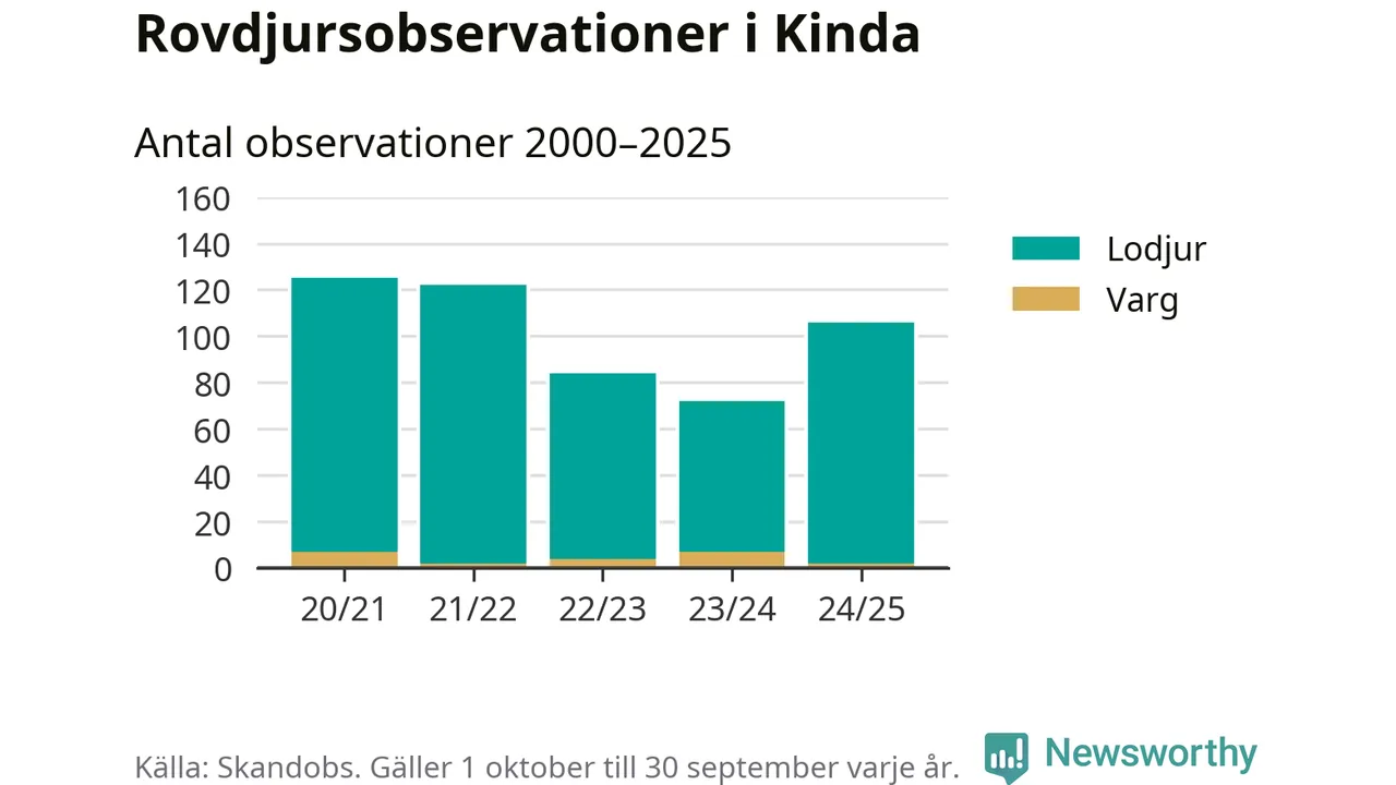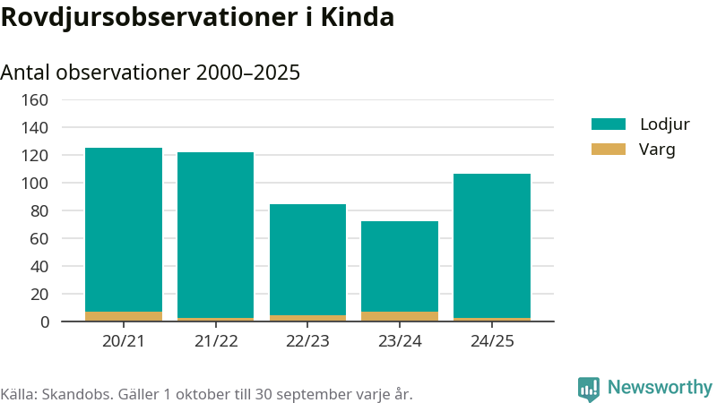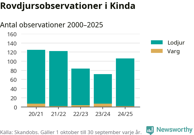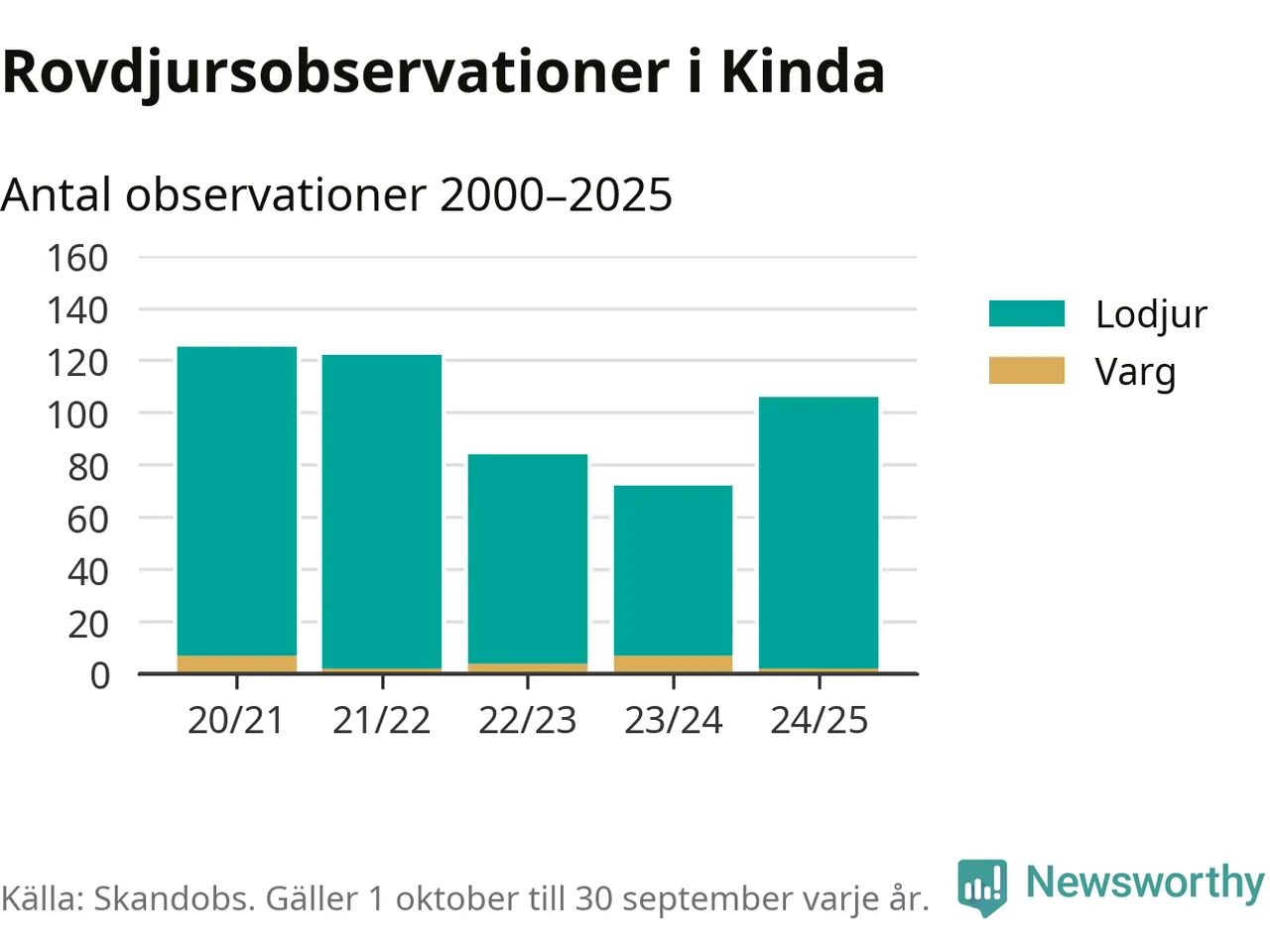 Där kan vem som helst rapportera sina observationer av de stora rovdjuren björn, varg, lodjur och järv. Mellan 1 oktober 2024 och 30 september i år har knappt 10 000 observationer registrerats i landet. Det kan vara synobservationer, foton, spår, spillning, döda bytesdjur eller andra tecken på rovdjursförekomst. I Kinda handlar det om totalt 106 observationer av lodjur eller varg.