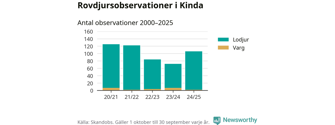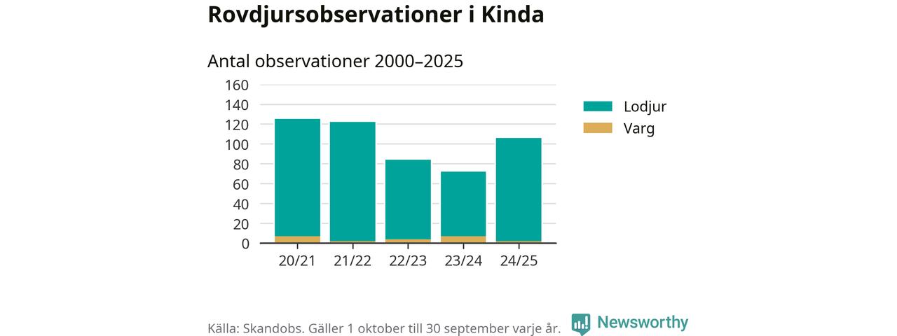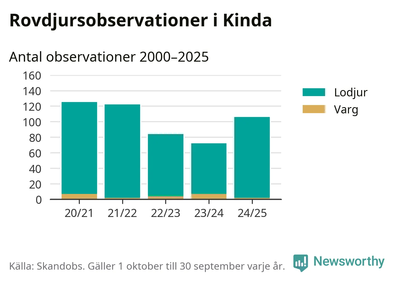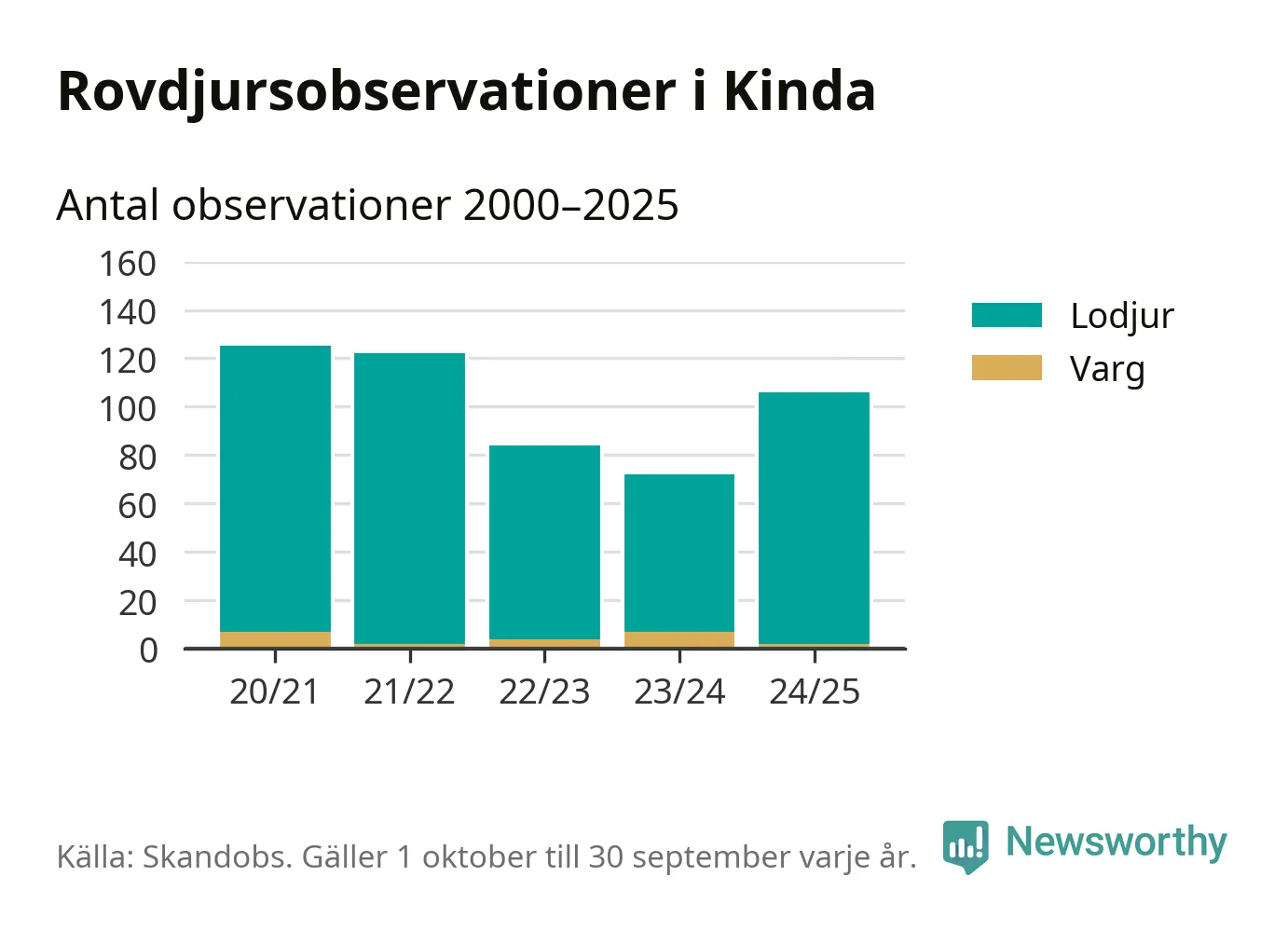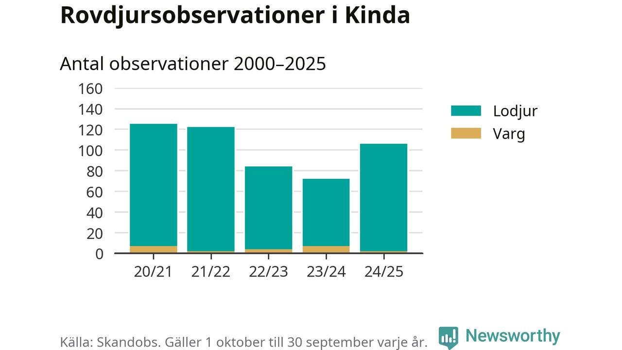 Den 18 september i år rapporterades ett dött eller skadat djur som misstänktes ha fallit offer för lodjur i Kinda. Det var en av de 104 observationer av arten i kommunen, som finns registrerade i den skandinaviska rovdjursdatabasen Skandobs under det senaste året