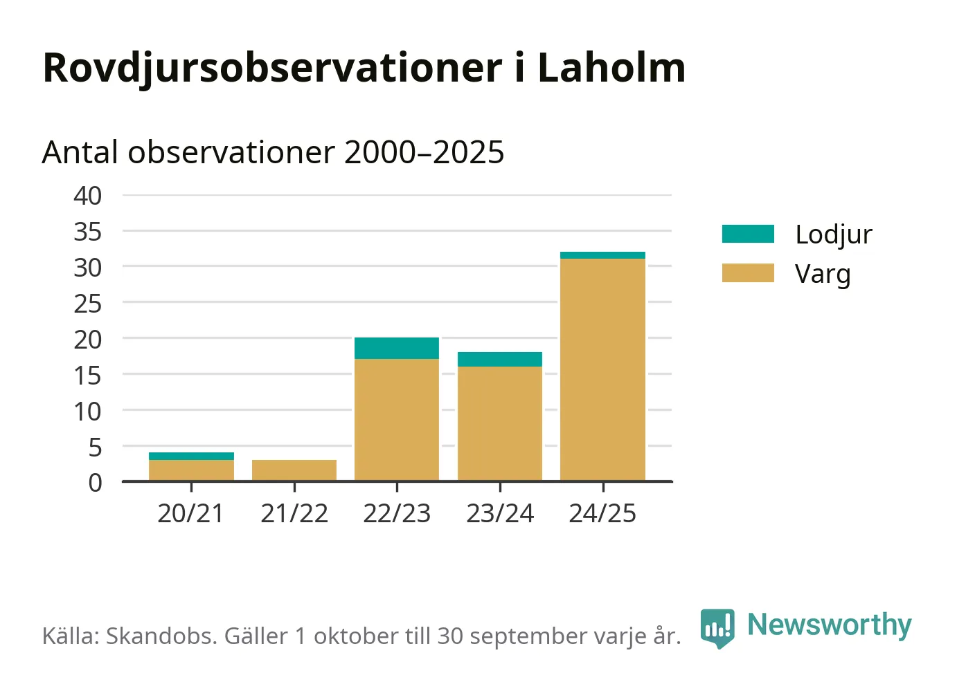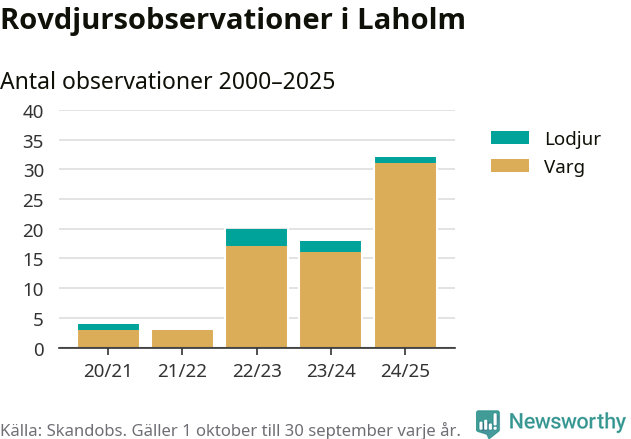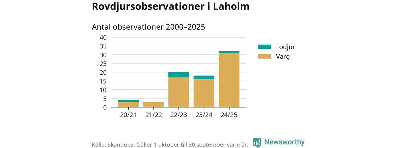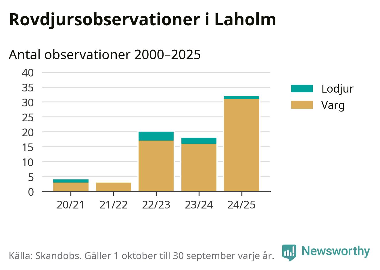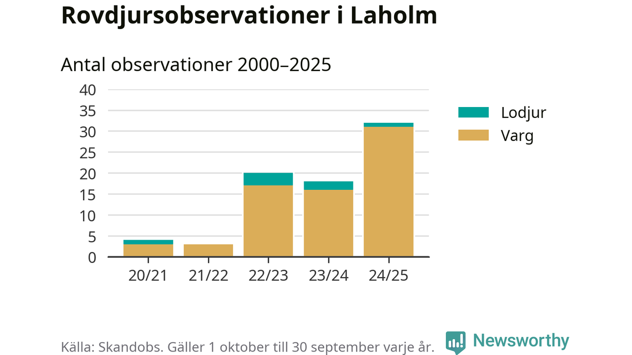 Där kan vem som helst rapportera sina observationer av de stora rovdjuren björn, varg, lodjur och järv. Mellan 1 oktober 2024 och 30 september i år har knappt 10 000 observationer registrerats i landet. Det kan vara synobservationer, foton, spår, spillning, döda bytesdjur eller andra tecken på rovdjursförekomst. I Laholm handlar det om totalt 32 observationer av varg eller lodjur.