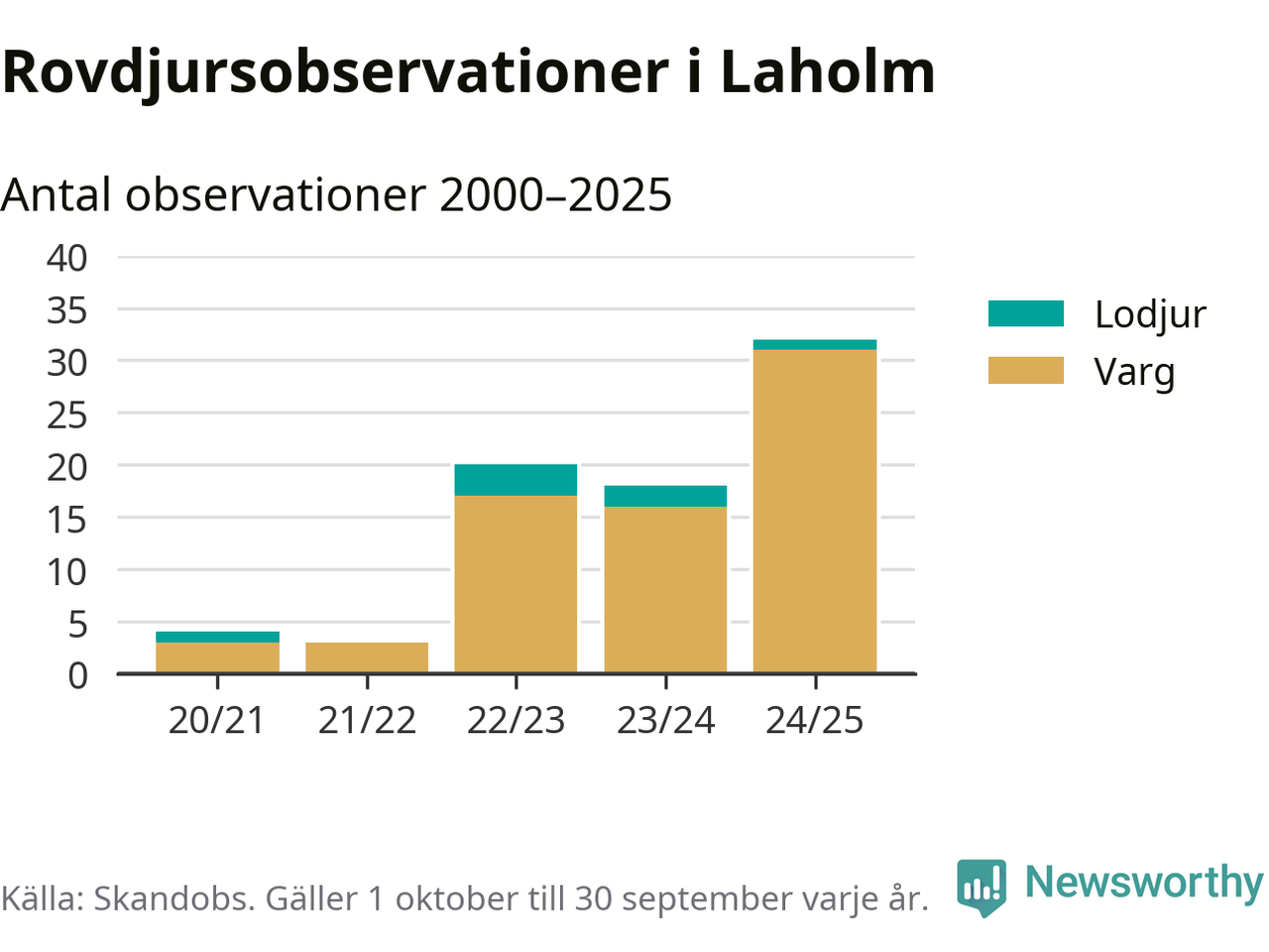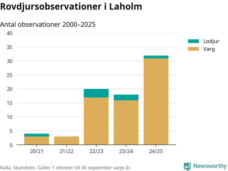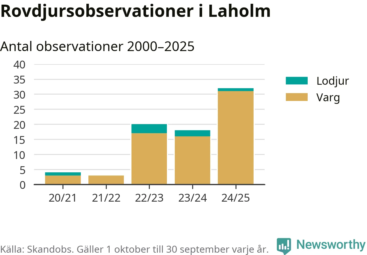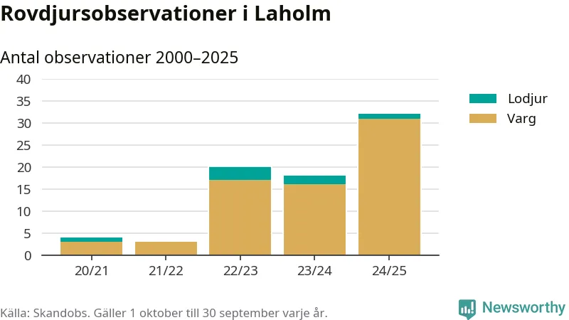 Där kan vem som helst rapportera sina observationer av de stora rovdjuren björn, varg, lodjur och järv. Mellan 1 oktober 2024 och 30 september i år har knappt 10 000 observationer registrerats i landet. Det kan vara synobservationer, foton, spår, spillning, döda bytesdjur eller andra tecken på rovdjursförekomst. I Laholm handlar det om totalt 32 observationer av varg eller lodjur.