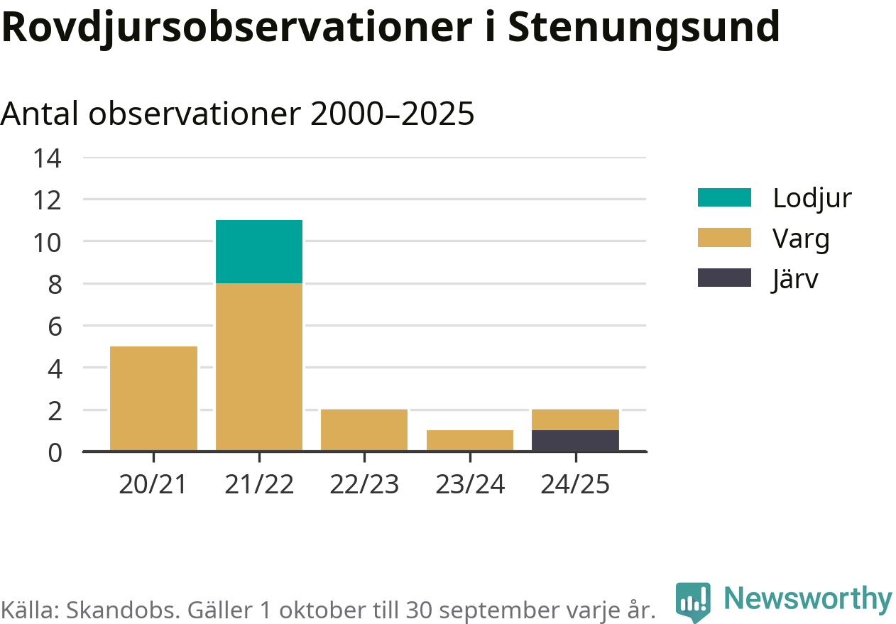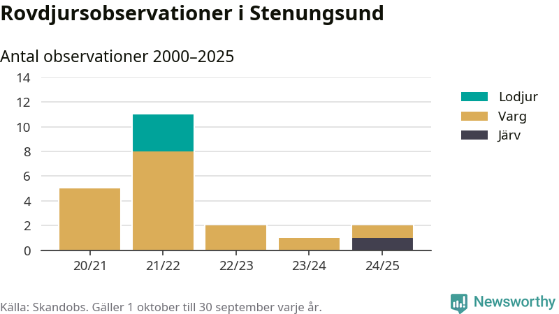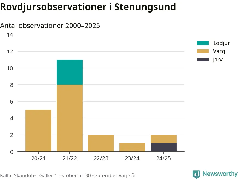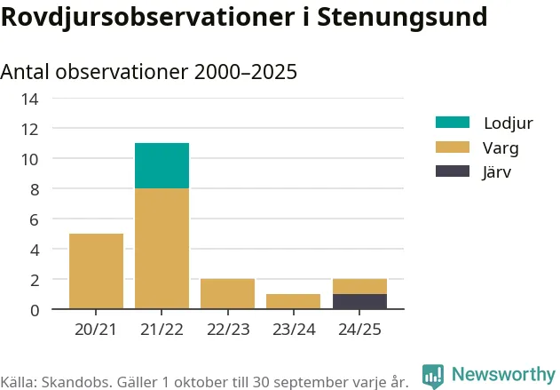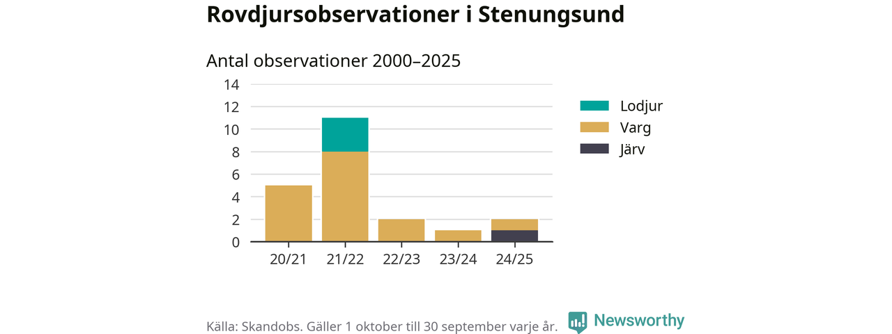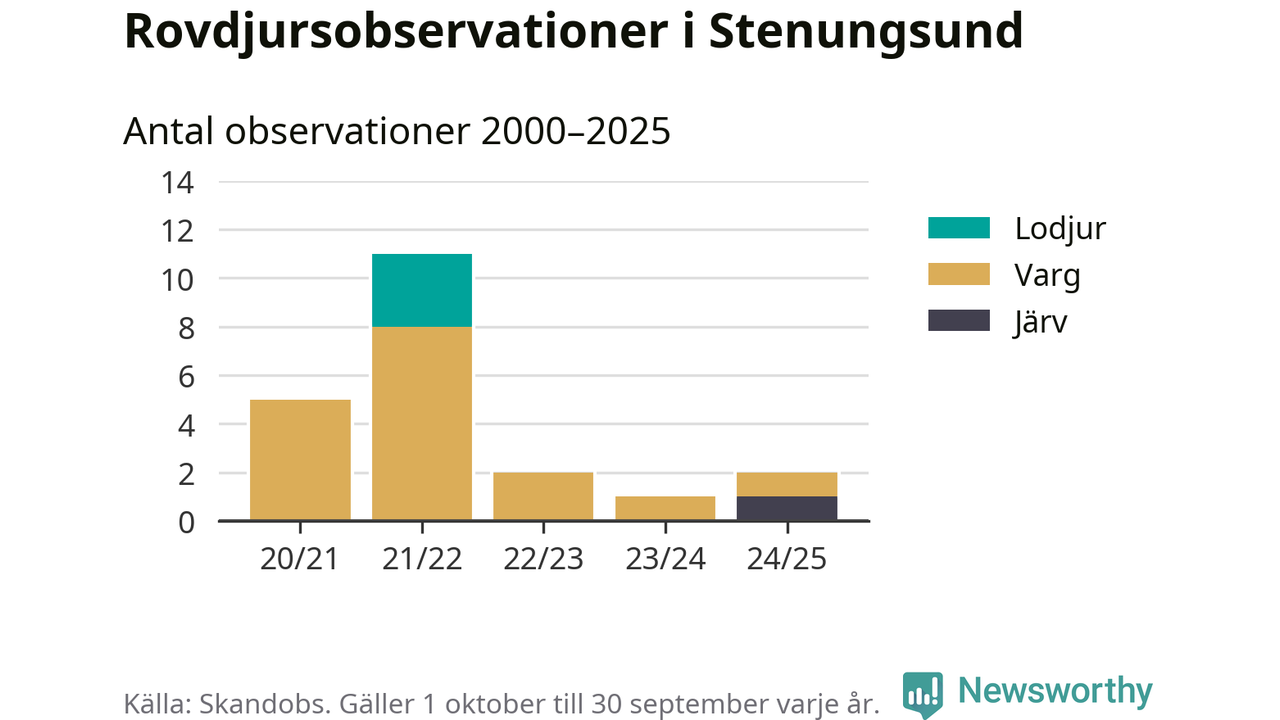Järvobservationen i september 2025 – som inte har kunnat bekräftas av länsstyrelsen – är den första i Stenungsund på åtminstone fem år. Sedan slutet av år 2020 finns även 16 rapporter om varg och tre rapporter om lodjur i Stenungsund.