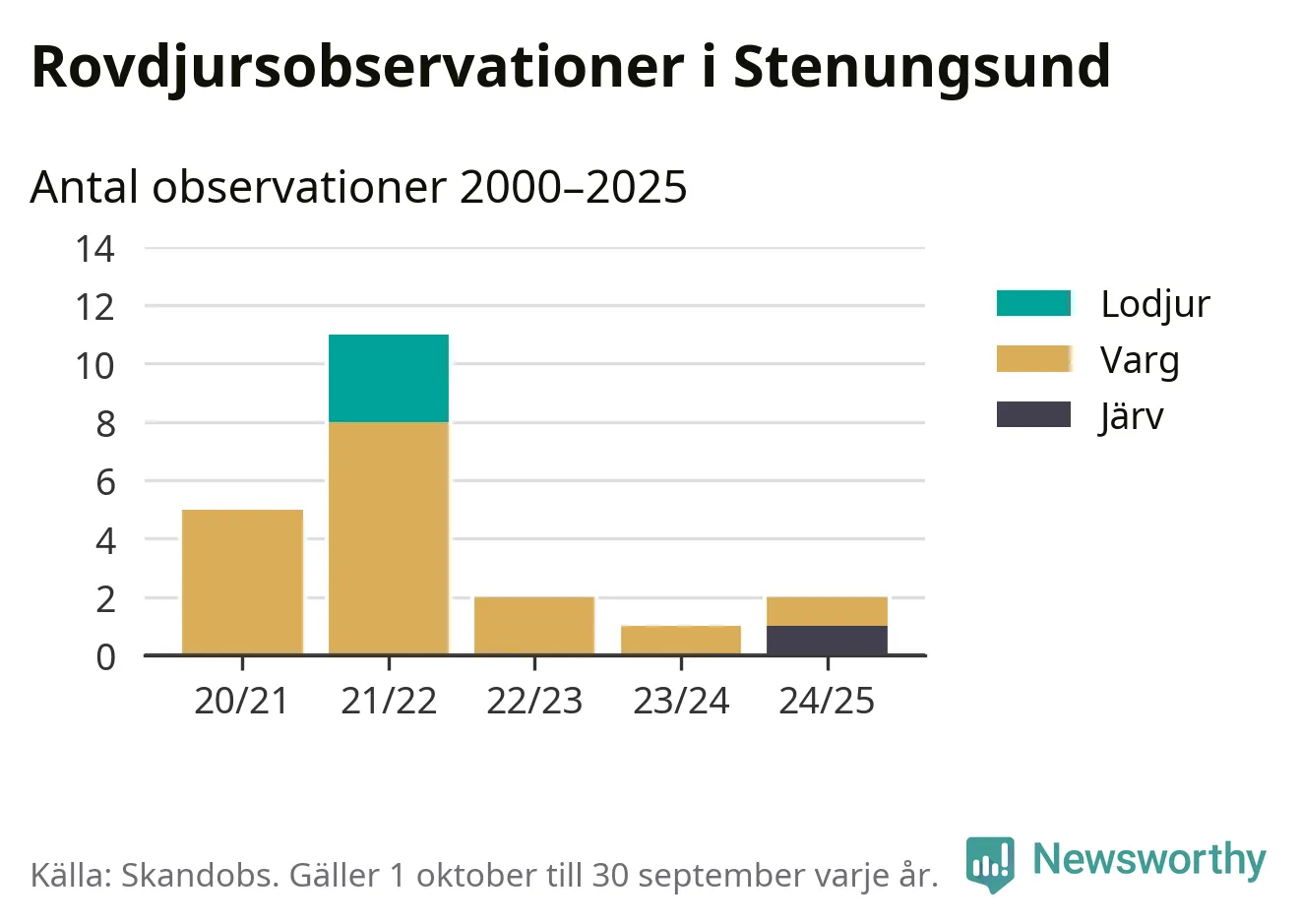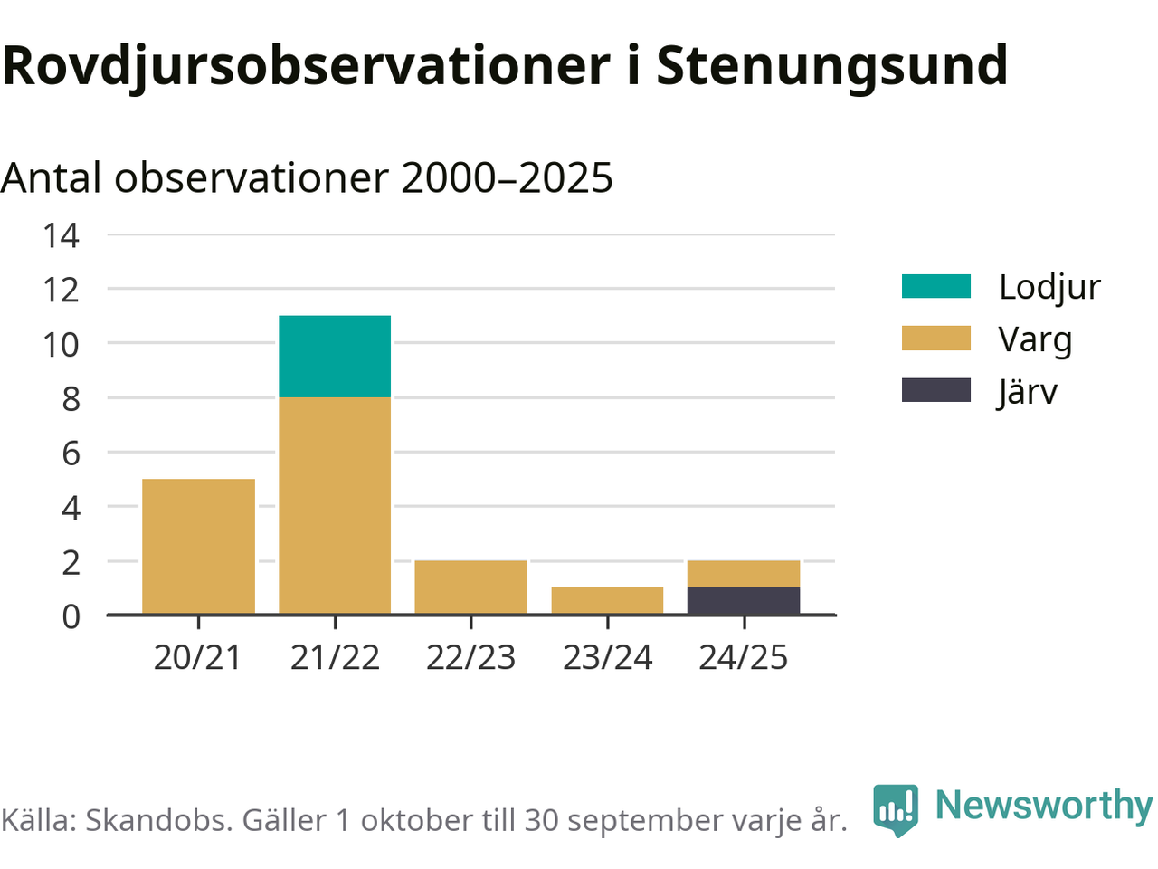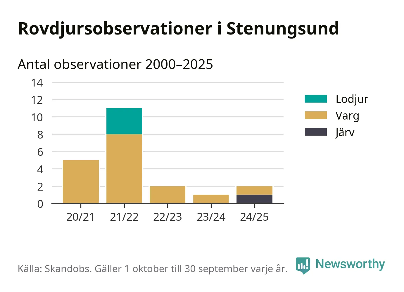 Järvobservationen i september 2025 – som inte har kunnat bekräftas av länsstyrelsen – är den första i Stenungsund på åtminstone fem år. Sedan slutet av år 2020 finns även 16 rapporter om varg och tre rapporter om lodjur i Stenungsund.