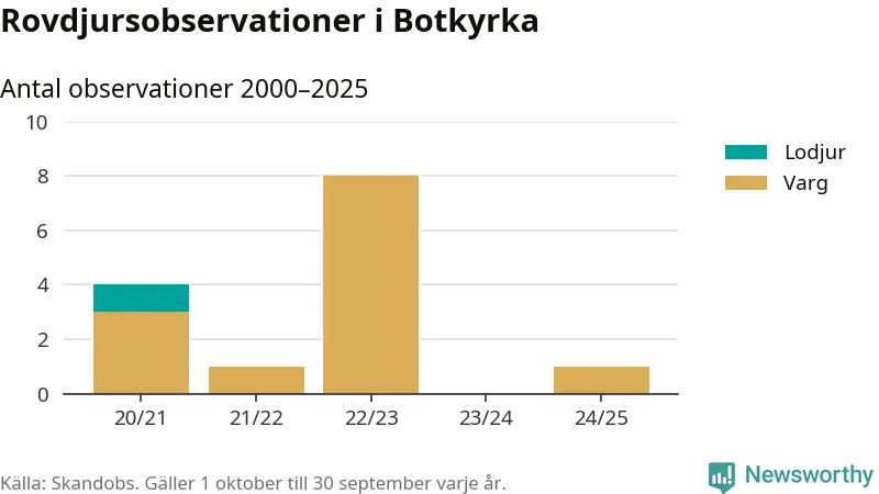 Den 10 januari i år säger sig någon ha sett en varg i Botkyrka. Det är den enda observationen av arten i kommunen, som finns registrerad i den skandinaviska rovdjursdatabasen Skandobs under det senaste året