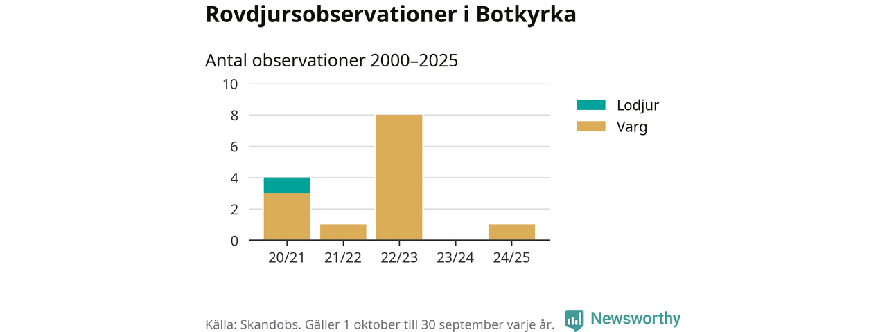 Vargobservationen i januari 2025 – som inte har kunnat bekräftas av länsstyrelsen – är den enda i Botkyrka under det senaste året, även om tidigare under 2020-talet rapporterats tolv observationer. Sedan slutet av år 2020 finns även en rapport om lodjur i Botkyrka.