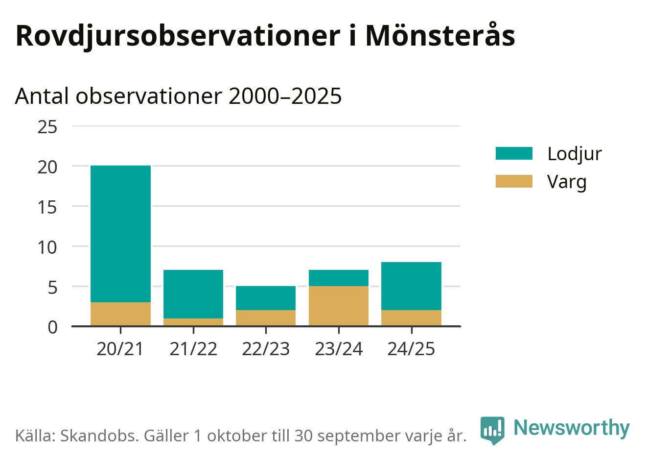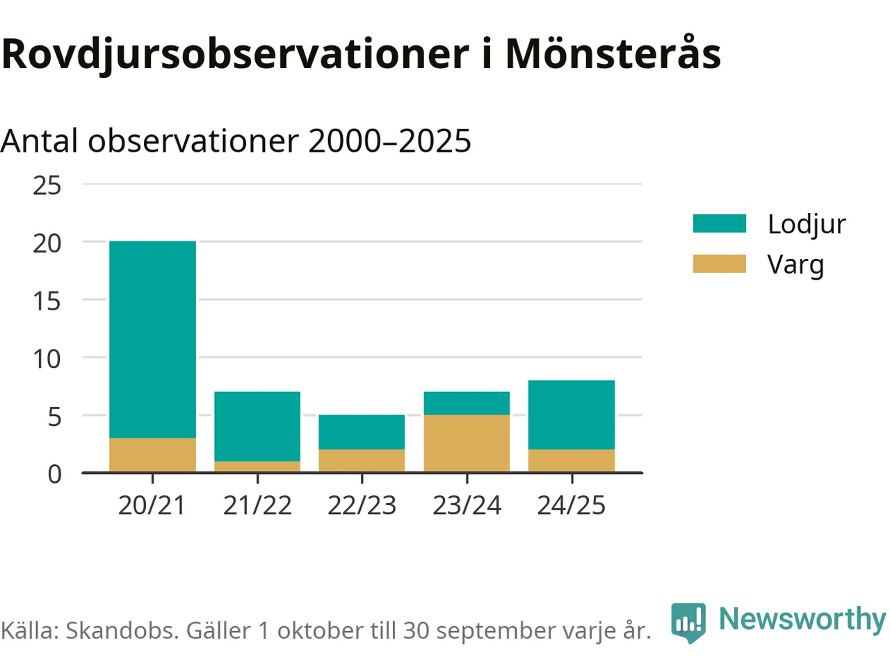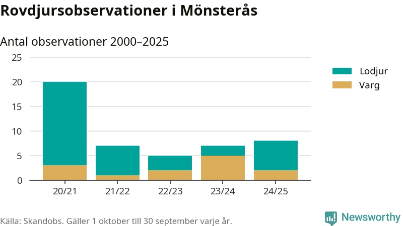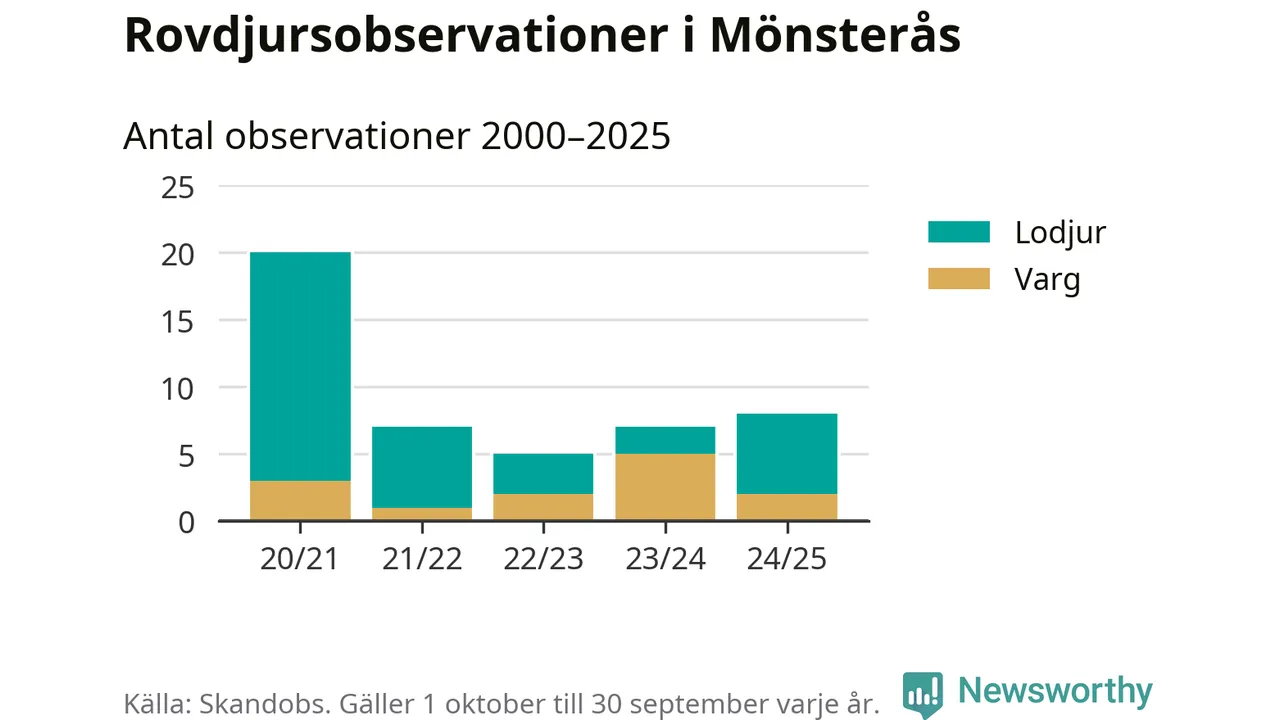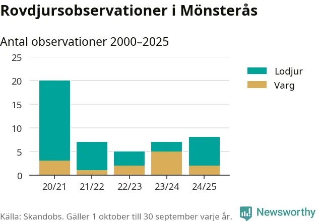 Där kan vem som helst rapportera sina observationer av de stora rovdjuren björn, varg, lodjur och järv. Mellan 1 oktober 2024 och 30 september i år har knappt 10 000 observationer registrerats i landet. Det kan vara synobservationer, foton, spår, spillning, döda bytesdjur eller andra tecken på rovdjursförekomst. I Mönsterås handlar det om totalt åtta observationer av lodjur eller varg.