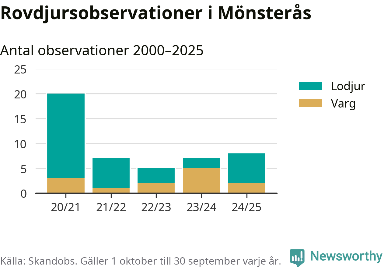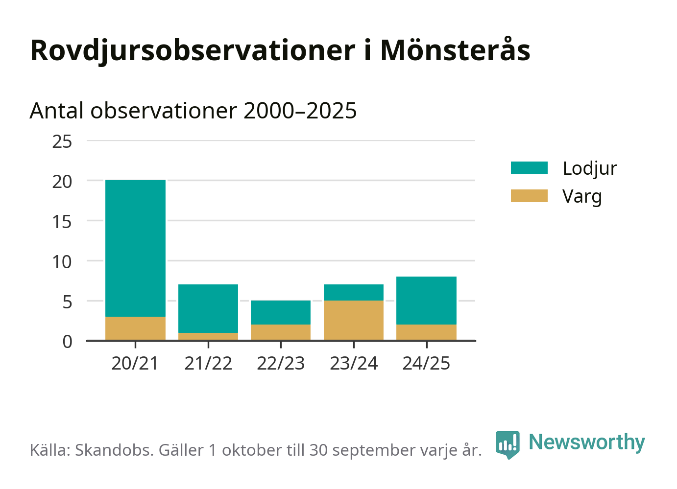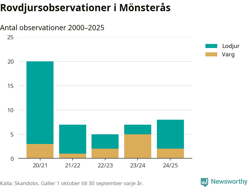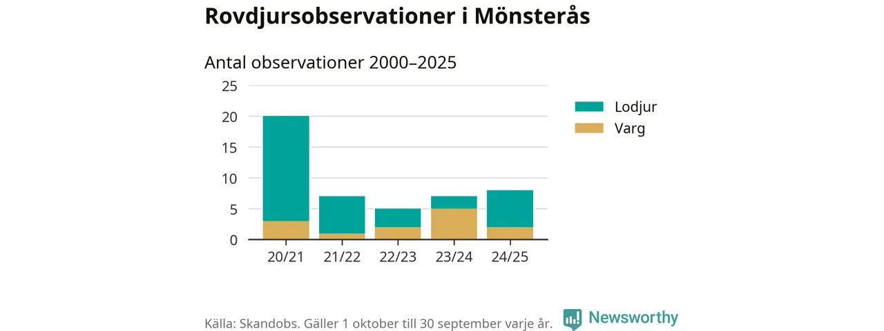 Där kan vem som helst rapportera sina observationer av de stora rovdjuren björn, varg, lodjur och järv. Mellan 1 oktober 2024 och 30 september i år har knappt 10 000 observationer registrerats i landet. Det kan vara synobservationer, foton, spår, spillning, döda bytesdjur eller andra tecken på rovdjursförekomst. I Mönsterås handlar det om totalt åtta observationer av lodjur eller varg.