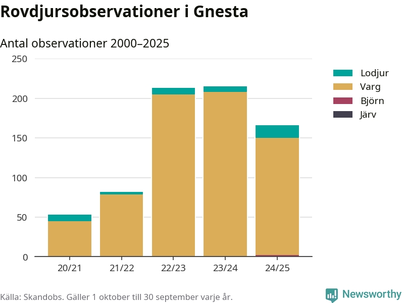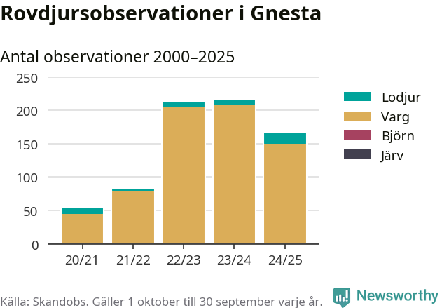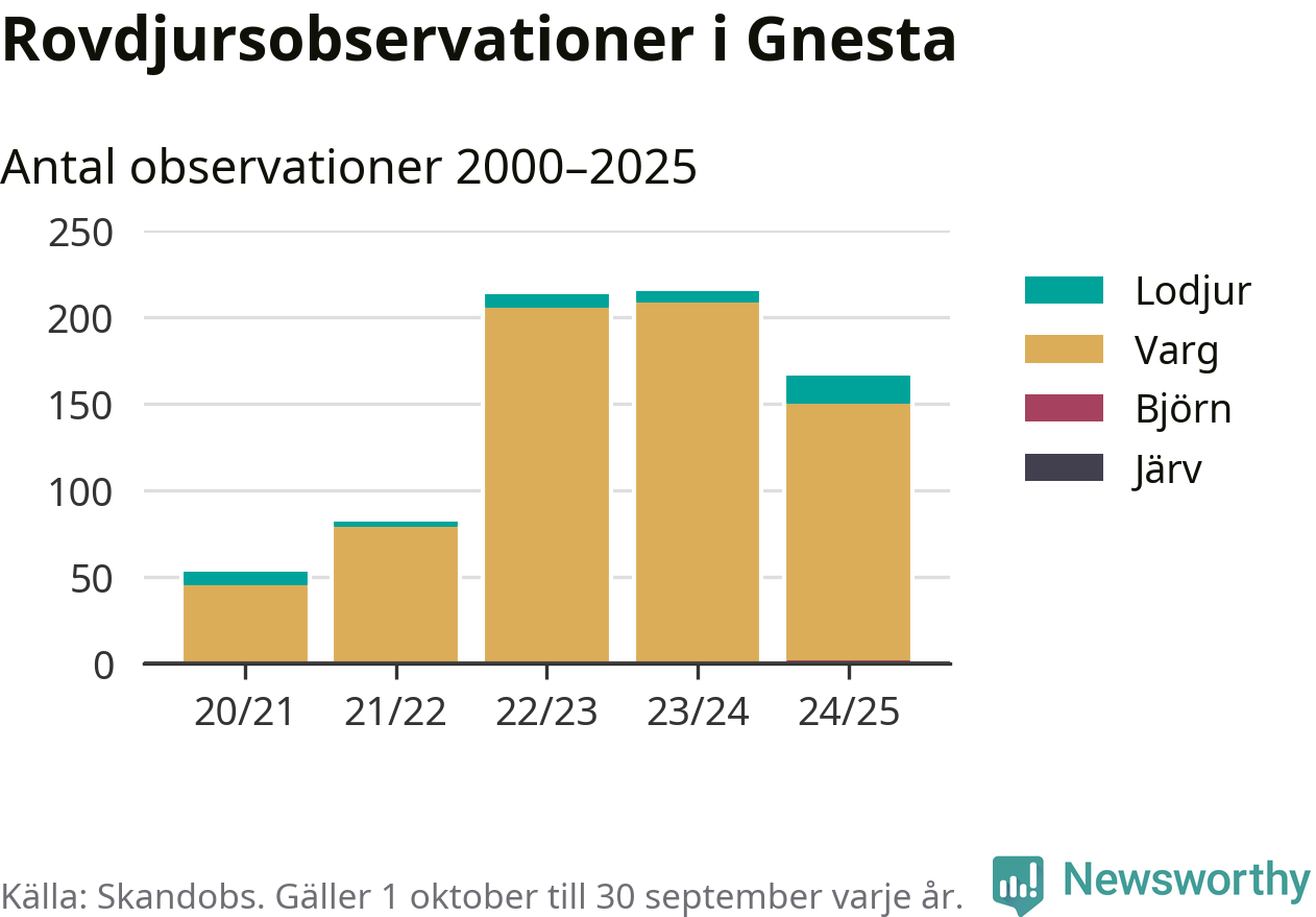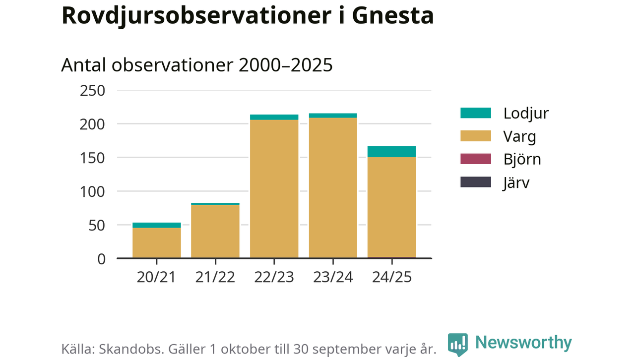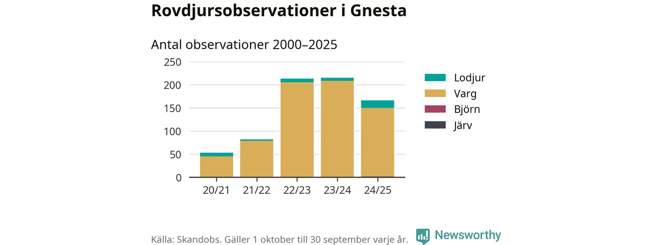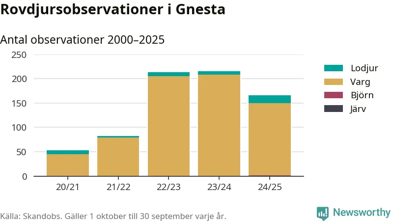 Där kan vem som helst rapportera sina observationer av de stora rovdjuren björn, varg, lodjur och järv. Mellan 1 oktober 2024 och 30 september i år har knappt 10 000 observationer registrerats i landet. Det kan vara synobservationer, foton, spår, spillning, döda bytesdjur eller andra tecken på rovdjursförekomst. I Gnesta finns totalt 166 rapporter, om alla fyra rovdjur.