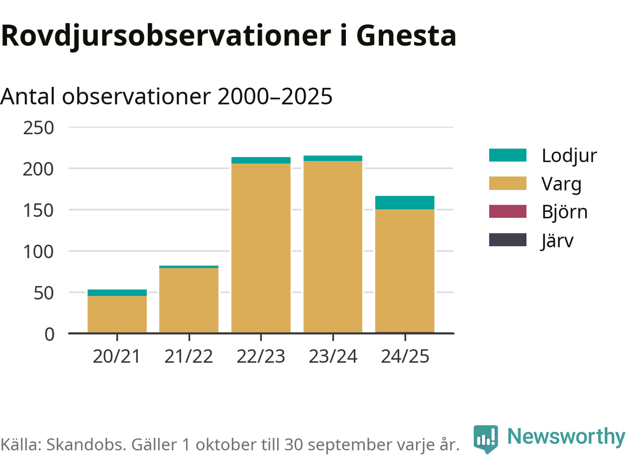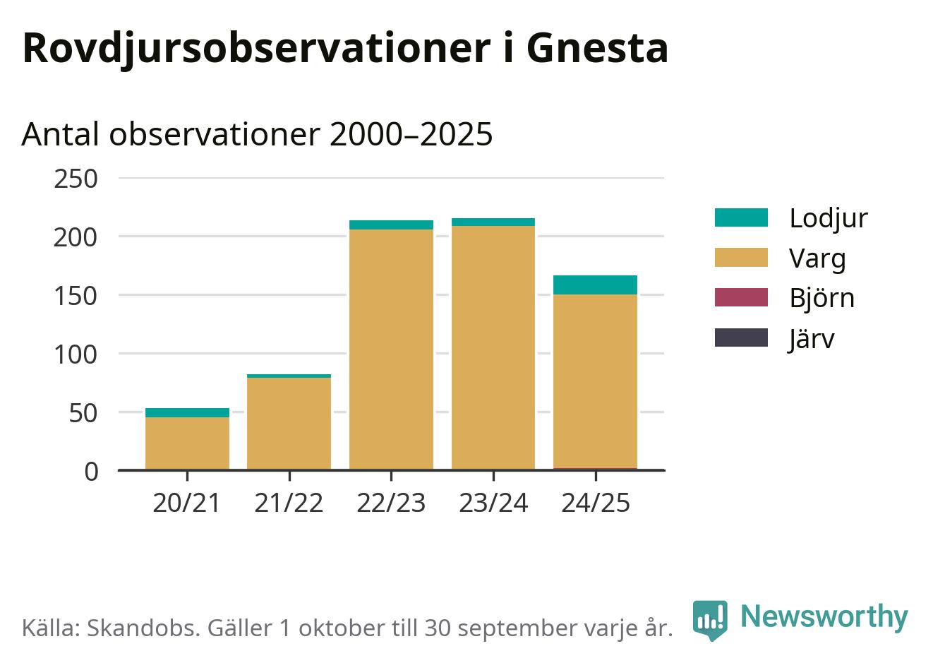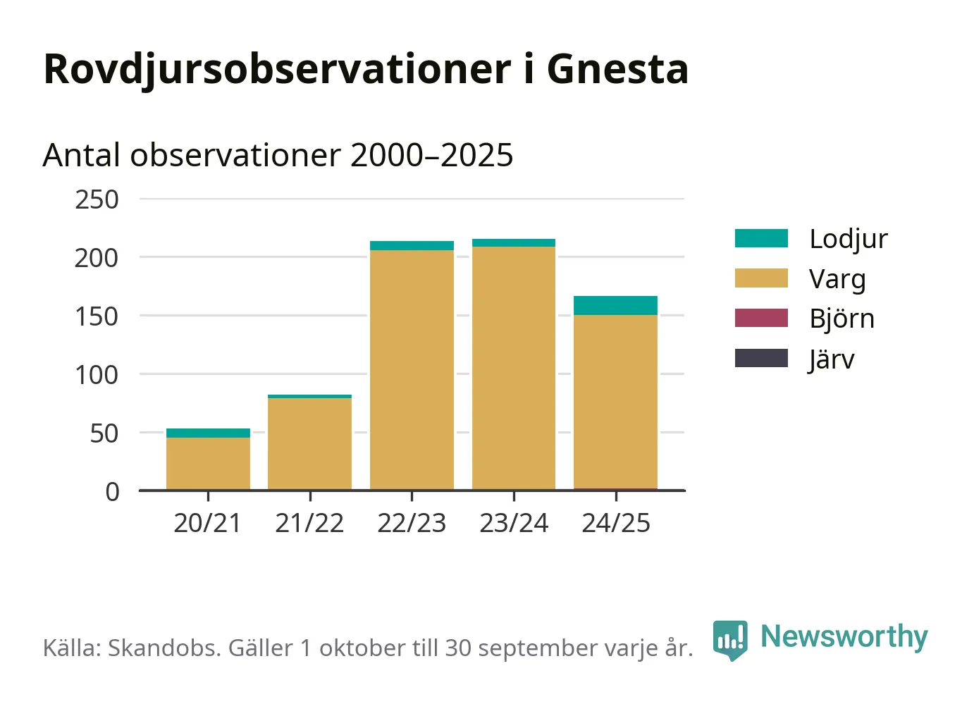 Där kan vem som helst rapportera sina observationer av de stora rovdjuren björn, varg, lodjur och järv. Mellan 1 oktober 2024 och 30 september i år har knappt 10 000 observationer registrerats i landet. Det kan vara synobservationer, foton, spår, spillning, döda bytesdjur eller andra tecken på rovdjursförekomst. I Gnesta finns totalt 166 rapporter, om alla fyra rovdjur.