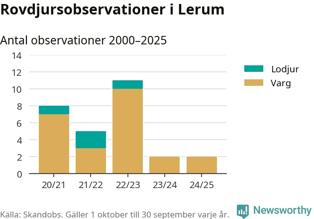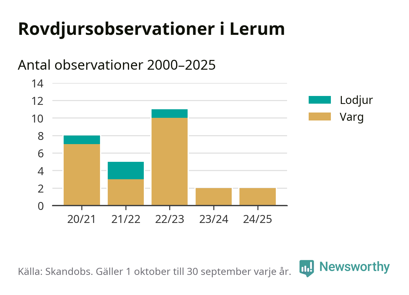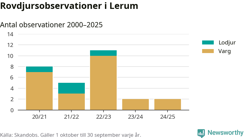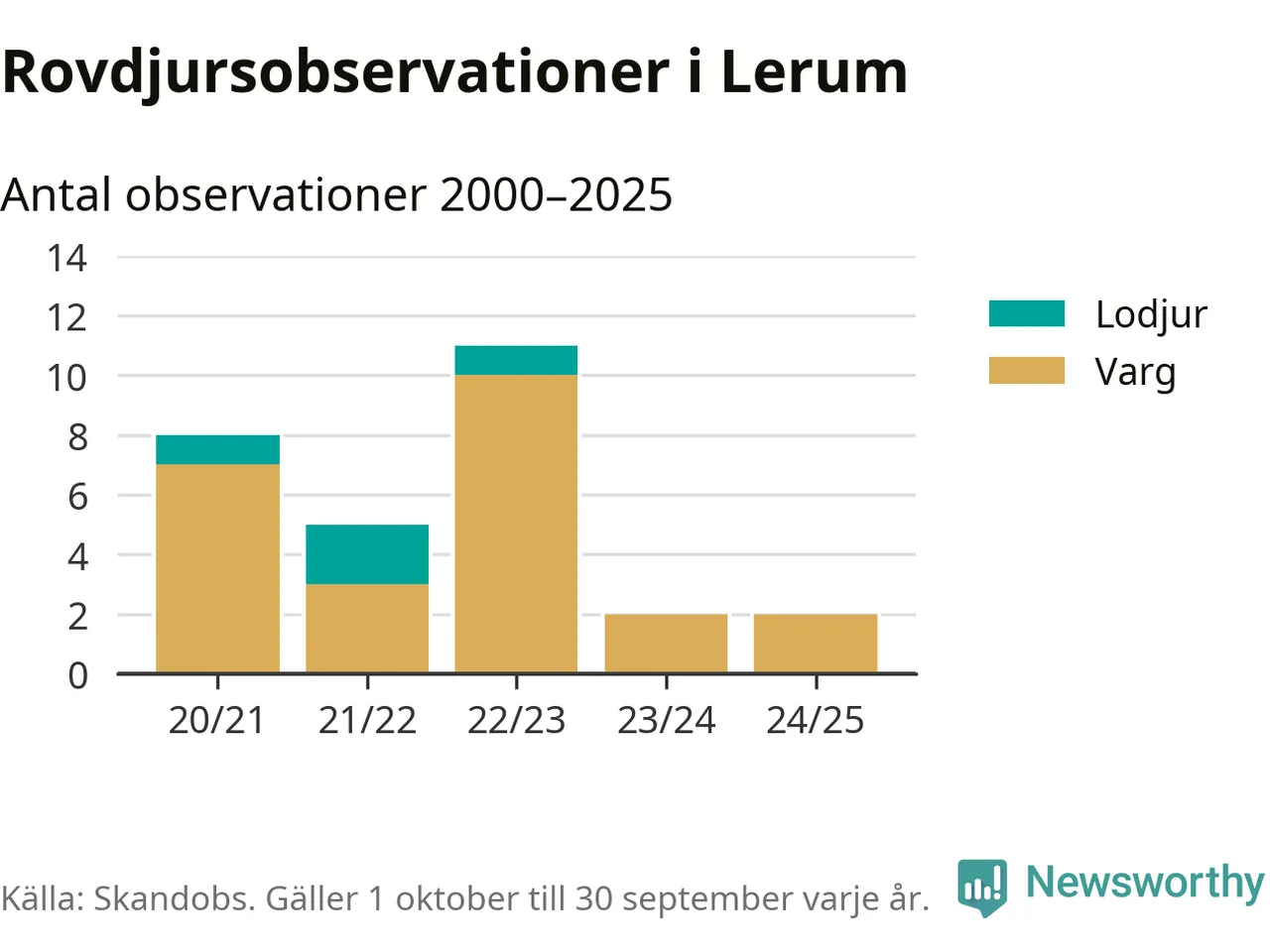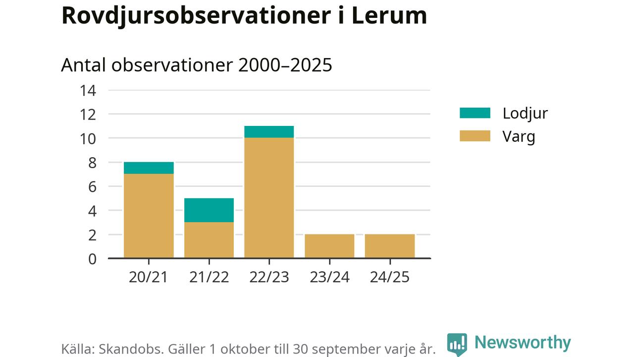 Där kan vem som helst rapportera sina observationer av de stora rovdjuren björn, varg, lodjur och järv. Mellan 1 oktober 2024 och 30 september i år har knappt 10 000 observationer registrerats i landet. Det kan vara synobservationer, foton, spår, spillning, döda bytesdjur eller andra tecken på rovdjursförekomst. I Lerum handlar det om totalt två observationer av varg.