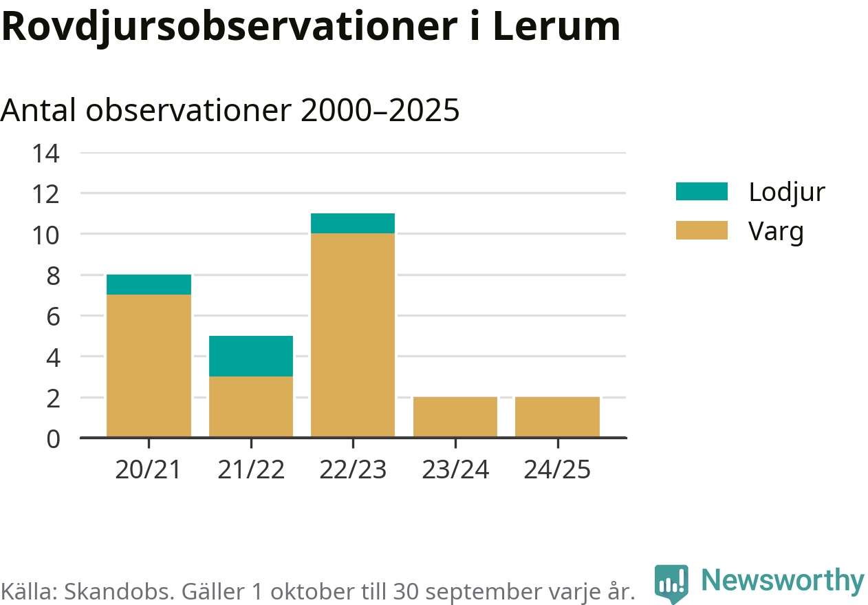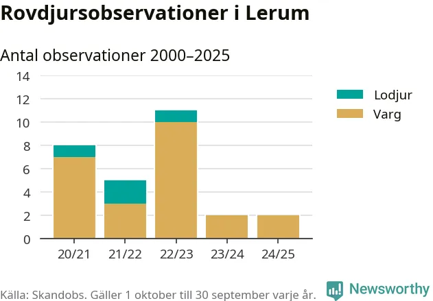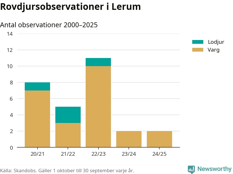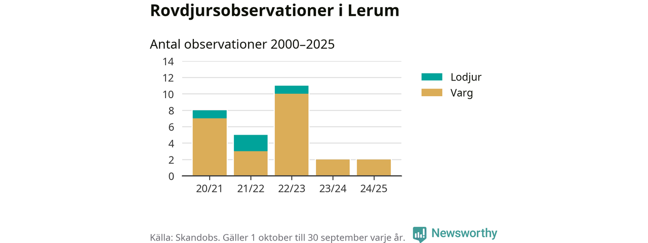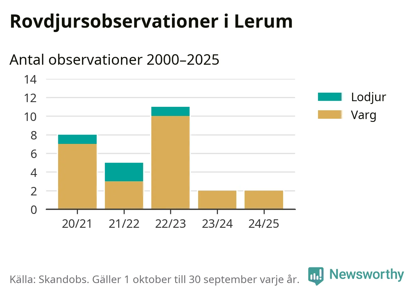 Där kan vem som helst rapportera sina observationer av de stora rovdjuren björn, varg, lodjur och järv. Mellan 1 oktober 2024 och 30 september i år har knappt 10 000 observationer registrerats i landet. Det kan vara synobservationer, foton, spår, spillning, döda bytesdjur eller andra tecken på rovdjursförekomst. I Lerum handlar det om totalt två observationer av varg.