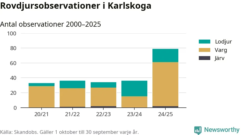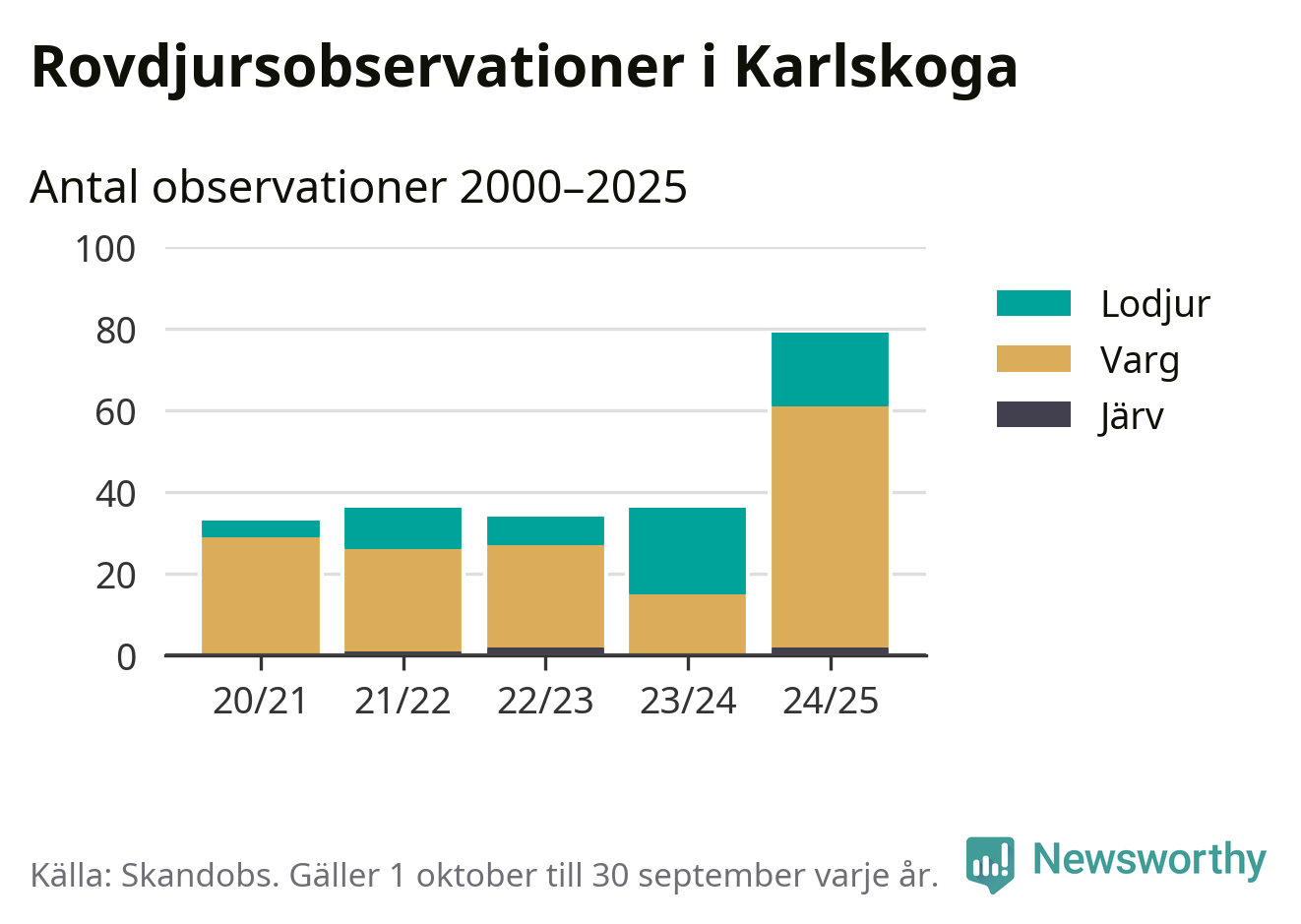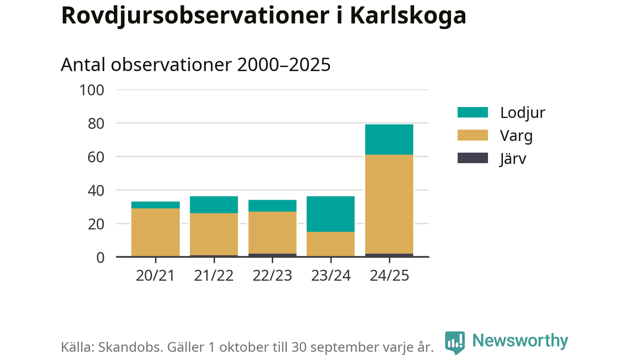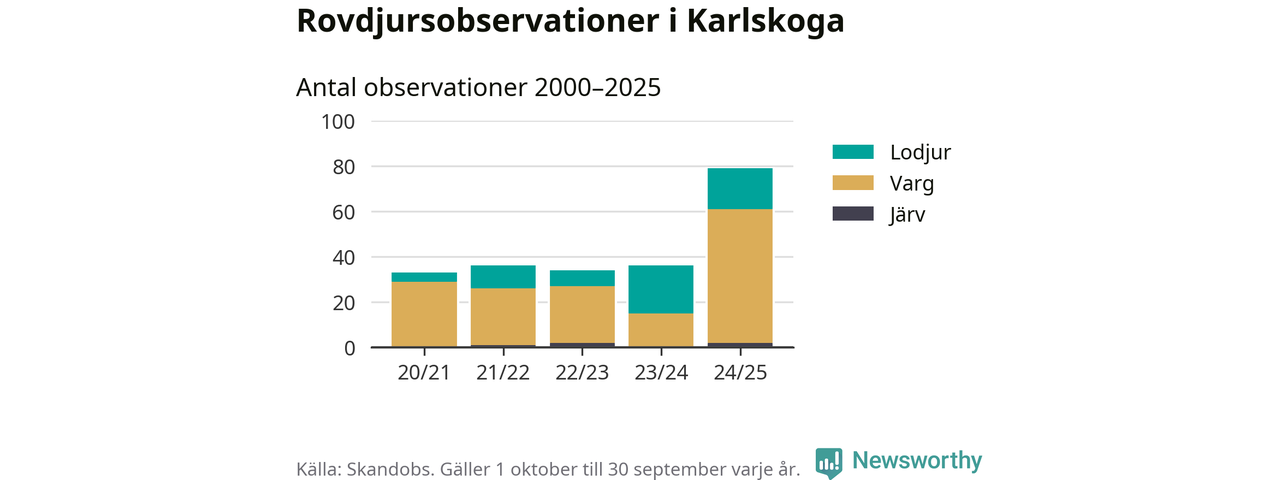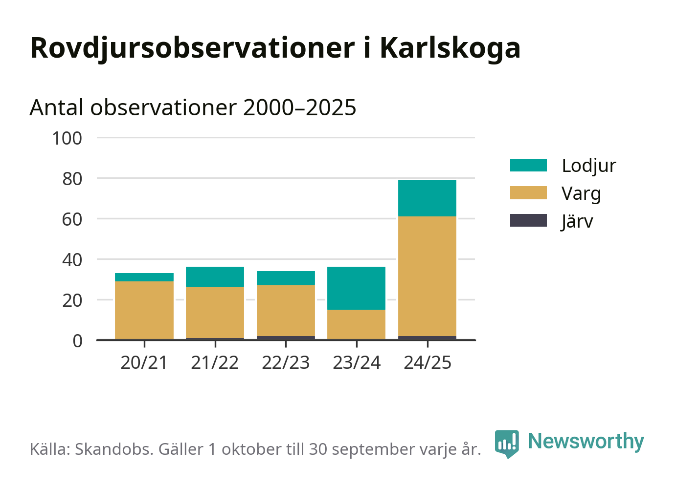 Där kan vem som helst rapportera sina observationer av de stora rovdjuren björn, varg, lodjur och järv. Mellan 1 oktober 2024 och 30 september i år har knappt 10 000 observationer registrerats i landet. Det kan vara synobservationer, foton, spår, spillning, döda bytesdjur eller andra tecken på rovdjursförekomst. I Karlskoga handlar det om totalt 79 observationer av varg, lodjur eller järv.