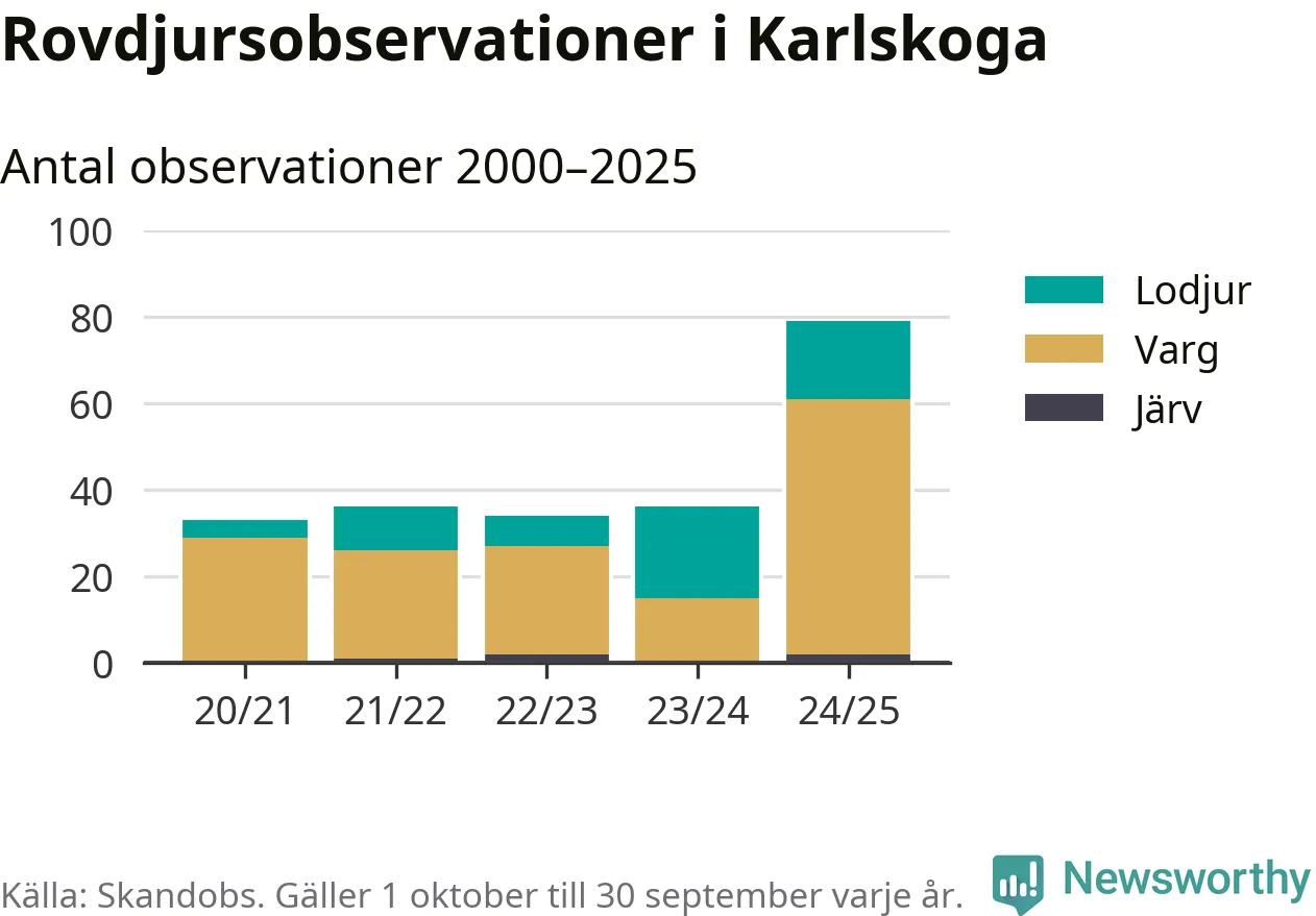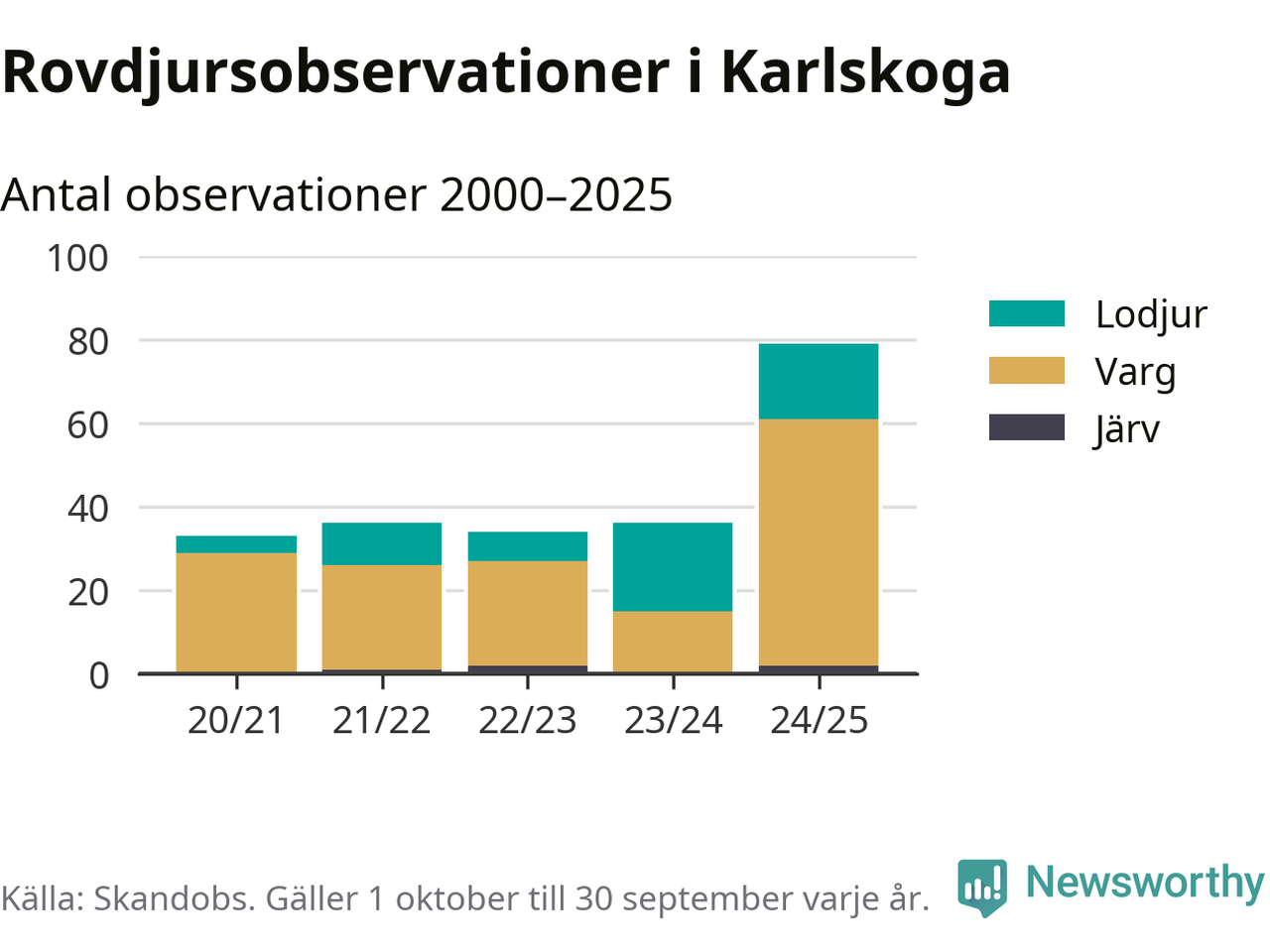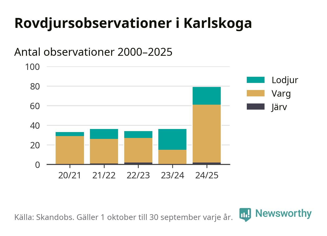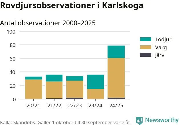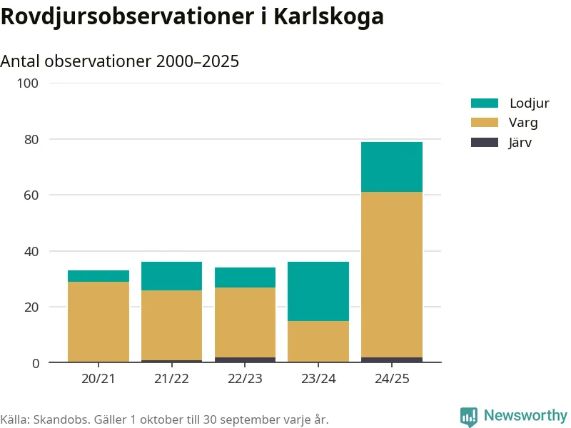 Där kan vem som helst rapportera sina observationer av de stora rovdjuren björn, varg, lodjur och järv. Mellan 1 oktober 2024 och 30 september i år har knappt 10 000 observationer registrerats i landet. Det kan vara synobservationer, foton, spår, spillning, döda bytesdjur eller andra tecken på rovdjursförekomst. I Karlskoga handlar det om totalt 79 observationer av varg, lodjur eller järv.