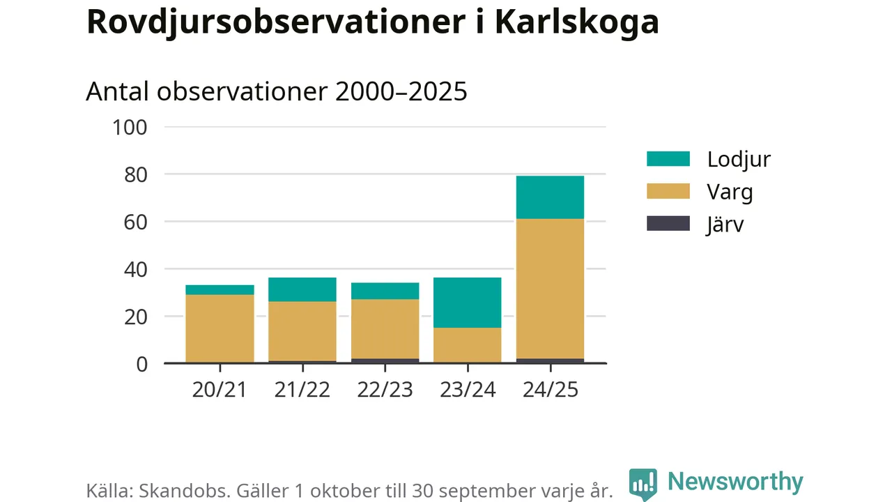 Antalet observationer av varg har fyrdubblats i Karlskoga jämfört med året innan. Det visar Newsworthys genomgång av rovdjursdatabasen Skandobs. Härifrån kommer rapporterna.