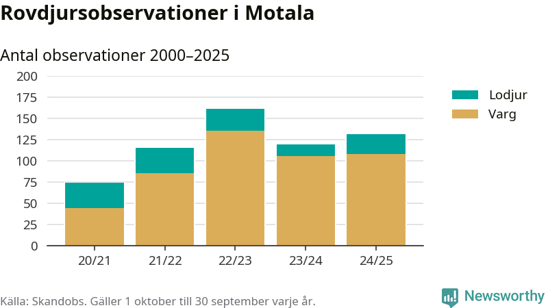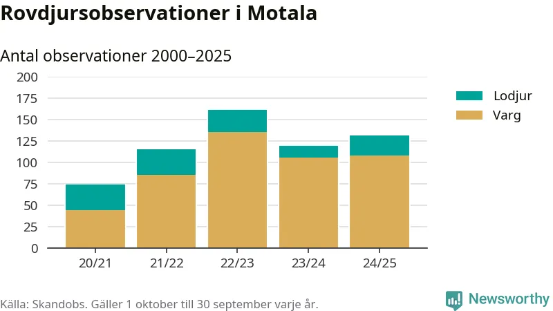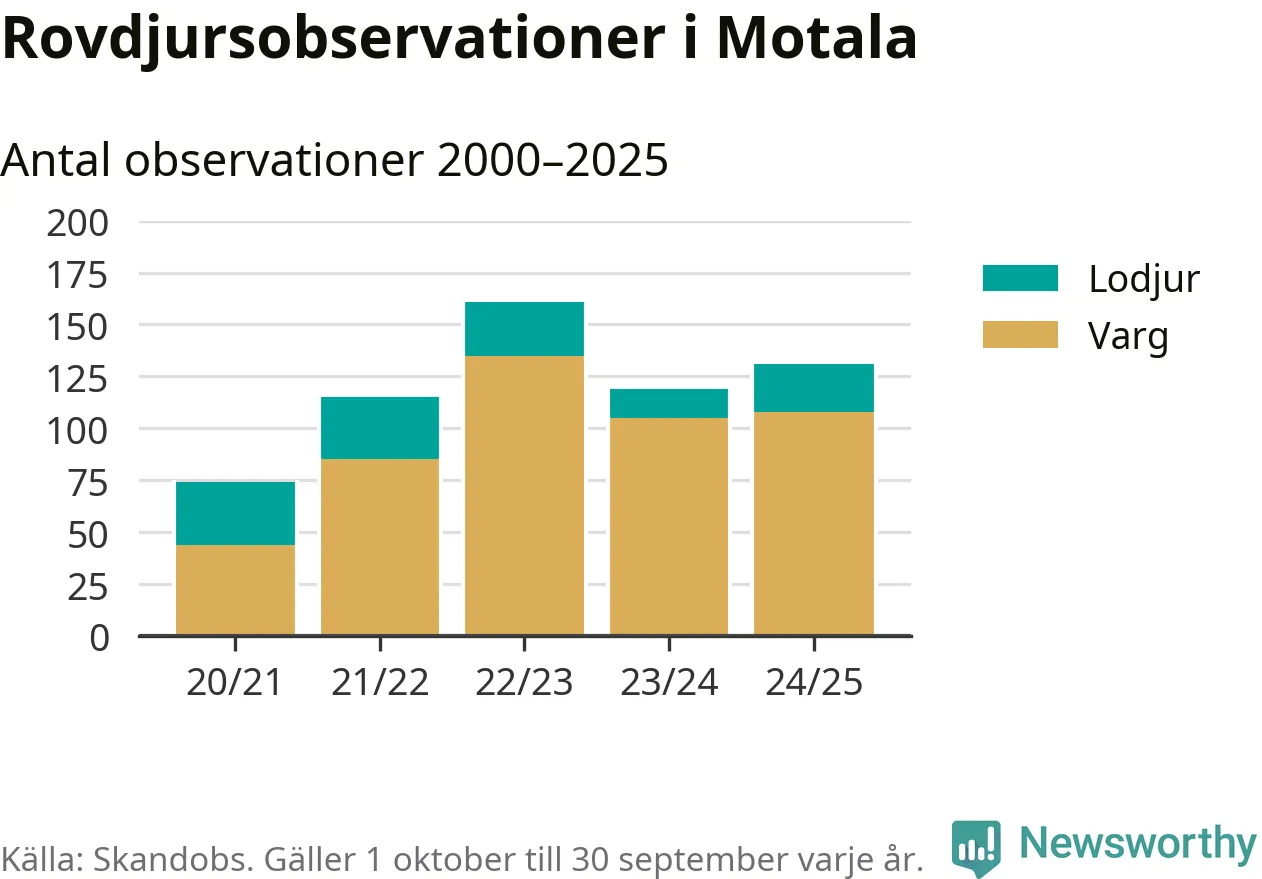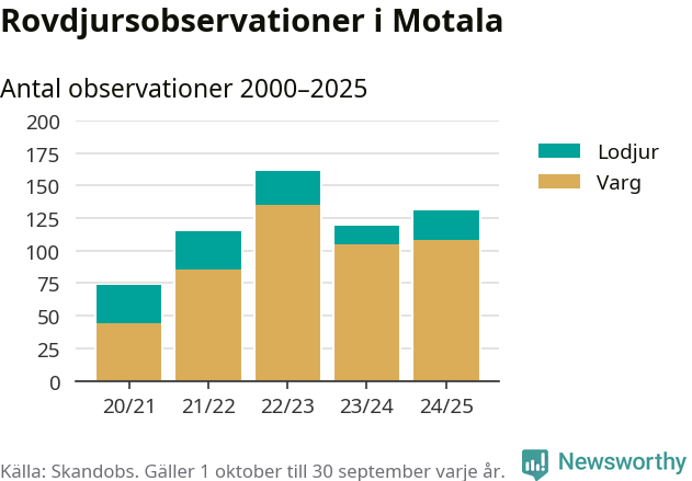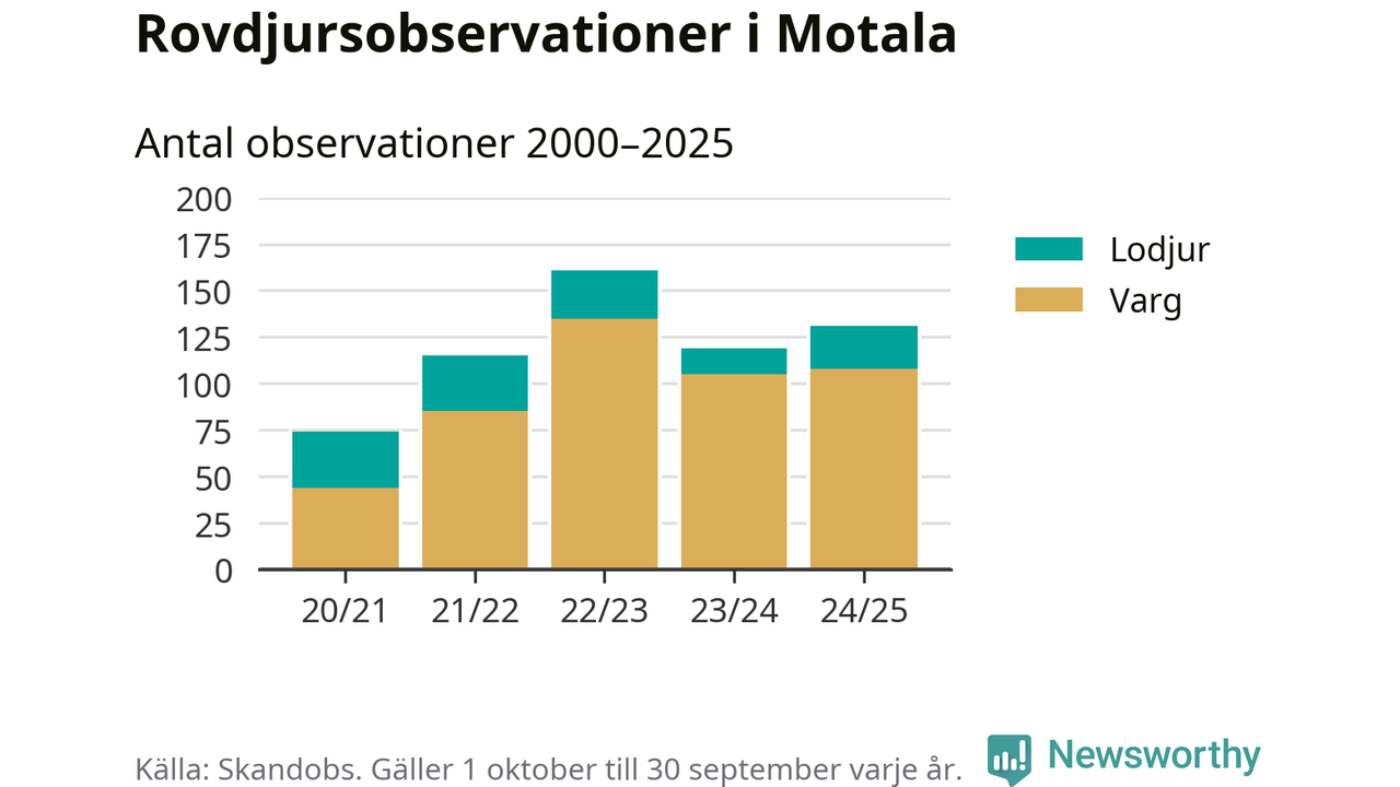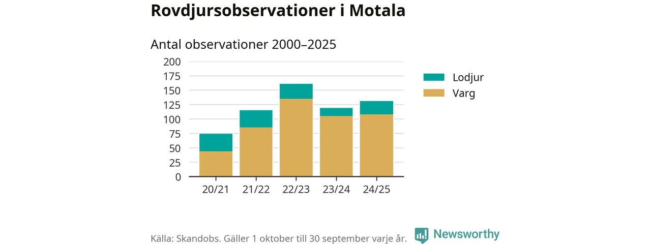 Där kan vem som helst rapportera sina observationer av de stora rovdjuren björn, varg, lodjur och järv. Mellan 1 oktober 2024 och 30 september i år har knappt 10 000 observationer registrerats i landet. Det kan vara synobservationer, foton, spår, spillning, döda bytesdjur eller andra tecken på rovdjursförekomst. I Motala handlar det om totalt 131 observationer av varg eller lodjur.