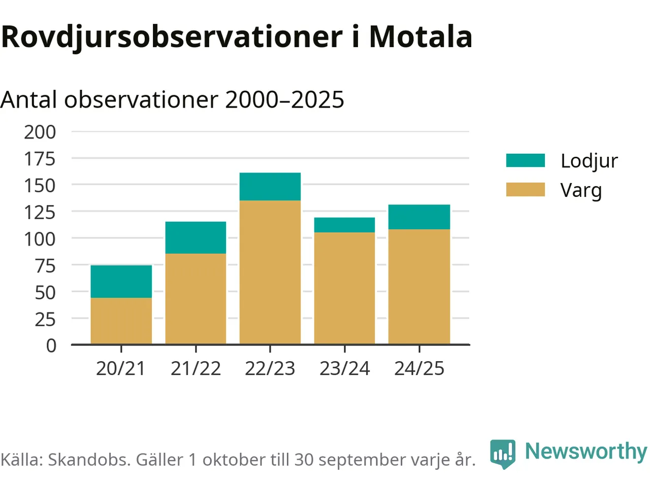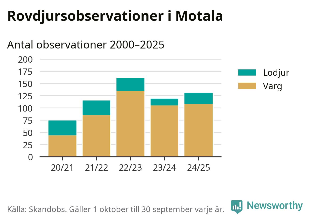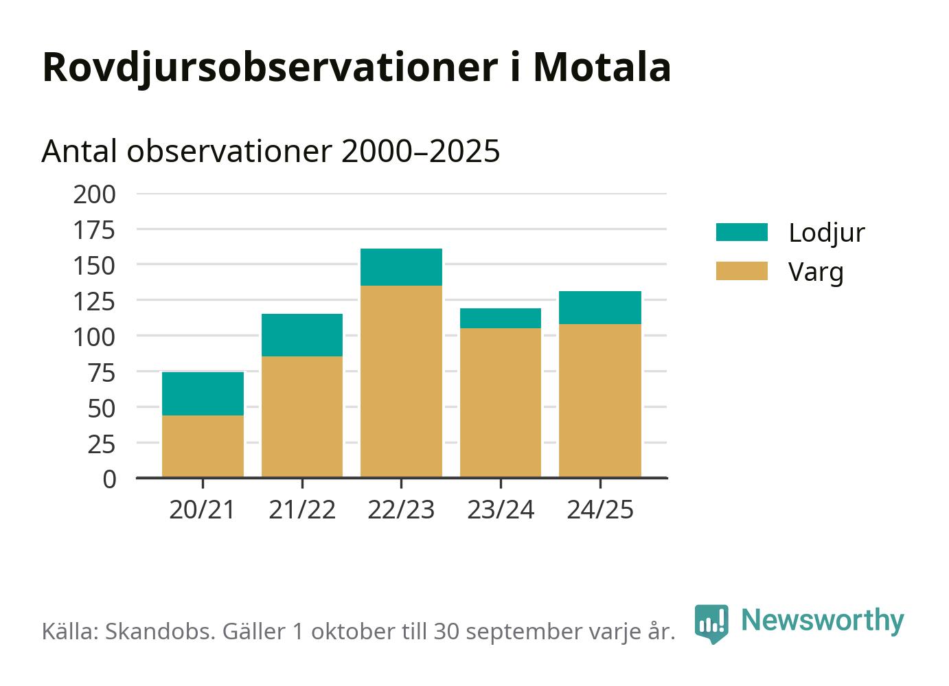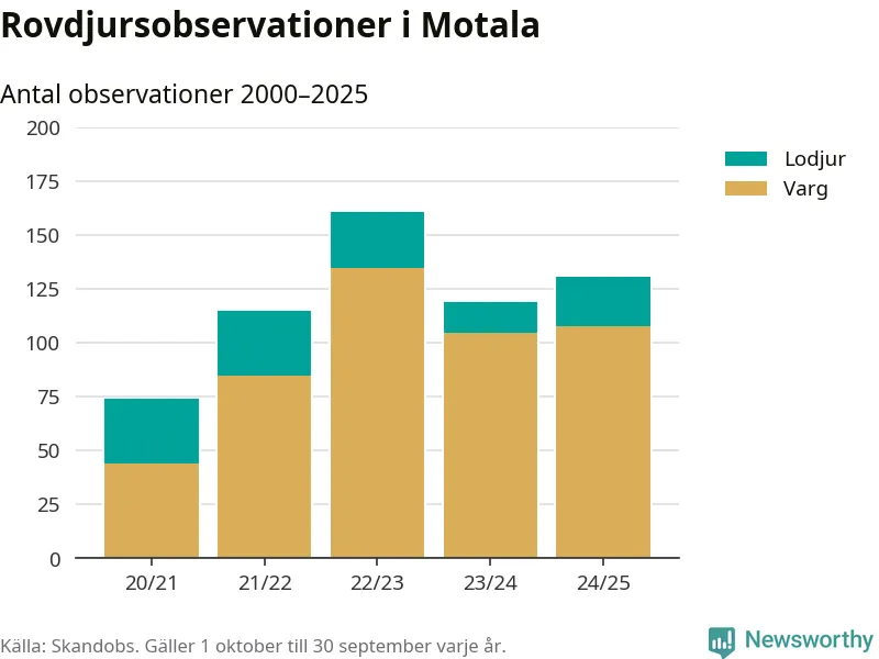 Där kan vem som helst rapportera sina observationer av de stora rovdjuren björn, varg, lodjur och järv. Mellan 1 oktober 2024 och 30 september i år har knappt 10 000 observationer registrerats i landet. Det kan vara synobservationer, foton, spår, spillning, döda bytesdjur eller andra tecken på rovdjursförekomst. I Motala handlar det om totalt 131 observationer av varg eller lodjur.