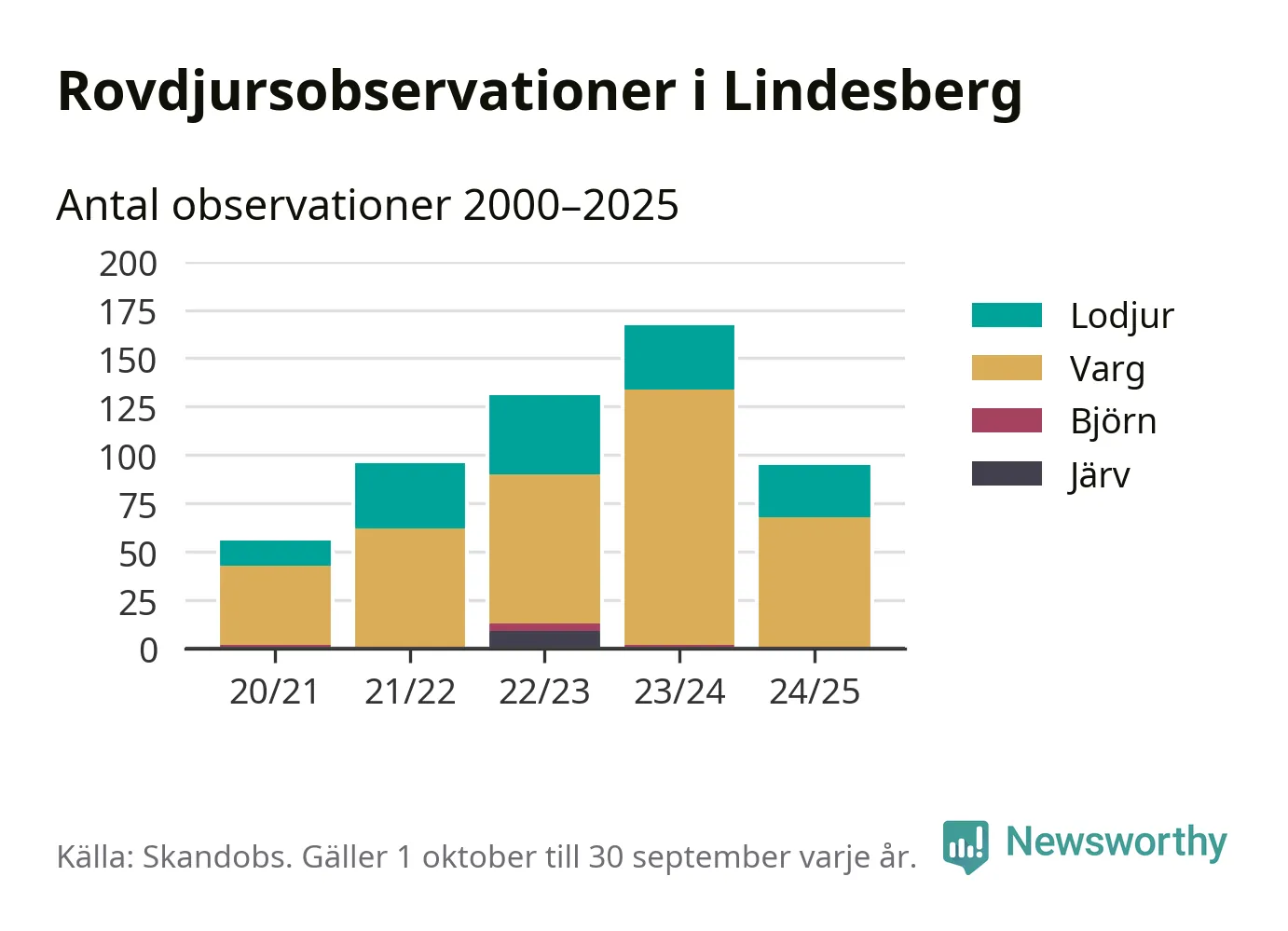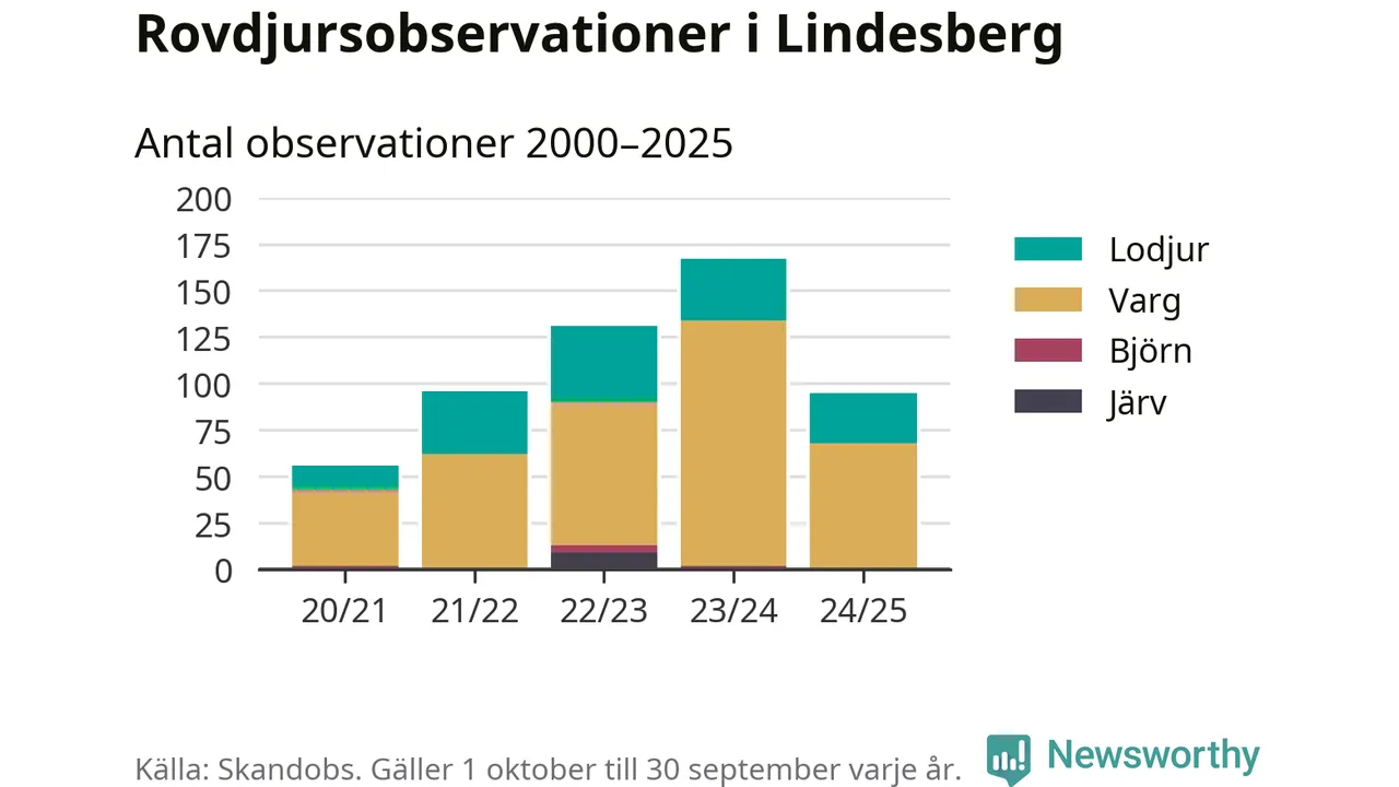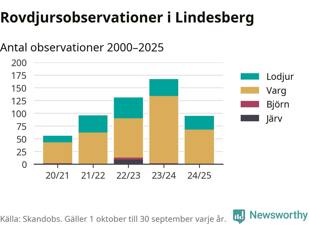 Där kan vem som helst rapportera sina observationer av de stora rovdjuren björn, varg, lodjur och järv. Mellan 1 oktober 2024 och 30 september i år har knappt 10 000 observationer registrerats i landet. Det kan vara synobservationer, foton, spår, spillning, döda bytesdjur eller andra tecken på rovdjursförekomst. I Lindesberg handlar det om totalt 95 observationer av varg eller lodjur.