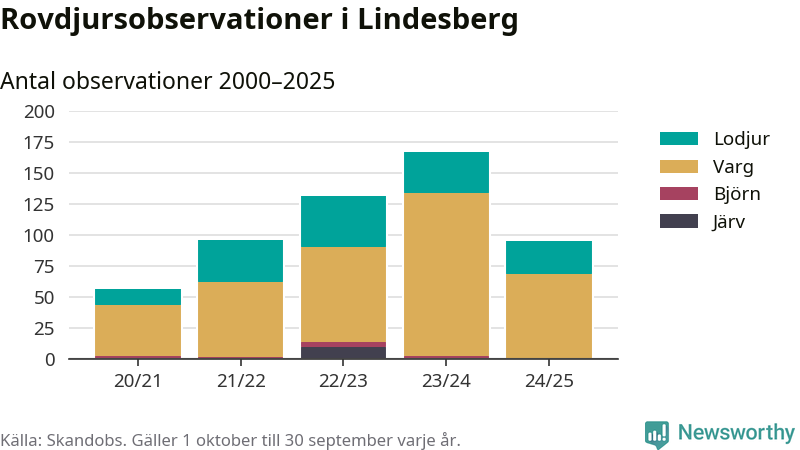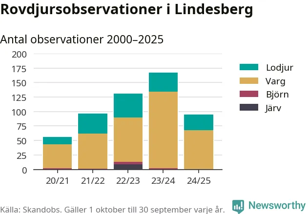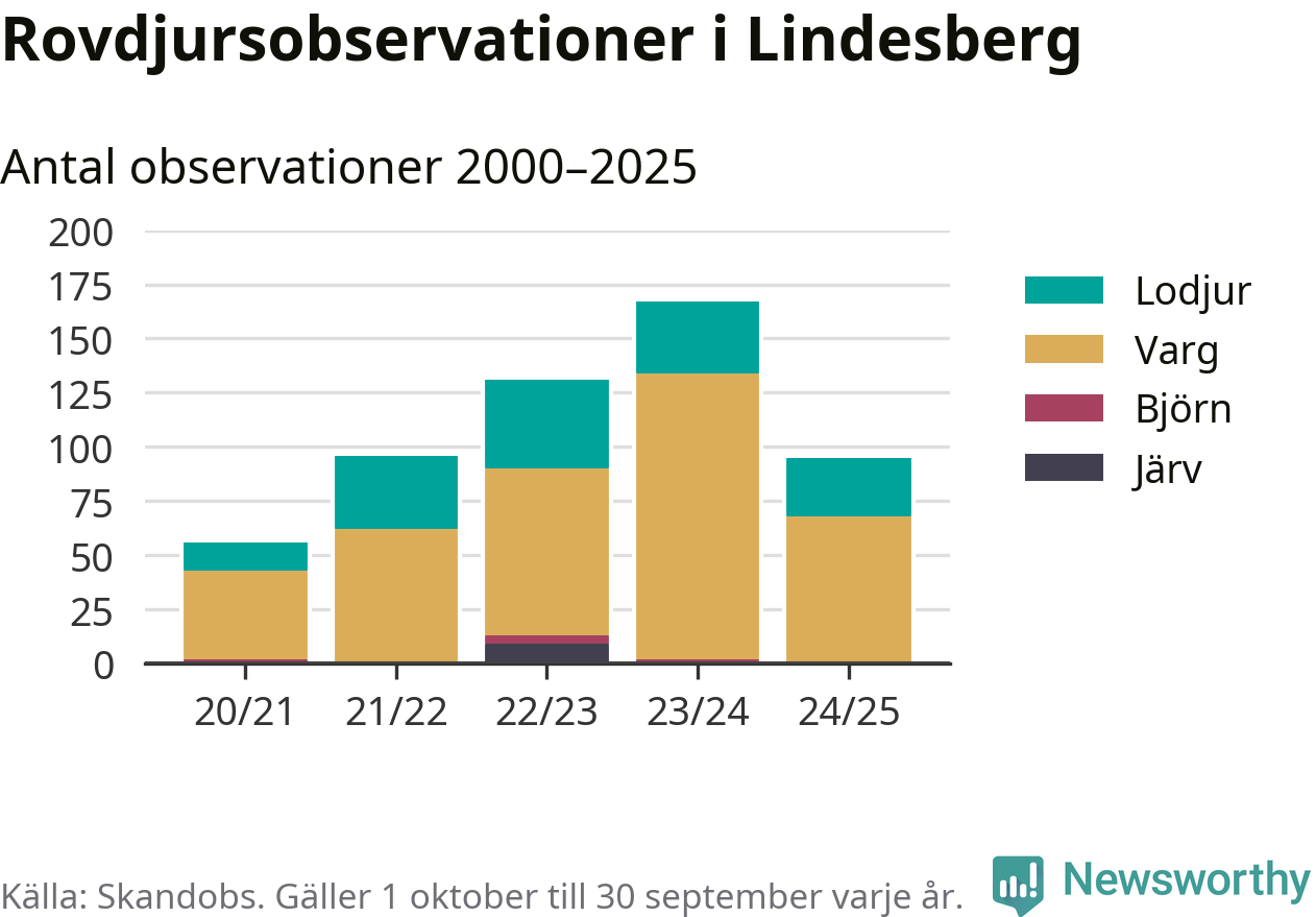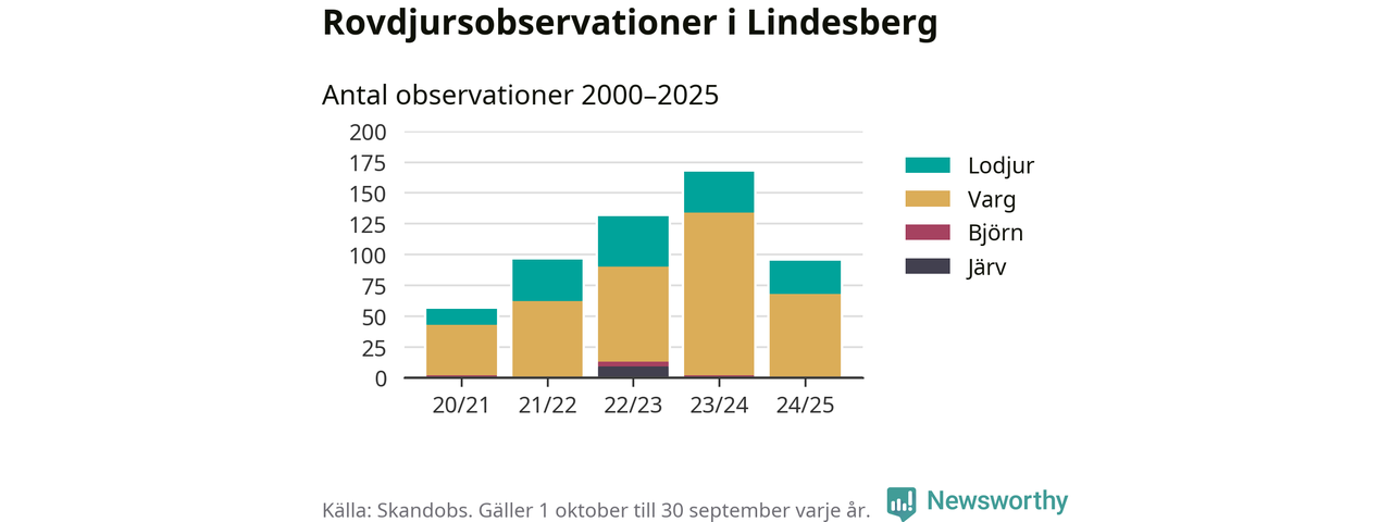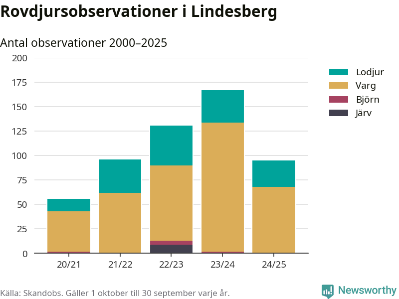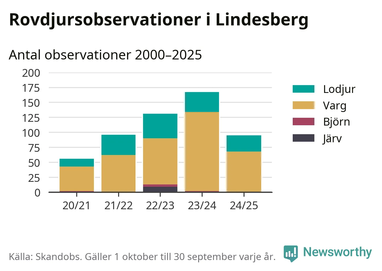 Där kan vem som helst rapportera sina observationer av de stora rovdjuren björn, varg, lodjur och järv. Mellan 1 oktober 2024 och 30 september i år har knappt 10 000 observationer registrerats i landet. Det kan vara synobservationer, foton, spår, spillning, döda bytesdjur eller andra tecken på rovdjursförekomst. I Lindesberg handlar det om totalt 95 observationer av varg eller lodjur.