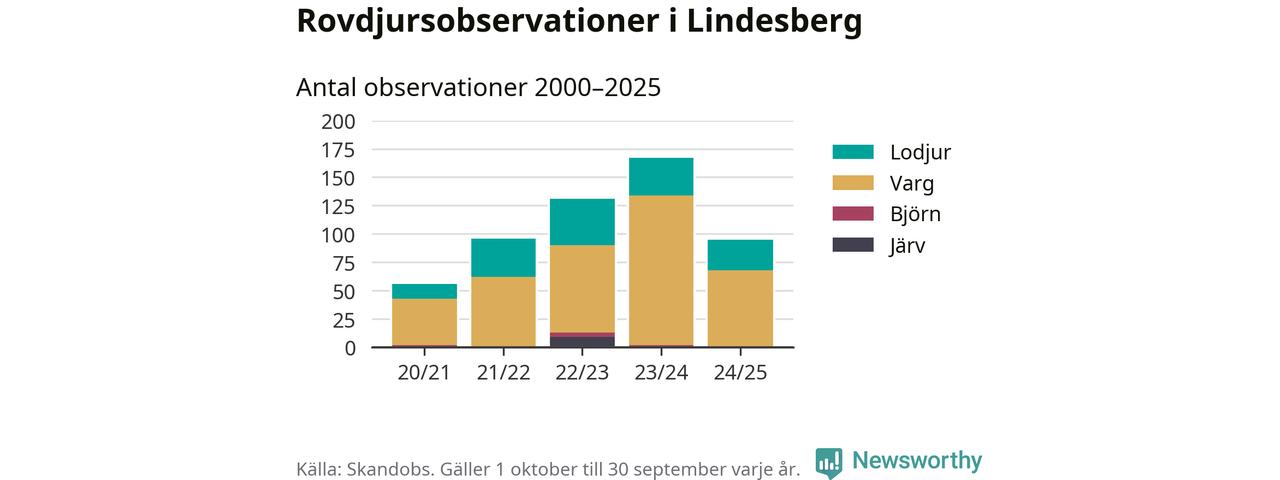 Lodjur har rapporterats 27 gånger det senaste året i Lindesberg, vilket är sex färre observationer än året innan. Av observationerna har 13 bekräftats av länsstyrelsen. Sedan slutet av år 2020 finns även nio rapporter om björn och nio rapporter om järv i Lindesberg, men ingen observation har gjorts det senaste året.