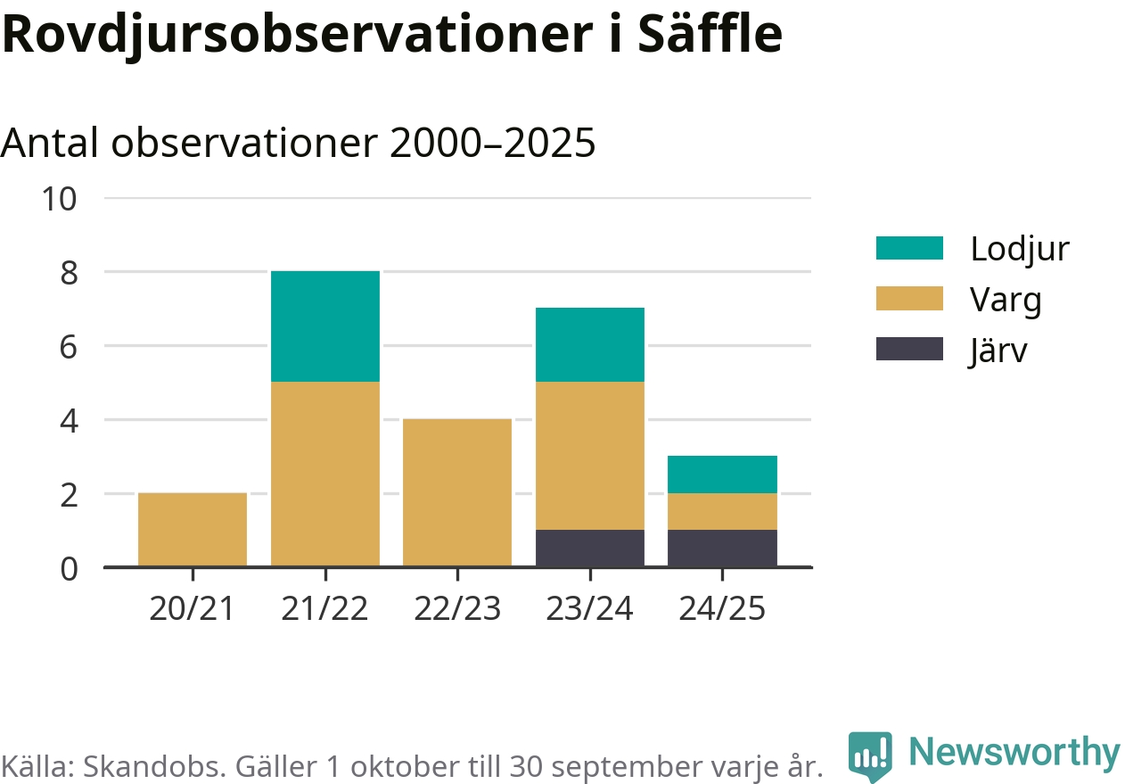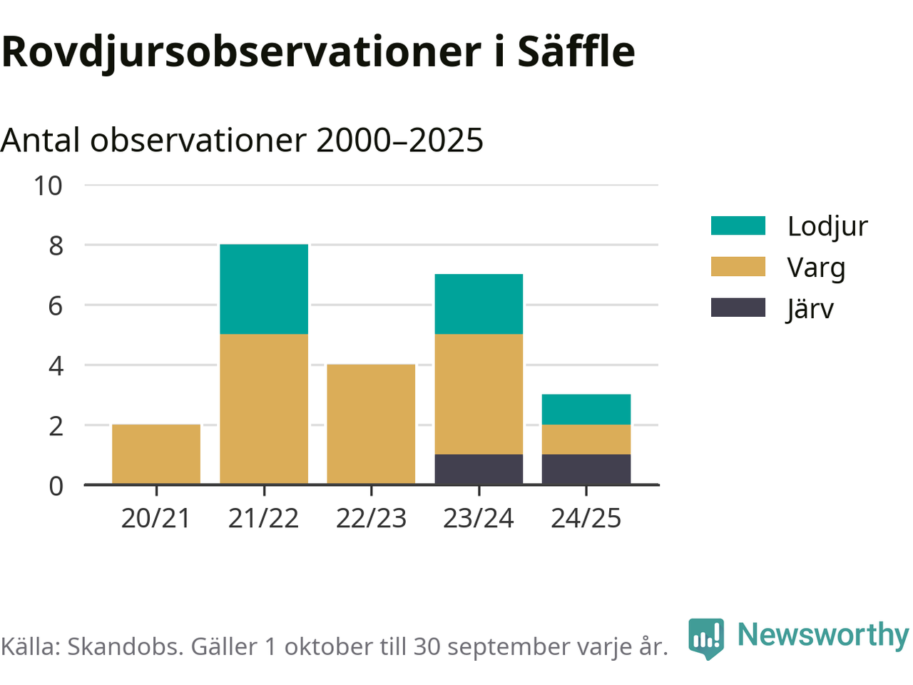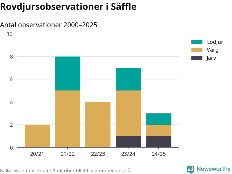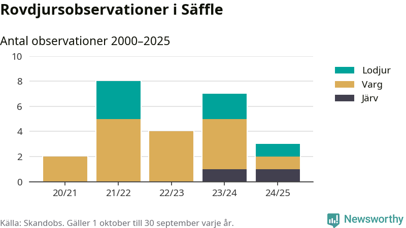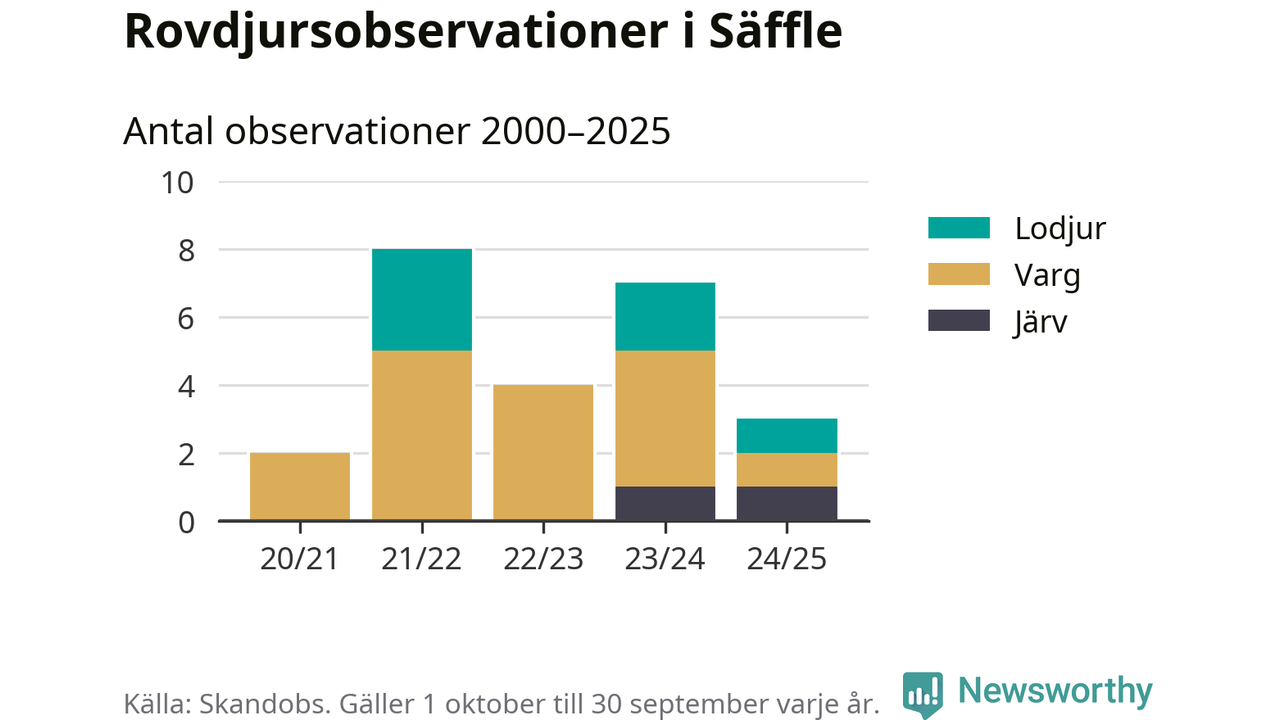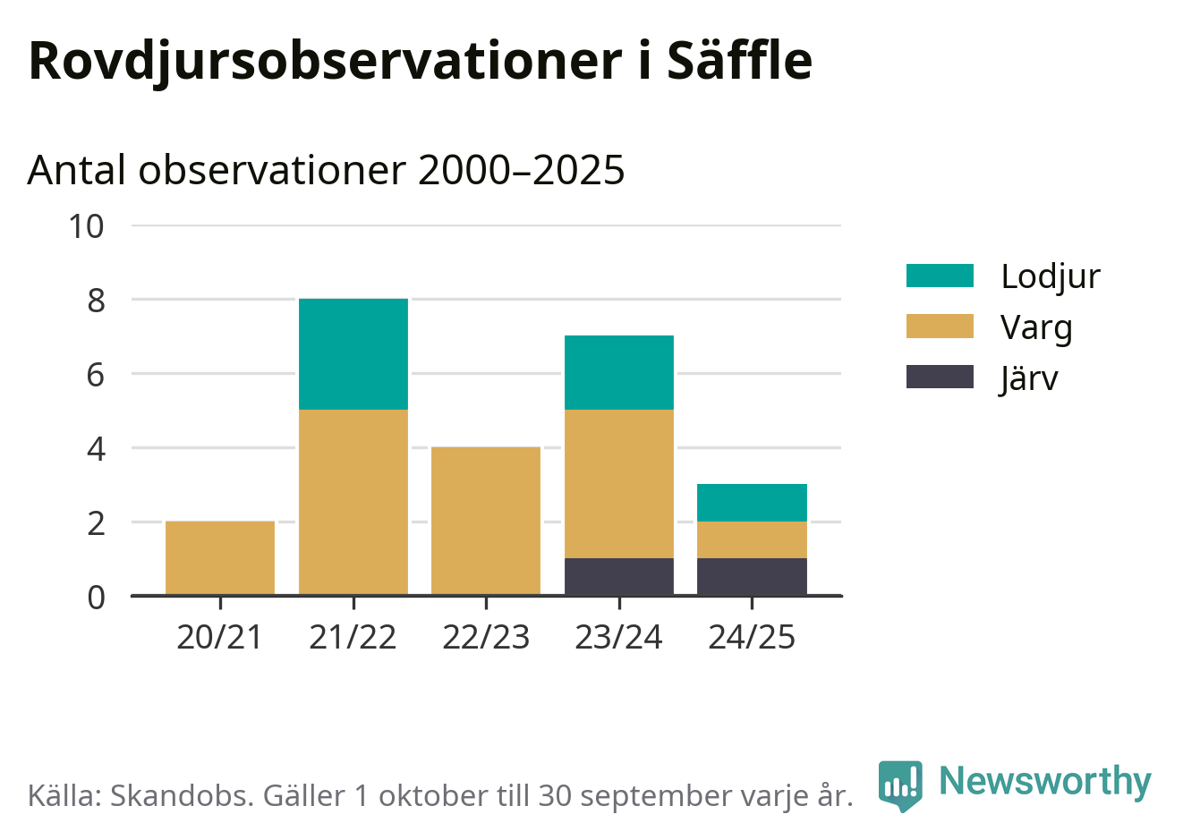 Där kan vem som helst rapportera sina observationer av de stora rovdjuren björn, varg, lodjur och järv. Mellan 1 oktober 2024 och 30 september i år har knappt 10 000 observationer registrerats i landet. Det kan vara synobservationer, foton, spår, spillning, döda bytesdjur eller andra tecken på rovdjursförekomst. I Säffle handlar det om totalt tre observationer av järv, lodjur eller varg.