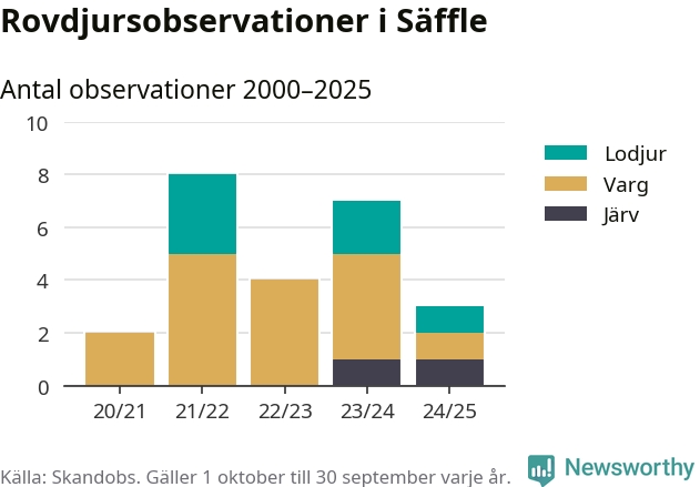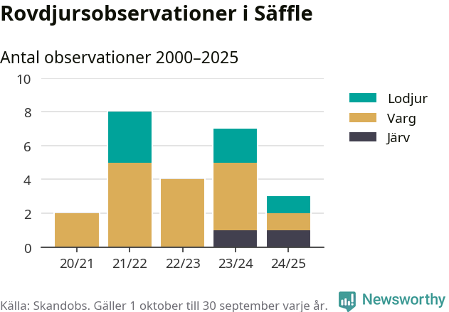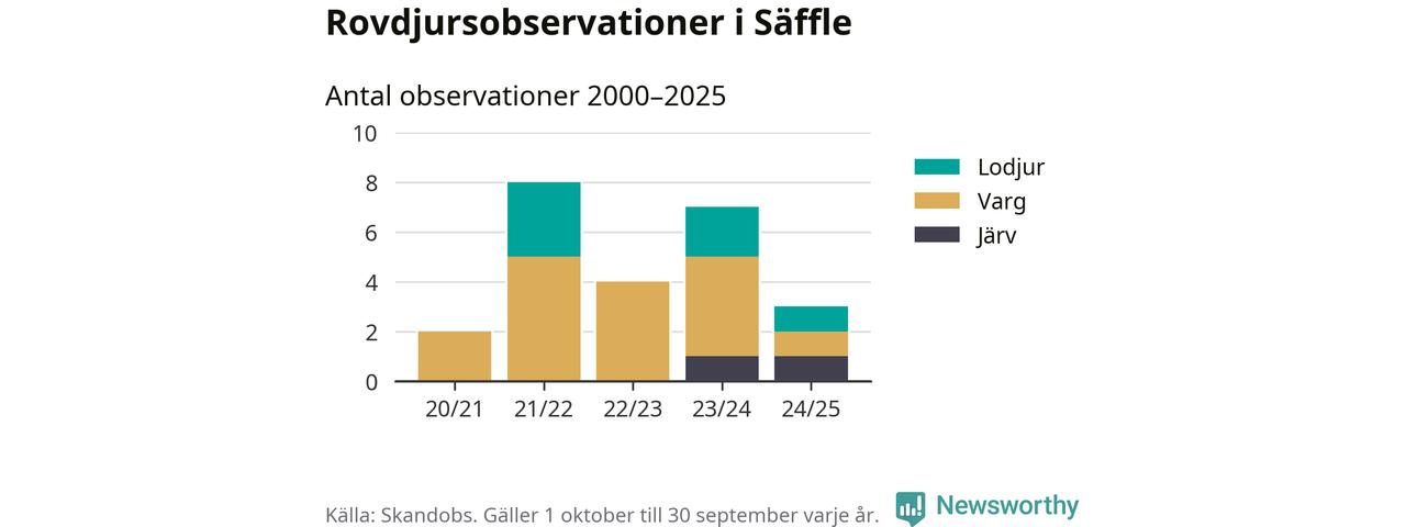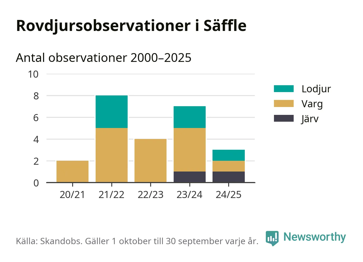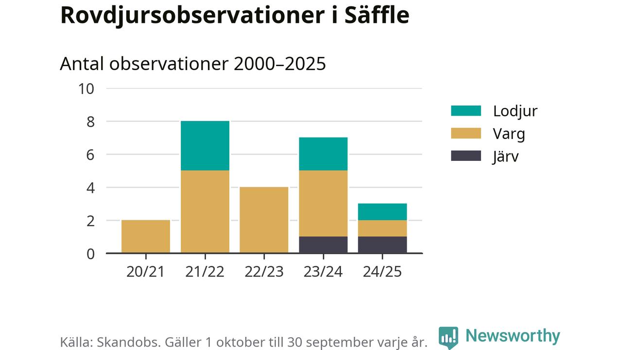 Järvobservationen i februari 2025 – som inte har kunnat bekräftas av länsstyrelsen – är den enda i Säffle under det senaste året, även om tidigare under 2020-talet rapporterats en observation. Sedan slutet av år 2020 finns även fem rapporter om lodjur och 15 rapporter om varg i Säffle.