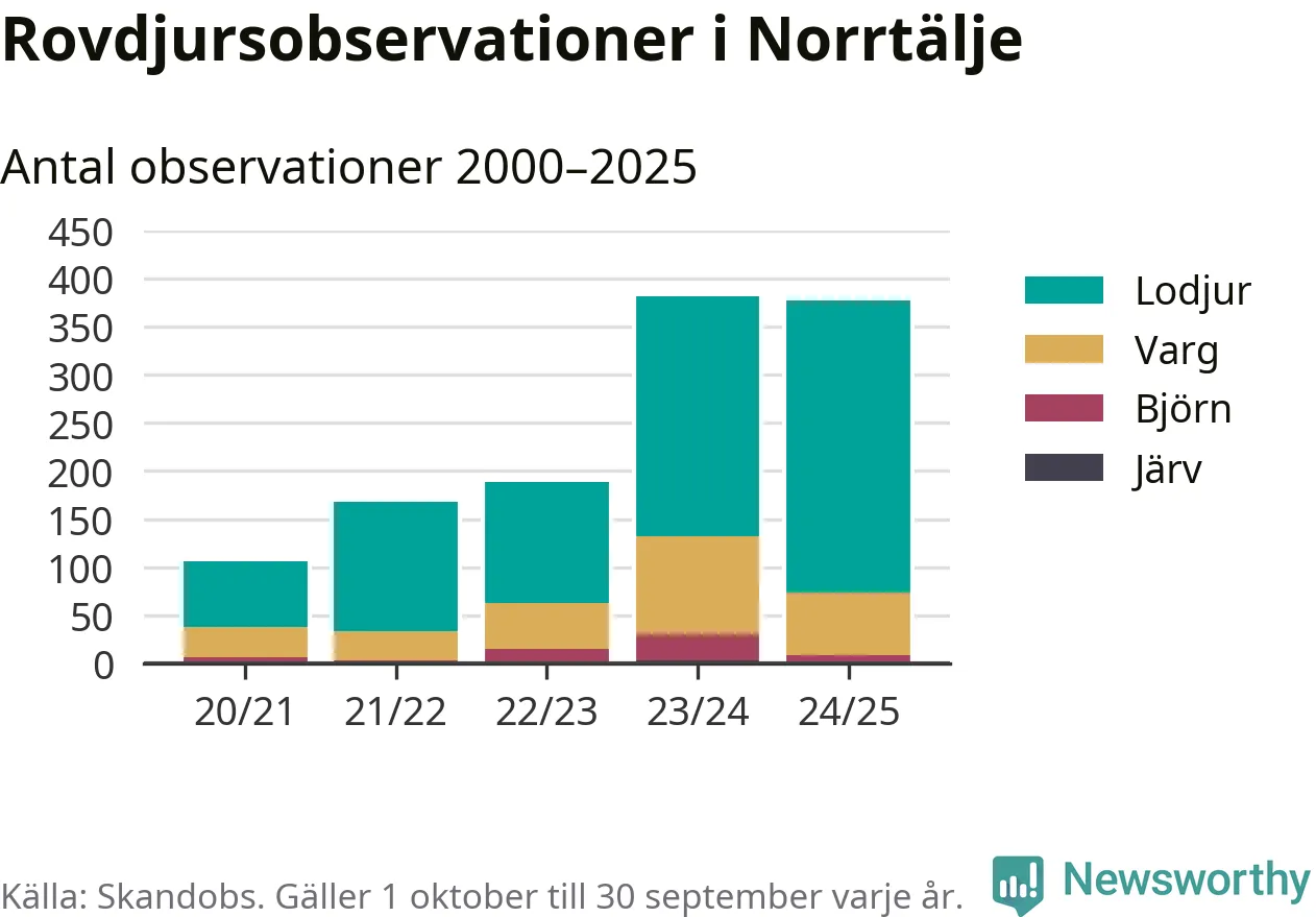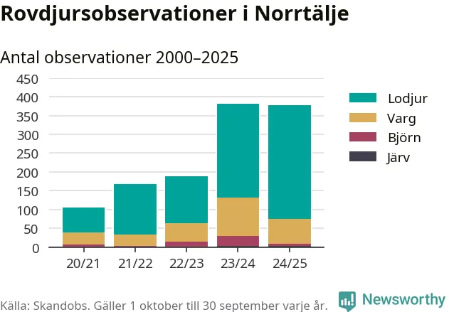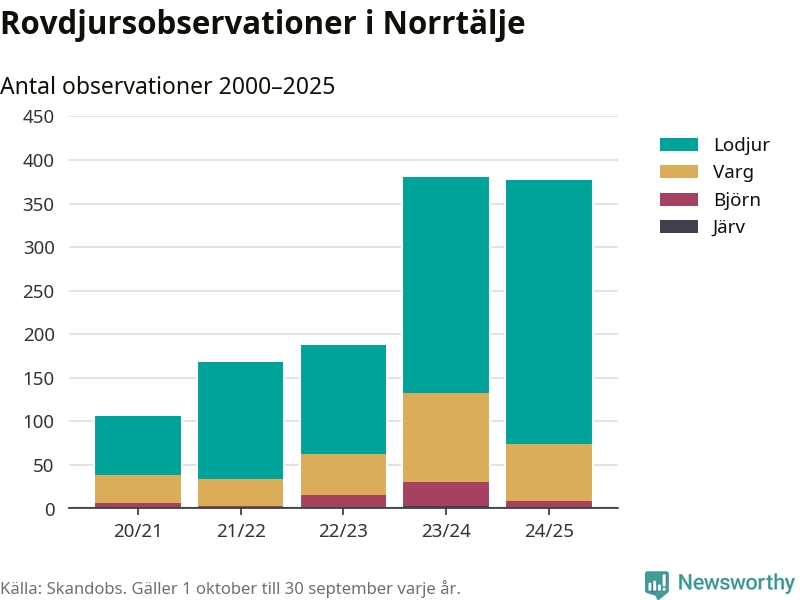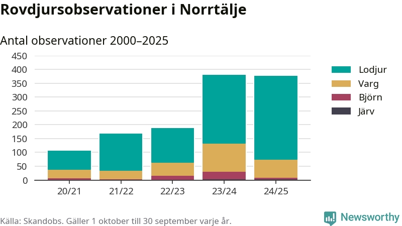 Där kan vem som helst rapportera sina observationer av de stora rovdjuren björn, varg, lodjur och järv. Mellan 1 oktober 2024 och 30 september i år har knappt 10 000 observationer registrerats i landet. Det kan vara synobservationer, foton, spår, spillning, döda bytesdjur eller andra tecken på rovdjursförekomst. I Norrtälje finns totalt 377 rapporter, om alla fyra rovdjur.