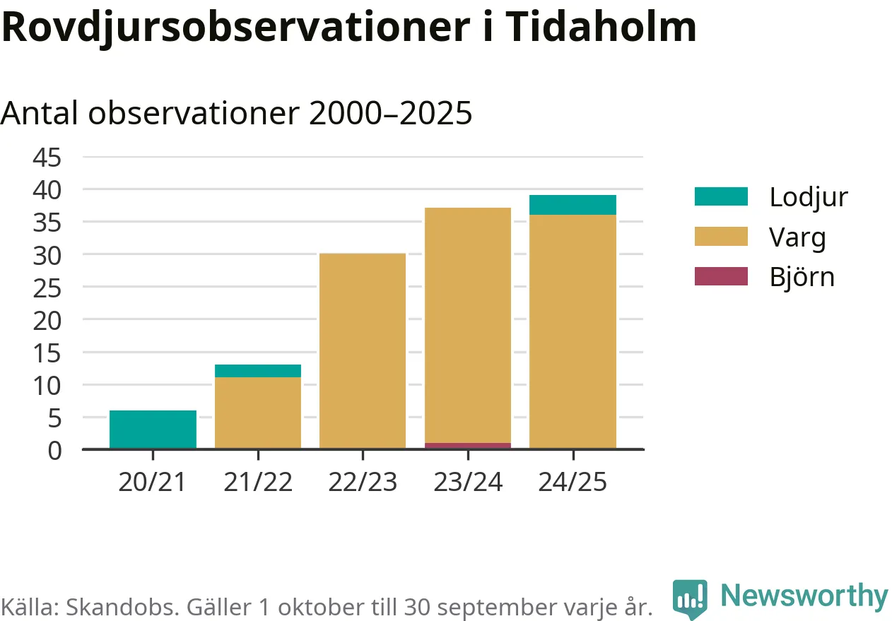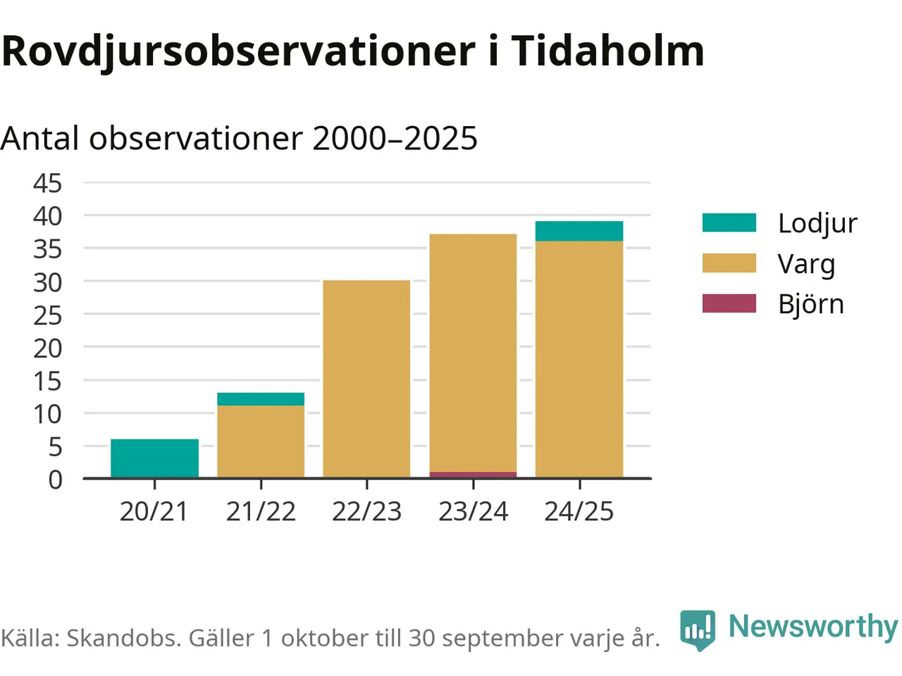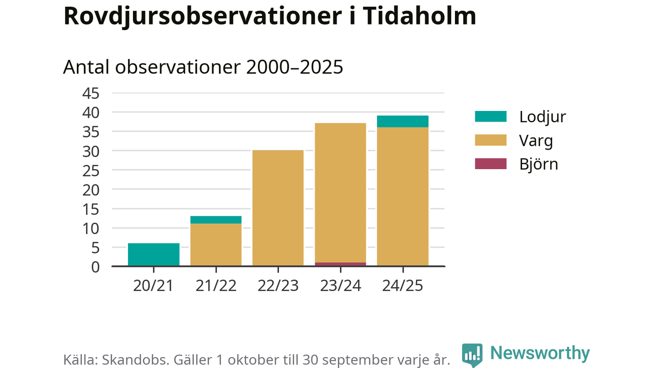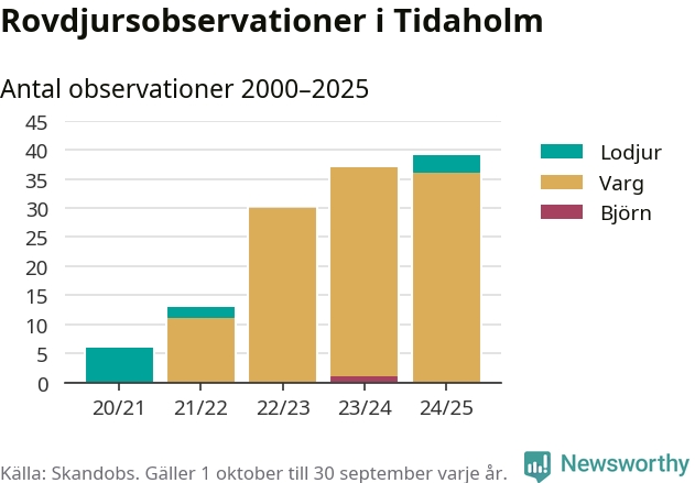 Där kan vem som helst rapportera sina observationer av de stora rovdjuren björn, varg, lodjur och järv. Mellan 1 oktober 2024 och 30 september i år har knappt 10 000 observationer registrerats i landet. Det kan vara synobservationer, foton, spår, spillning, döda bytesdjur eller andra tecken på rovdjursförekomst. I Tidaholm handlar det om totalt 39 observationer av varg eller lodjur.
