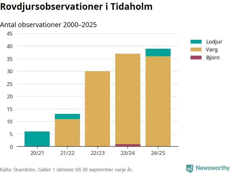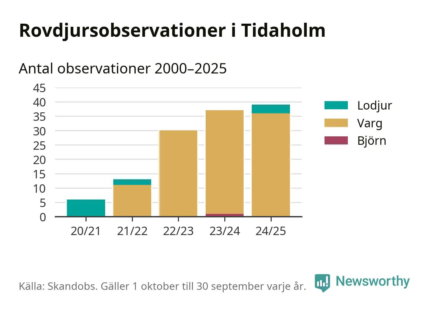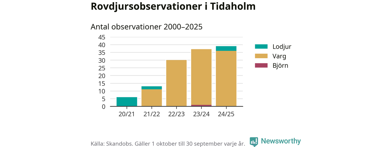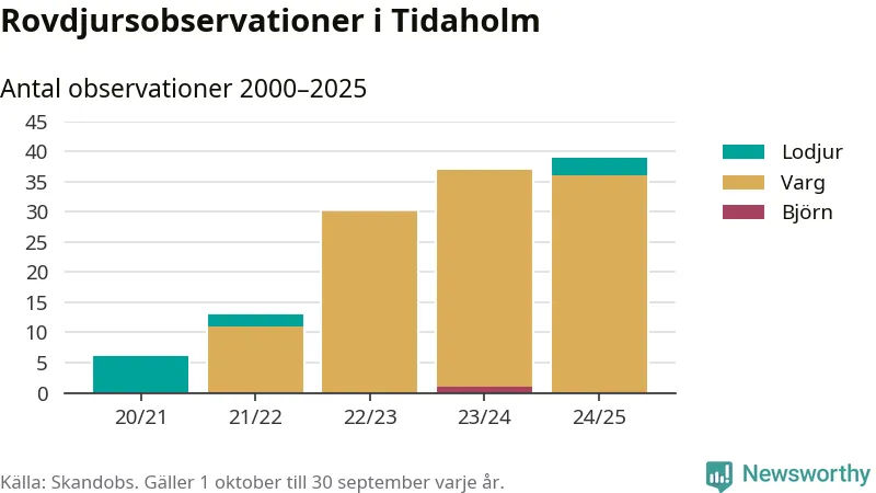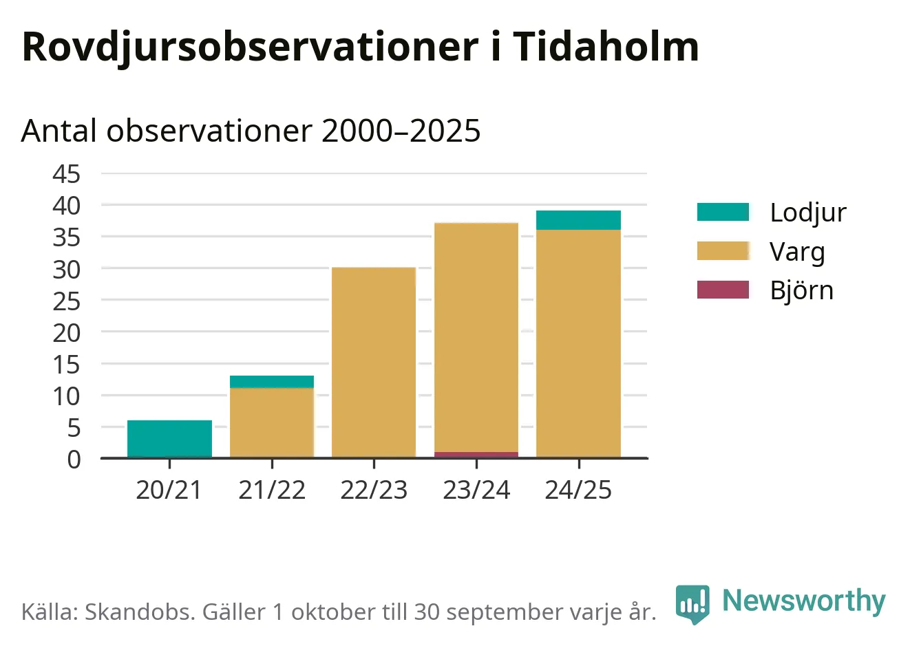 Där kan vem som helst rapportera sina observationer av de stora rovdjuren björn, varg, lodjur och järv. Mellan 1 oktober 2024 och 30 september i år har knappt 10 000 observationer registrerats i landet. Det kan vara synobservationer, foton, spår, spillning, döda bytesdjur eller andra tecken på rovdjursförekomst. I Tidaholm handlar det om totalt 39 observationer av varg eller lodjur.