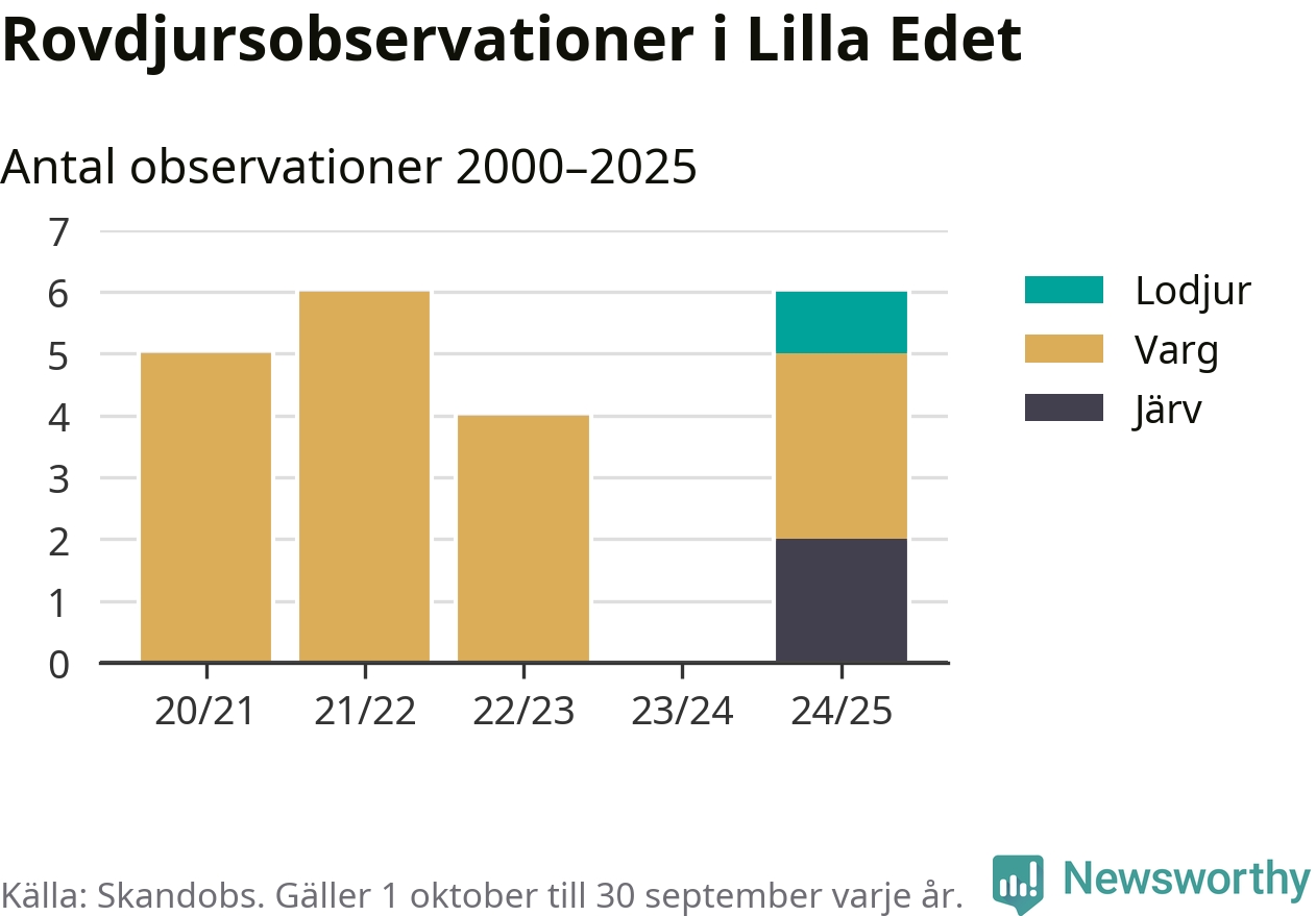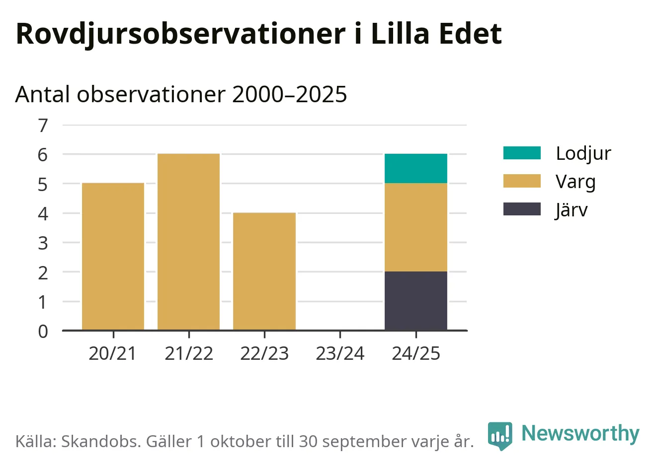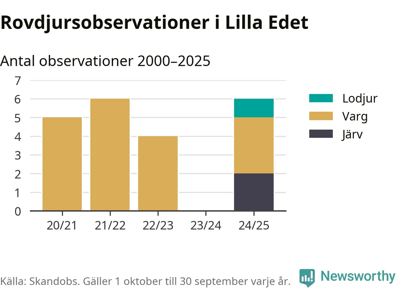 Där kan vem som helst rapportera sina observationer av de stora rovdjuren björn, varg, lodjur och järv. Mellan 1 oktober 2024 och 30 september i år har knappt 10 000 observationer registrerats i landet. Det kan vara synobservationer, foton, spår, spillning, döda bytesdjur eller andra tecken på rovdjursförekomst. I Lilla Edet handlar det om totalt sex observationer av varg, järv eller lodjur.