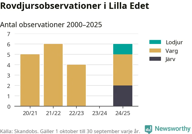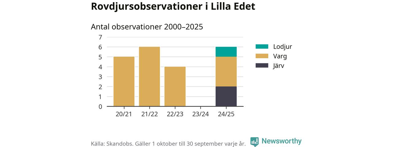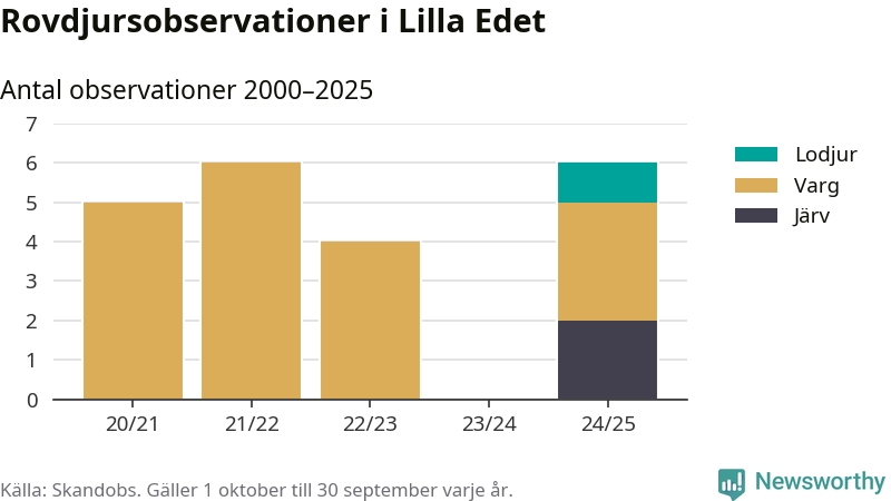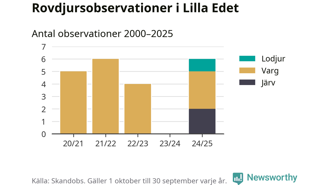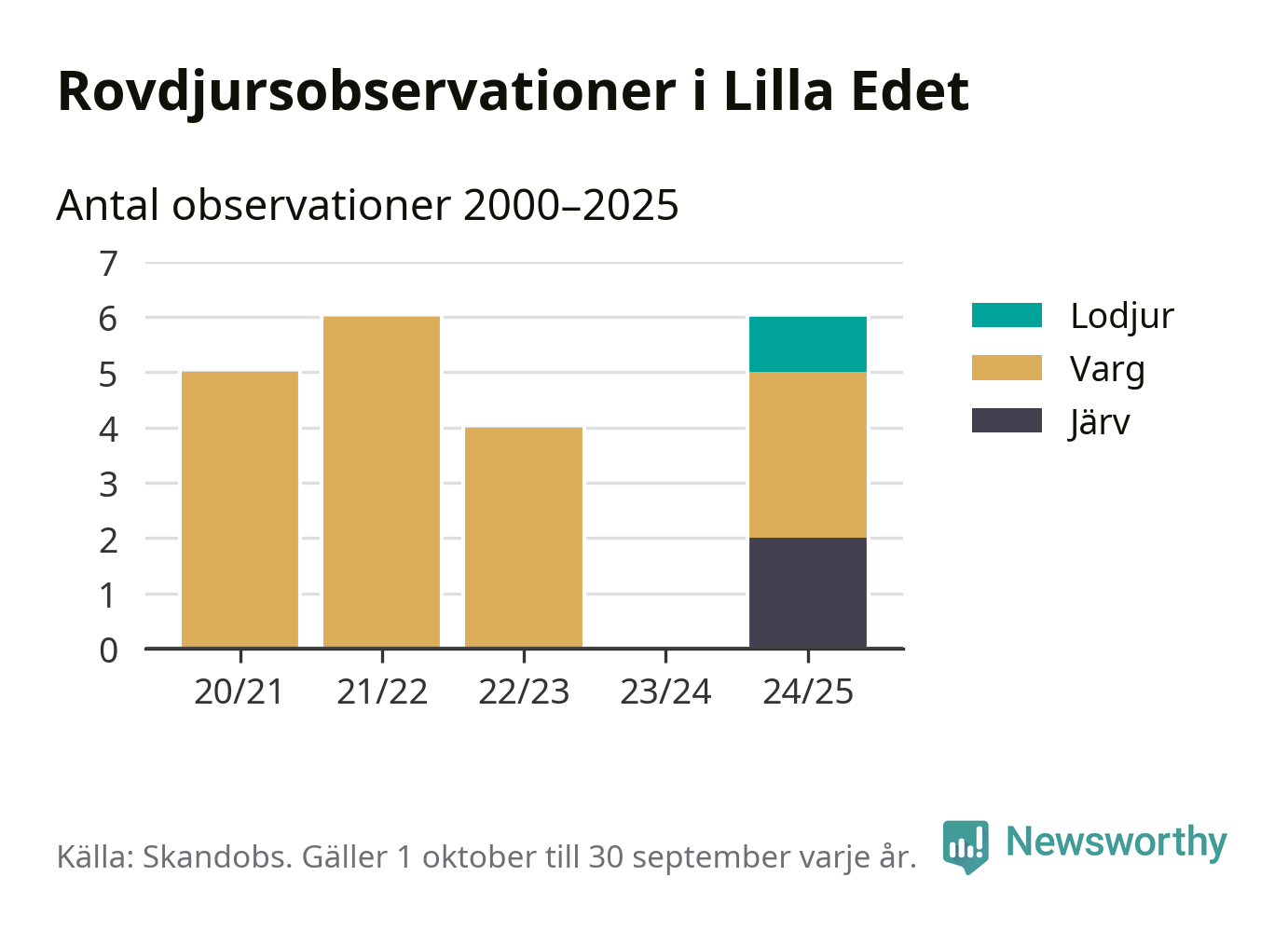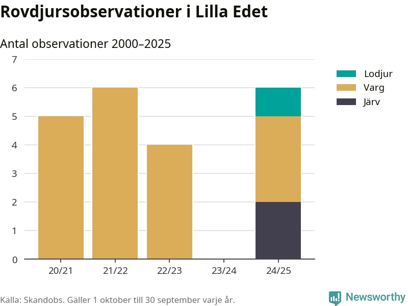 Där kan vem som helst rapportera sina observationer av de stora rovdjuren björn, varg, lodjur och järv. Mellan 1 oktober 2024 och 30 september i år har knappt 10 000 observationer registrerats i landet. Det kan vara synobservationer, foton, spår, spillning, döda bytesdjur eller andra tecken på rovdjursförekomst. I Lilla Edet handlar det om totalt sex observationer av varg, järv eller lodjur.
