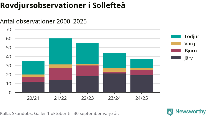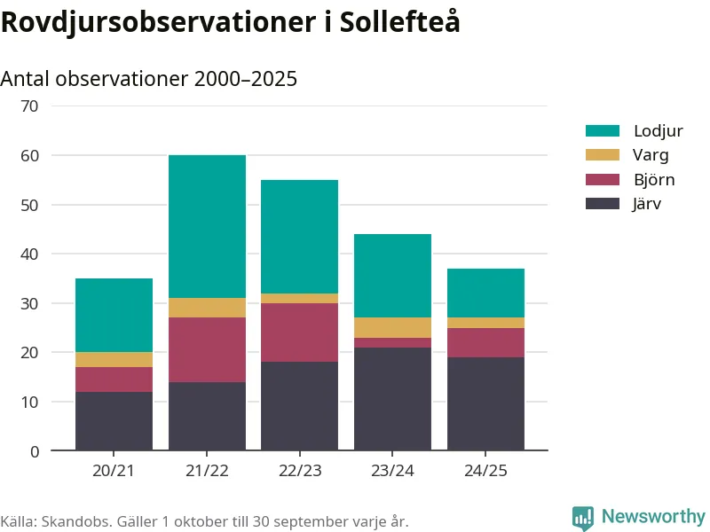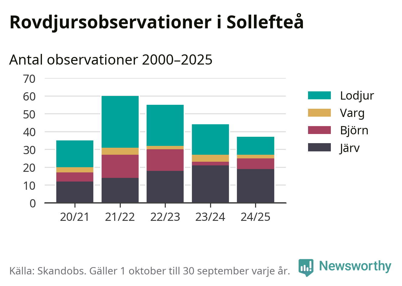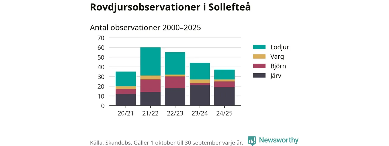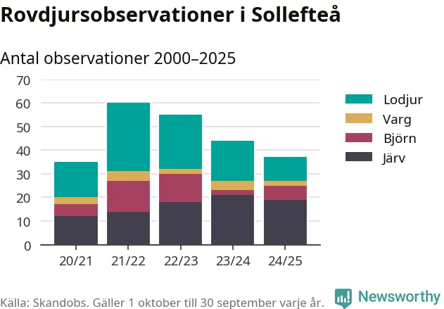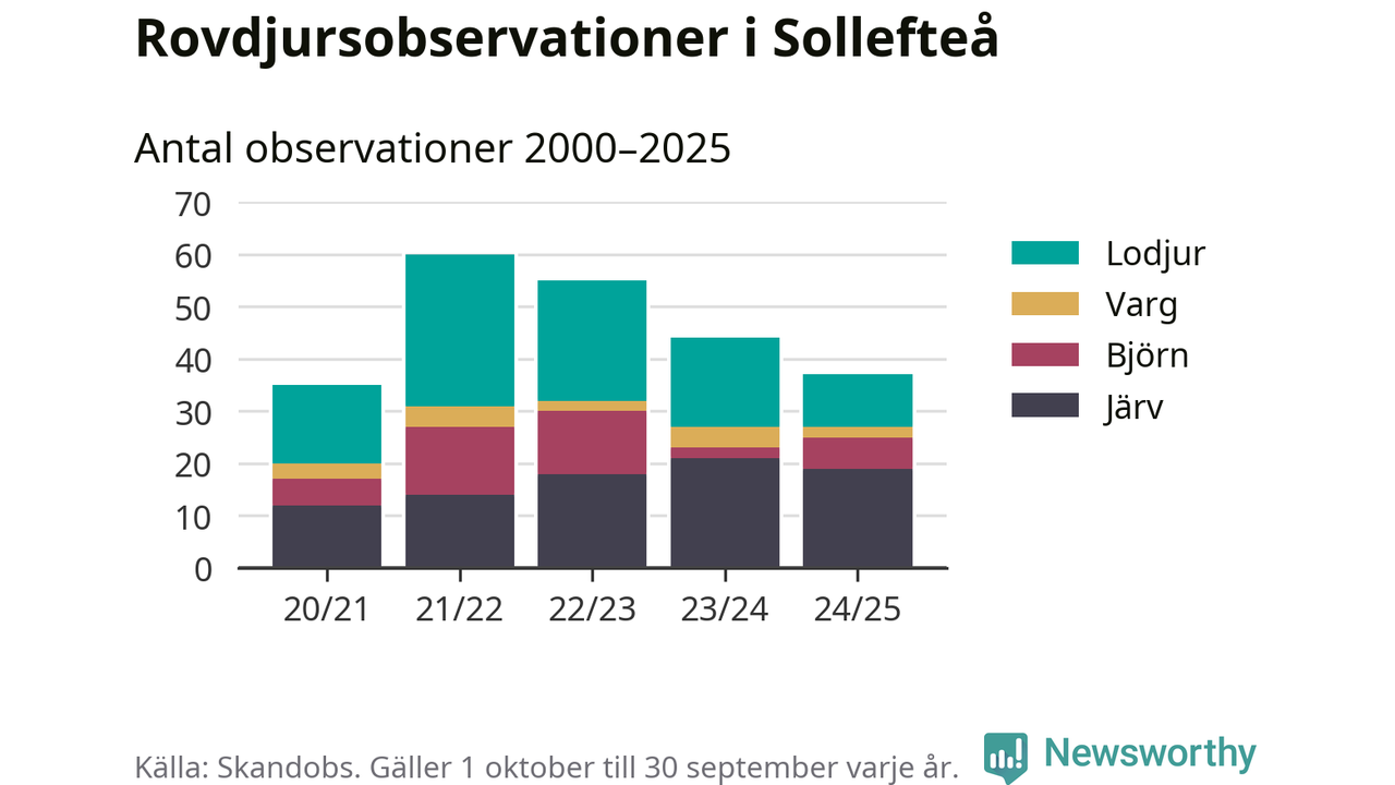 Där kan vem som helst rapportera sina observationer av de stora rovdjuren björn, varg, lodjur och järv. Mellan 1 oktober 2024 och 30 september i år har knappt 10 000 observationer registrerats i landet. Det kan vara synobservationer, foton, spår, spillning, döda bytesdjur eller andra tecken på rovdjursförekomst. I Sollefteå finns totalt 37 rapporter, om alla fyra rovdjur.