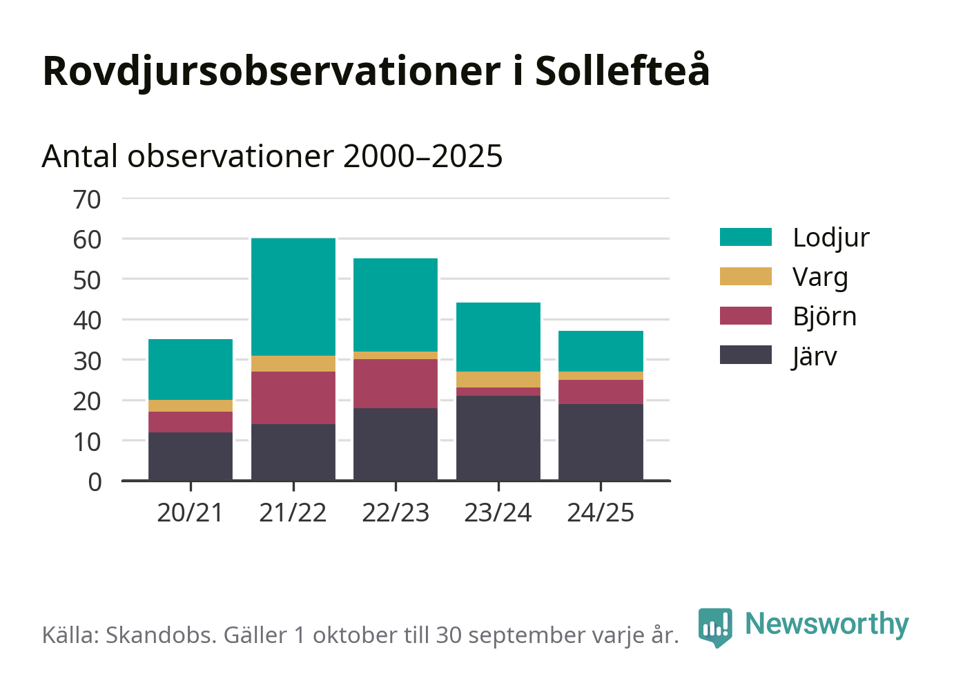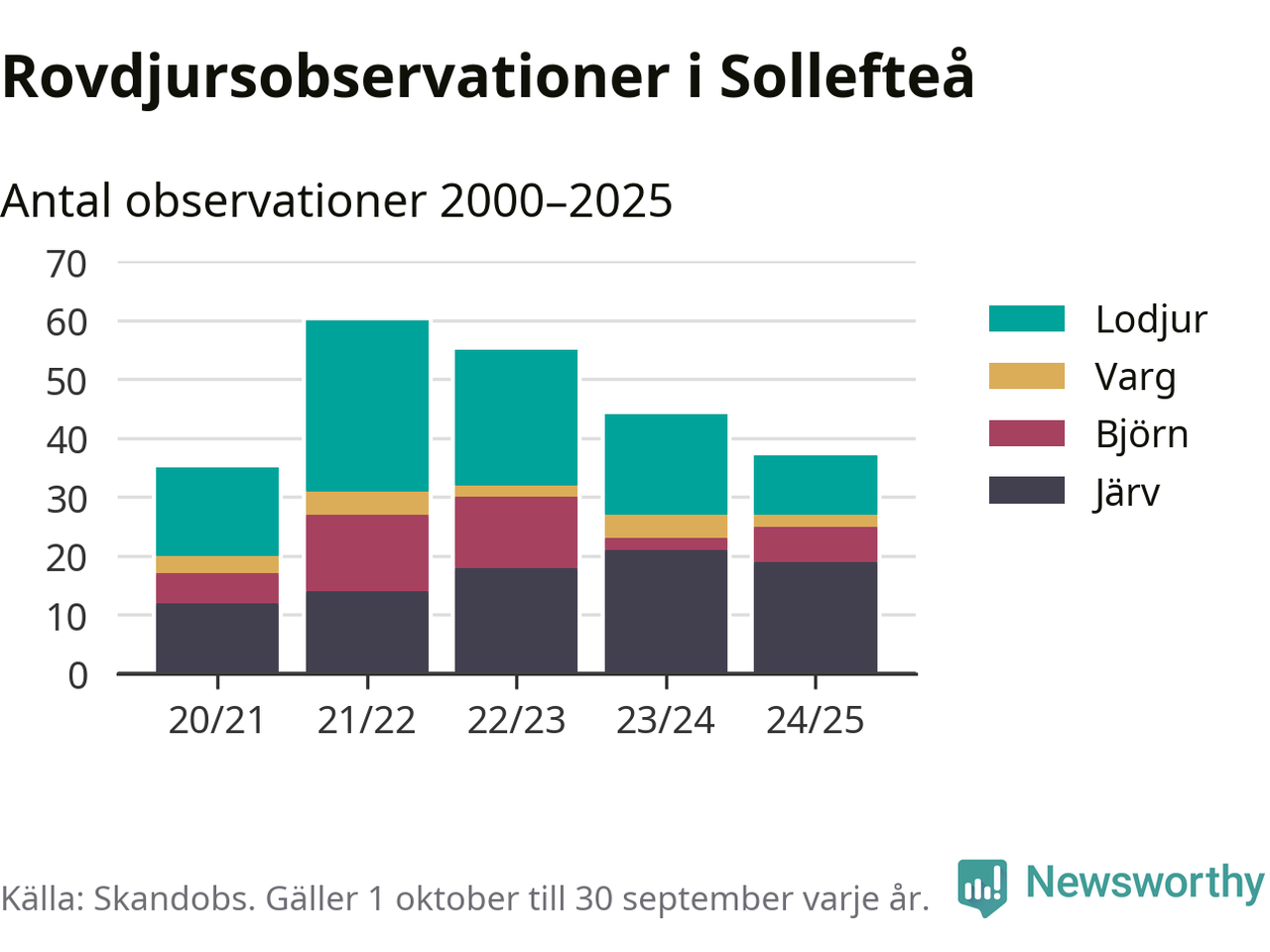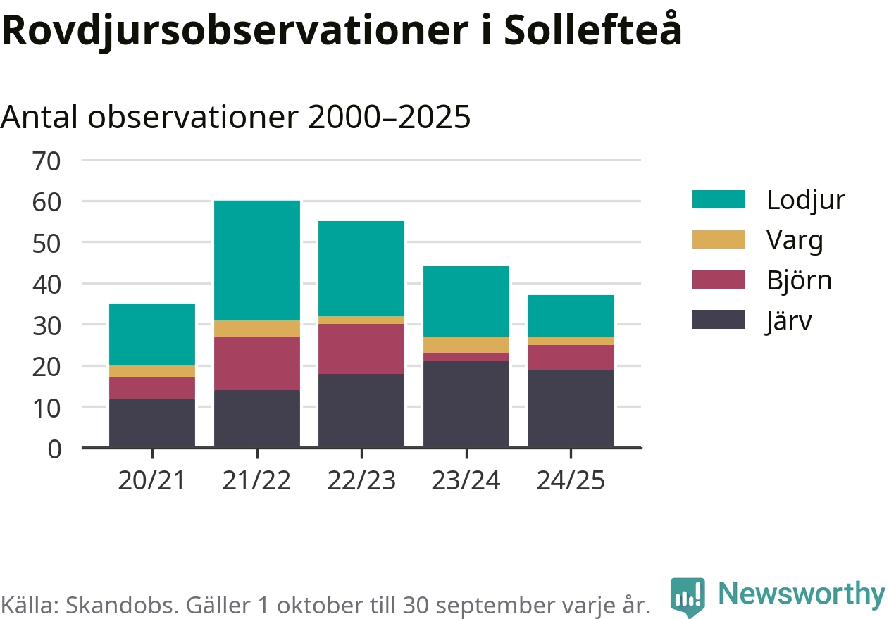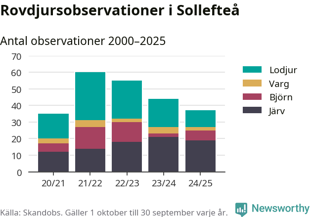 Där kan vem som helst rapportera sina observationer av de stora rovdjuren björn, varg, lodjur och järv. Mellan 1 oktober 2024 och 30 september i år har knappt 10 000 observationer registrerats i landet. Det kan vara synobservationer, foton, spår, spillning, döda bytesdjur eller andra tecken på rovdjursförekomst. I Sollefteå finns totalt 37 rapporter, om alla fyra rovdjur.