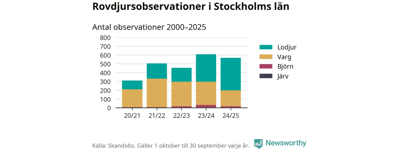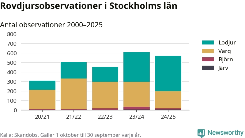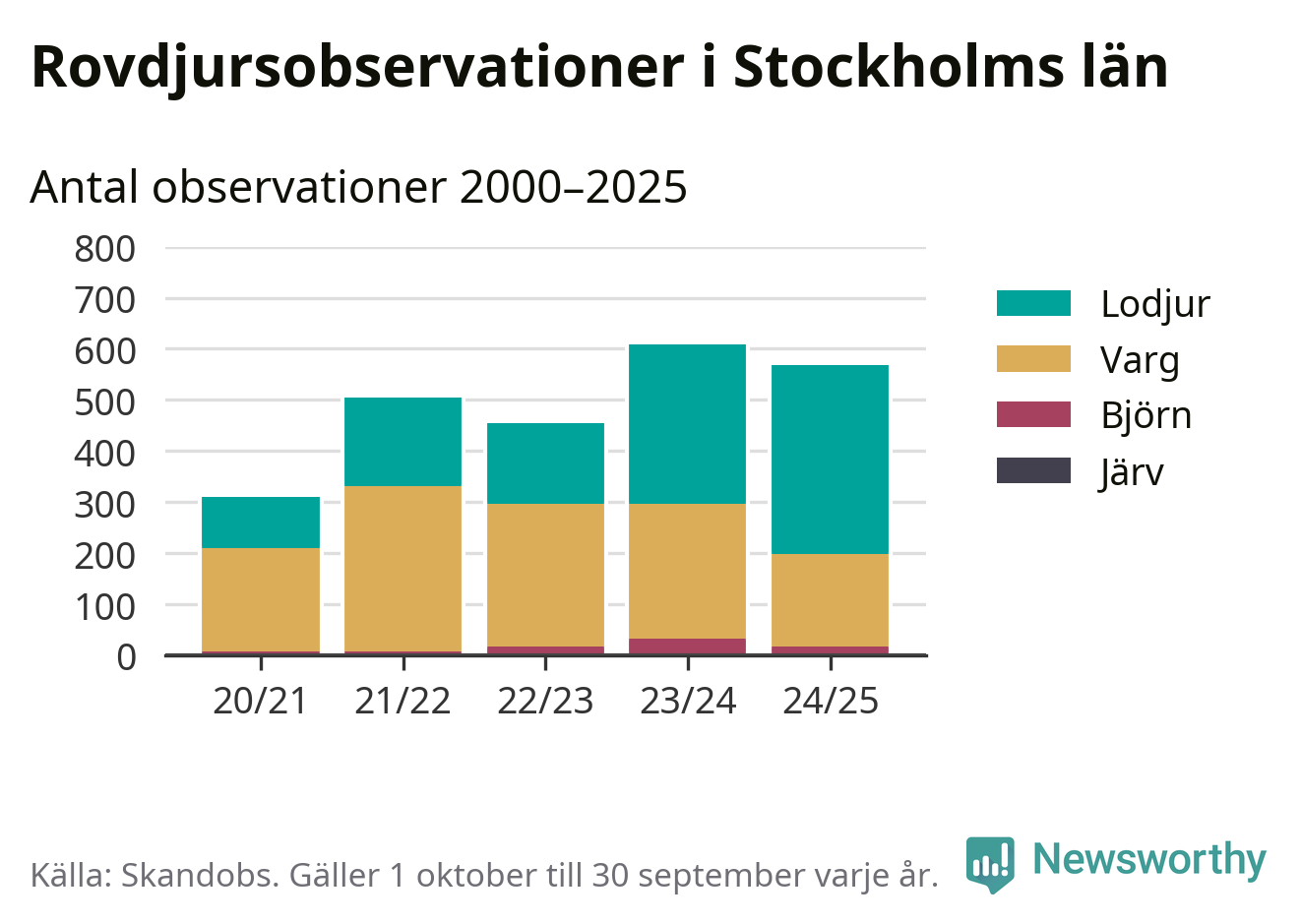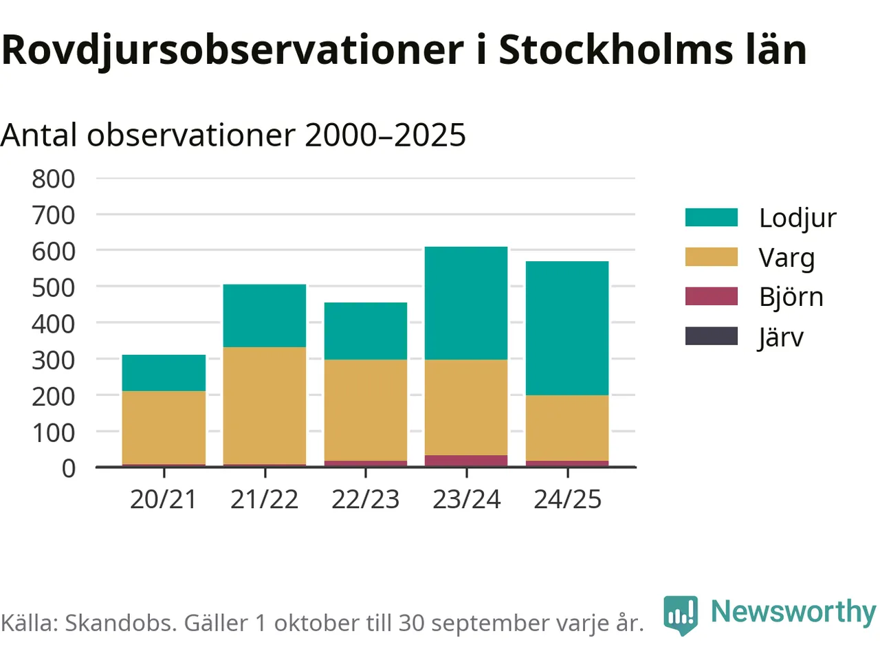Källa och metod Newsworthy har begärt ut alla observationer som finns i Skandobs databas mellan 1 oktober 2020 och 30 september 2025. Vi har sedan räknat bort observationer som bedömts vara fel art av länsstyrelsen. Däremot finns observationer som inte har bedömts, eller som inte kunnat bedömas, kvar i materialet. Vi räknar här per år från 1 oktober till 30 september. Kommun och län baseras på den koordinat som observationen är registrerad på, och den kopplingen görs av Skandobs.