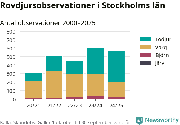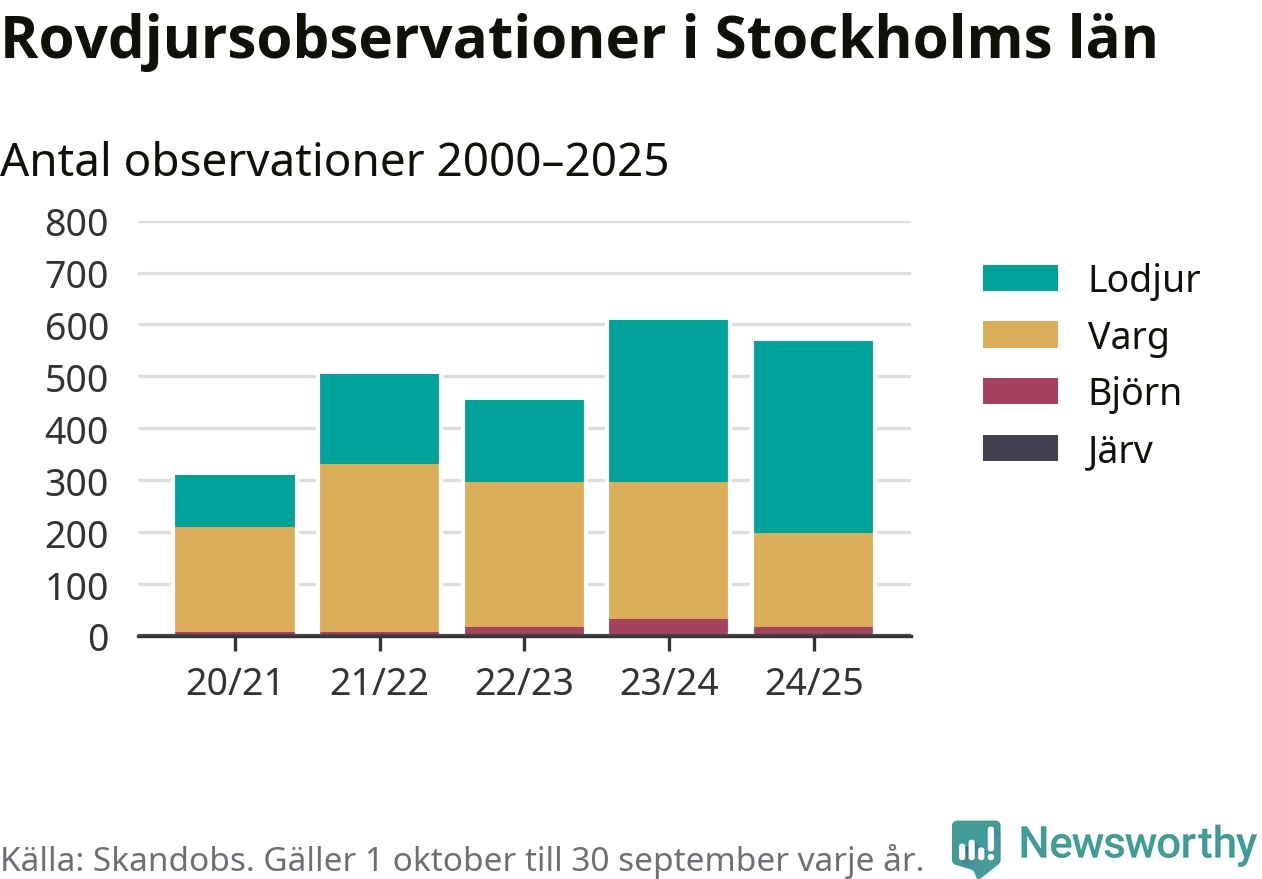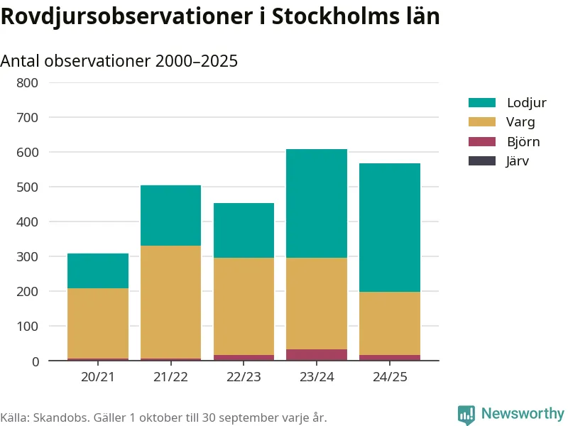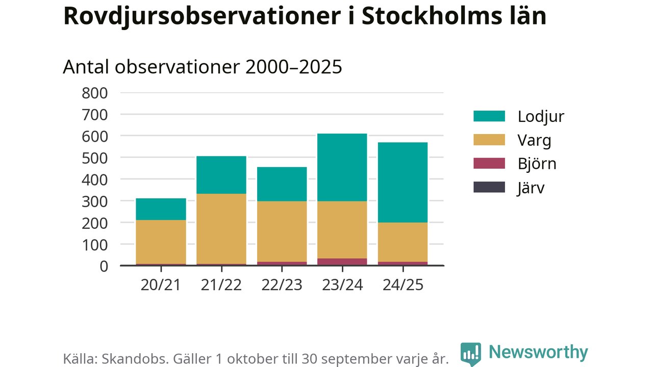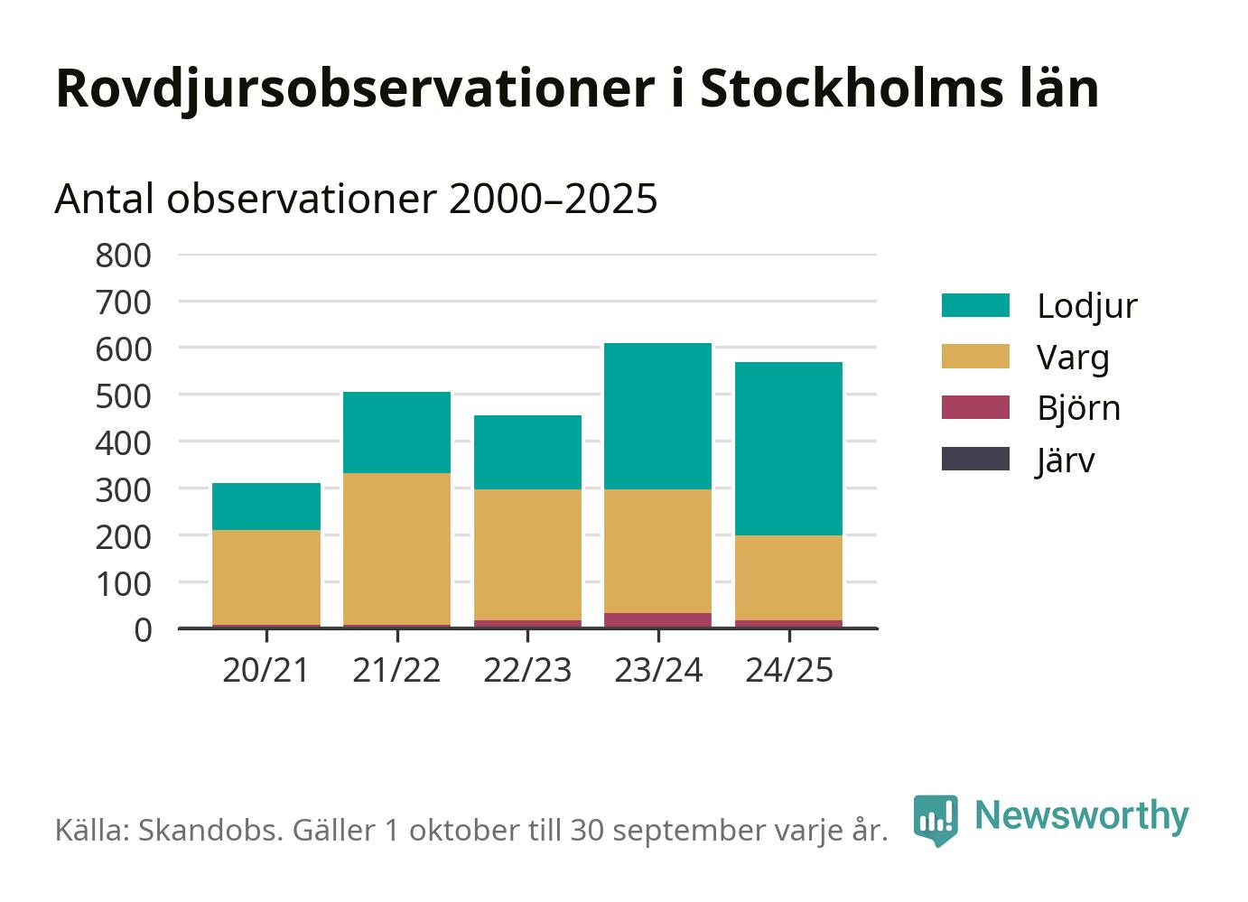 Källa och metod Newsworthy har begärt ut alla observationer som finns i Skandobs databas mellan 1 oktober 2020 och 30 september 2025. Vi har sedan räknat bort observationer som bedömts vara fel art av länsstyrelsen. Däremot finns observationer som inte har bedömts, eller som inte kunnat bedömas, kvar i materialet. Vi räknar här per år från 1 oktober till 30 september. Kommun och län baseras på den koordinat som observationen är registrerad på, och den kopplingen görs av Skandobs.