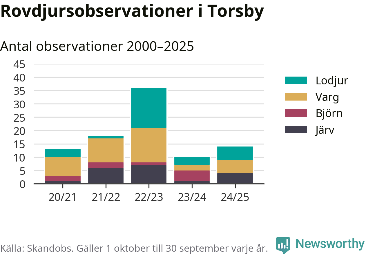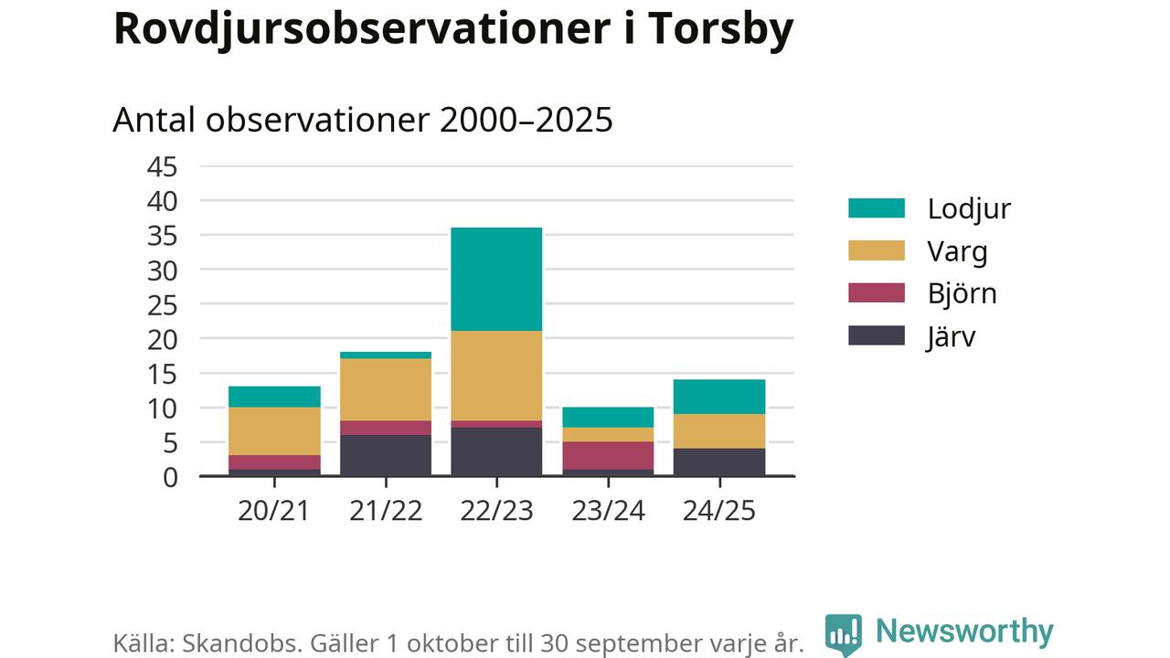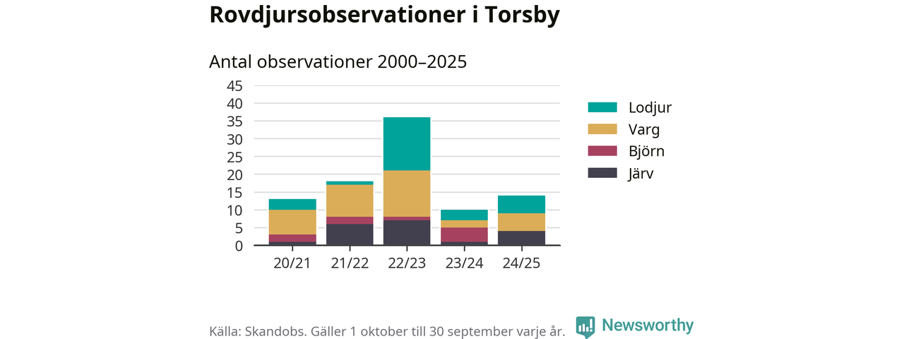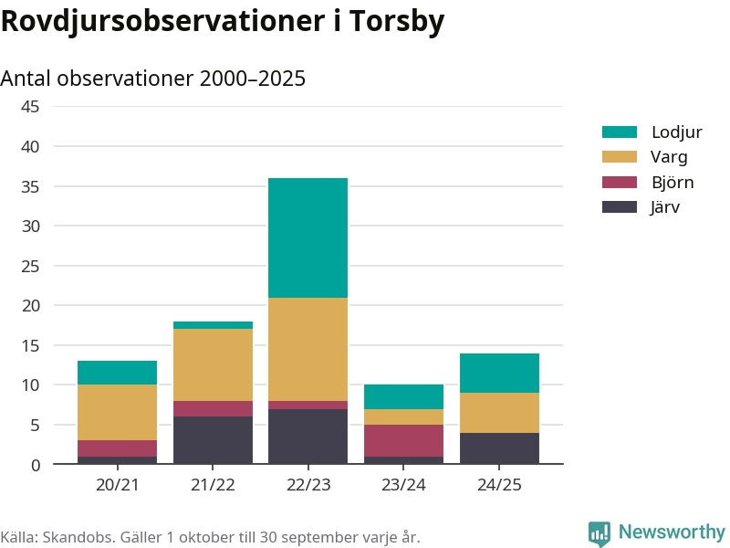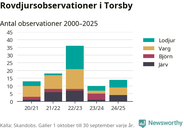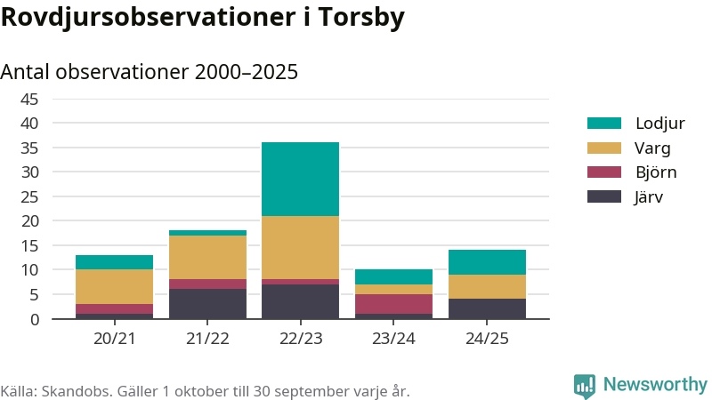 Till Skandobs kan vem som helst rapportera sina observationer av de stora rovdjuren björn, varg, lodjur och järv. Mellan 1 oktober 2024 och 30 september i år har knappt 10 000 observationer registrerats i landet. Det kan vara synobservationer, foton, spår, spillning, döda bytesdjur eller andra tecken på rovdjursförekomst. I Torsby handlar det om totalt 14 observationer av lodjur, varg eller järv.