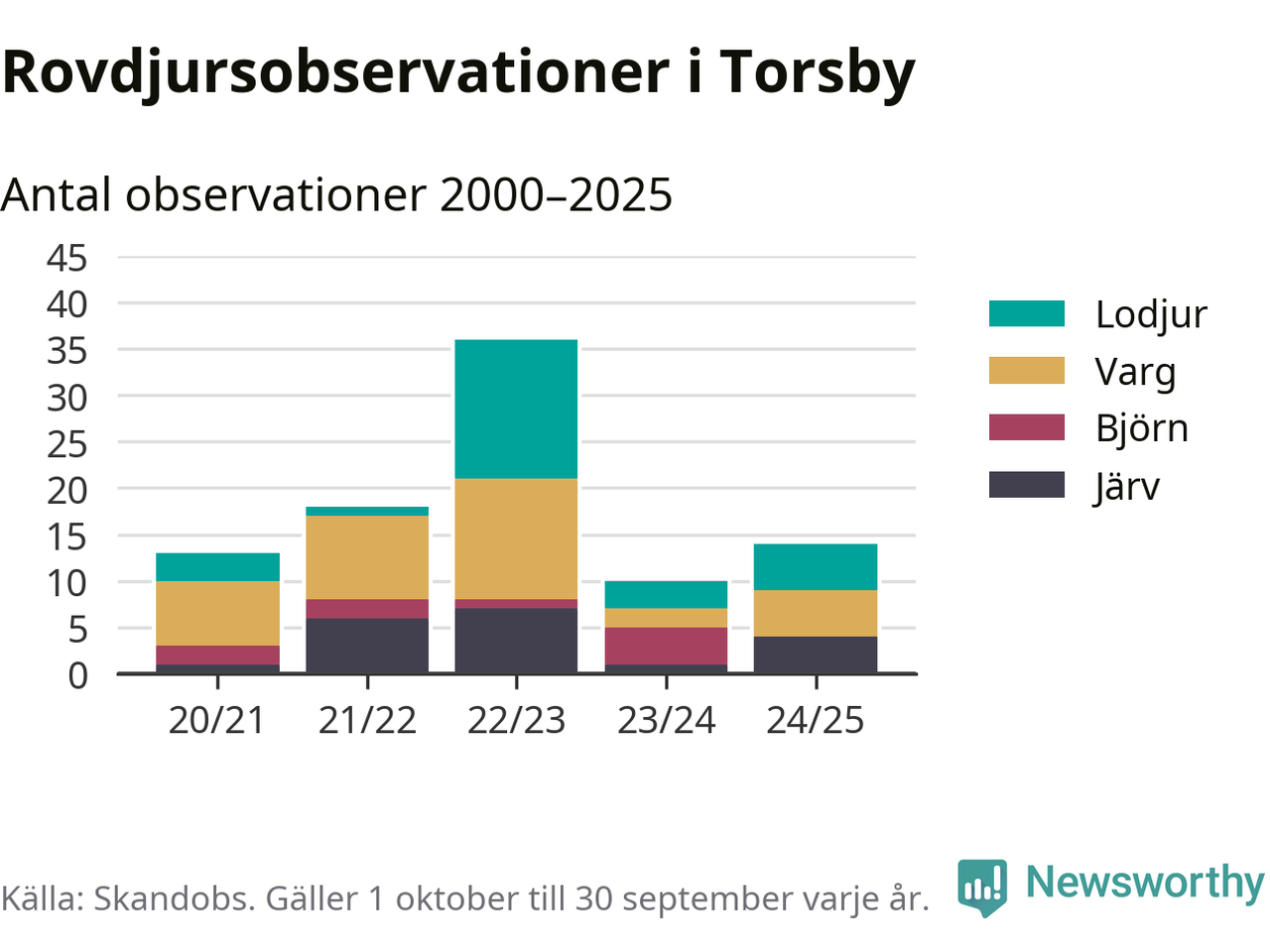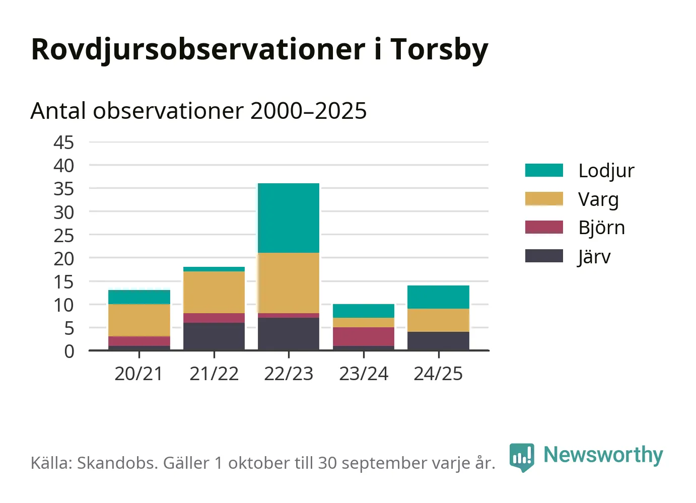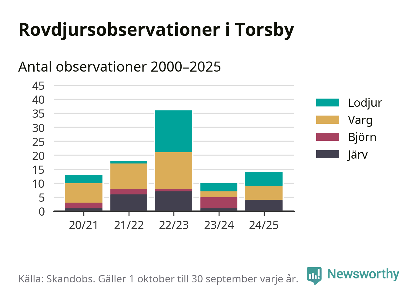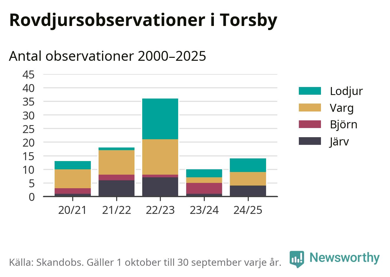 Till Skandobs kan vem som helst rapportera sina observationer av de stora rovdjuren björn, varg, lodjur och järv. Mellan 1 oktober 2024 och 30 september i år har knappt 10 000 observationer registrerats i landet. Det kan vara synobservationer, foton, spår, spillning, döda bytesdjur eller andra tecken på rovdjursförekomst. I Torsby handlar det om totalt 14 observationer av lodjur, varg eller järv.