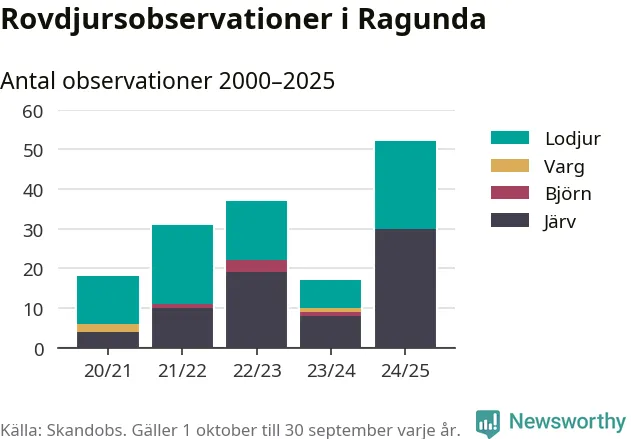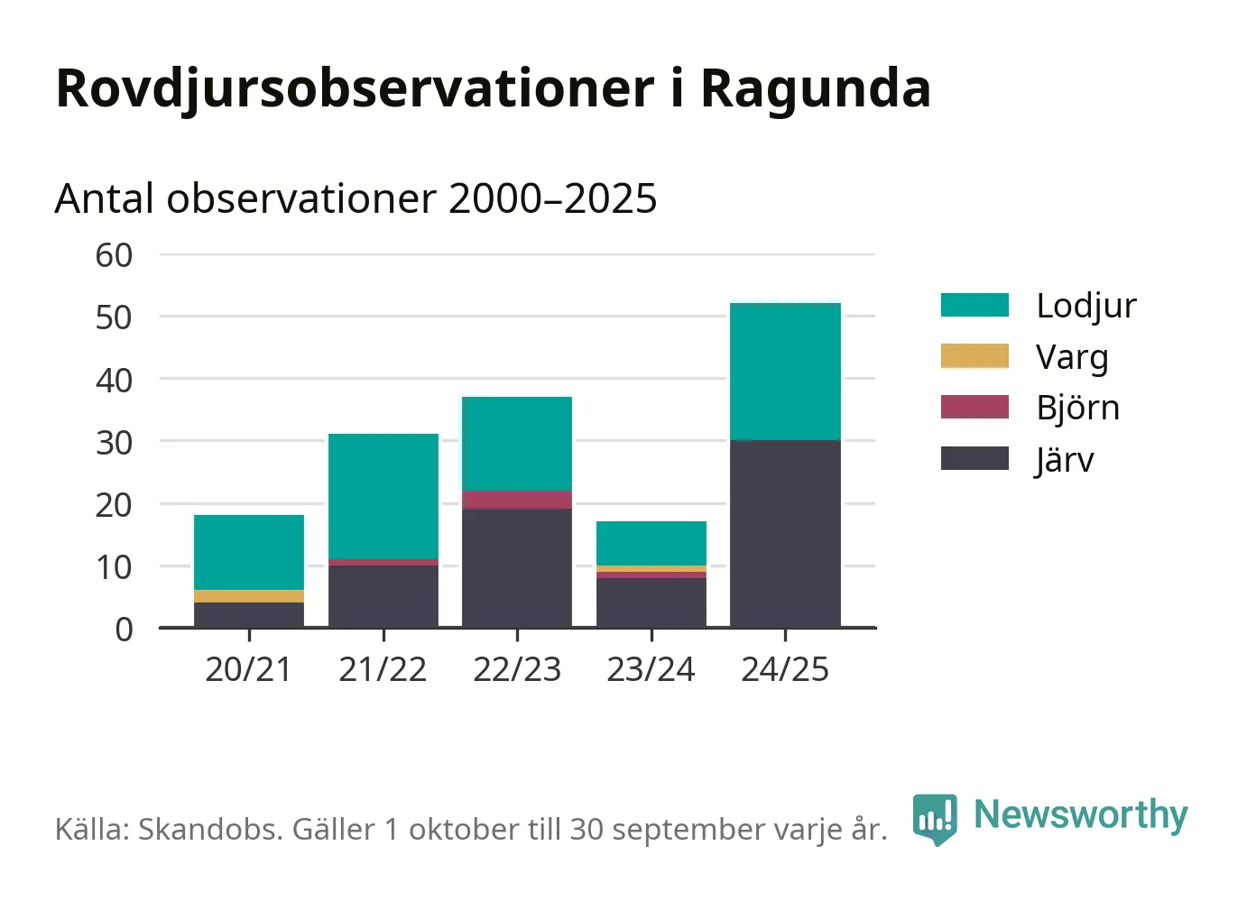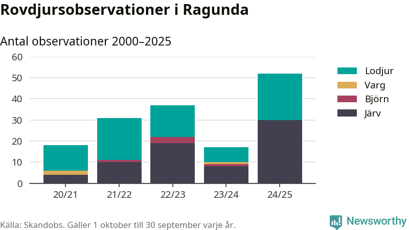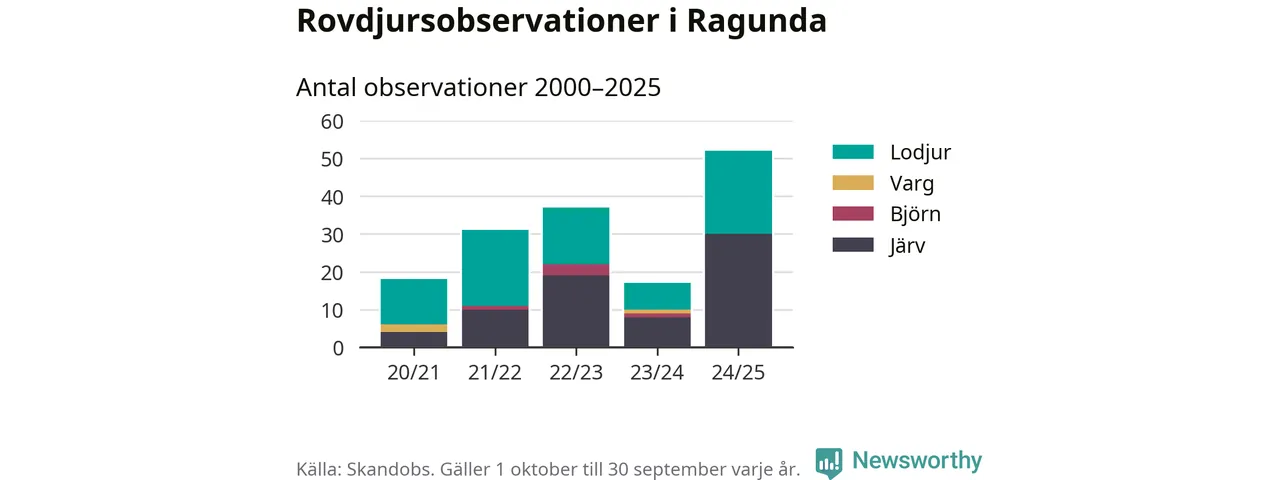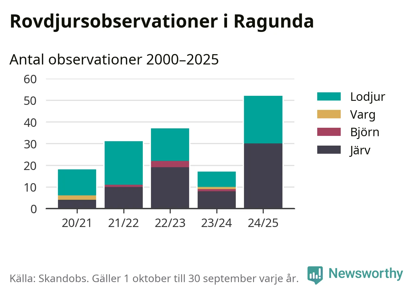 Där kan vem som helst rapportera sina observationer av de stora rovdjuren björn, varg, lodjur och järv. Mellan 1 oktober 2024 och 30 september i år har knappt 10 000 observationer registrerats i landet. Det kan vara synobservationer, foton, spår, spillning, döda bytesdjur eller andra tecken på rovdjursförekomst. I Ragunda handlar det om totalt 52 observationer av järv eller lodjur.