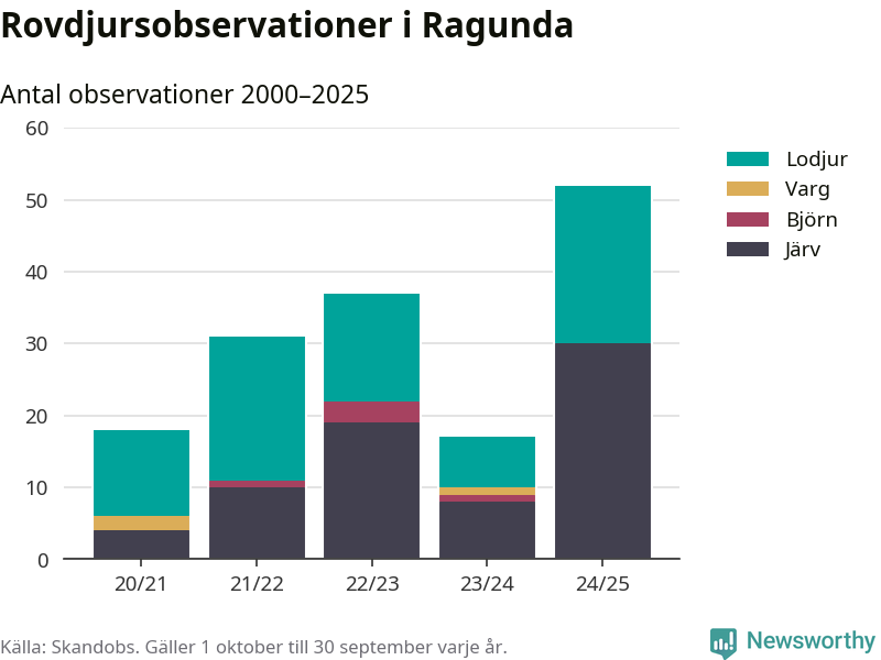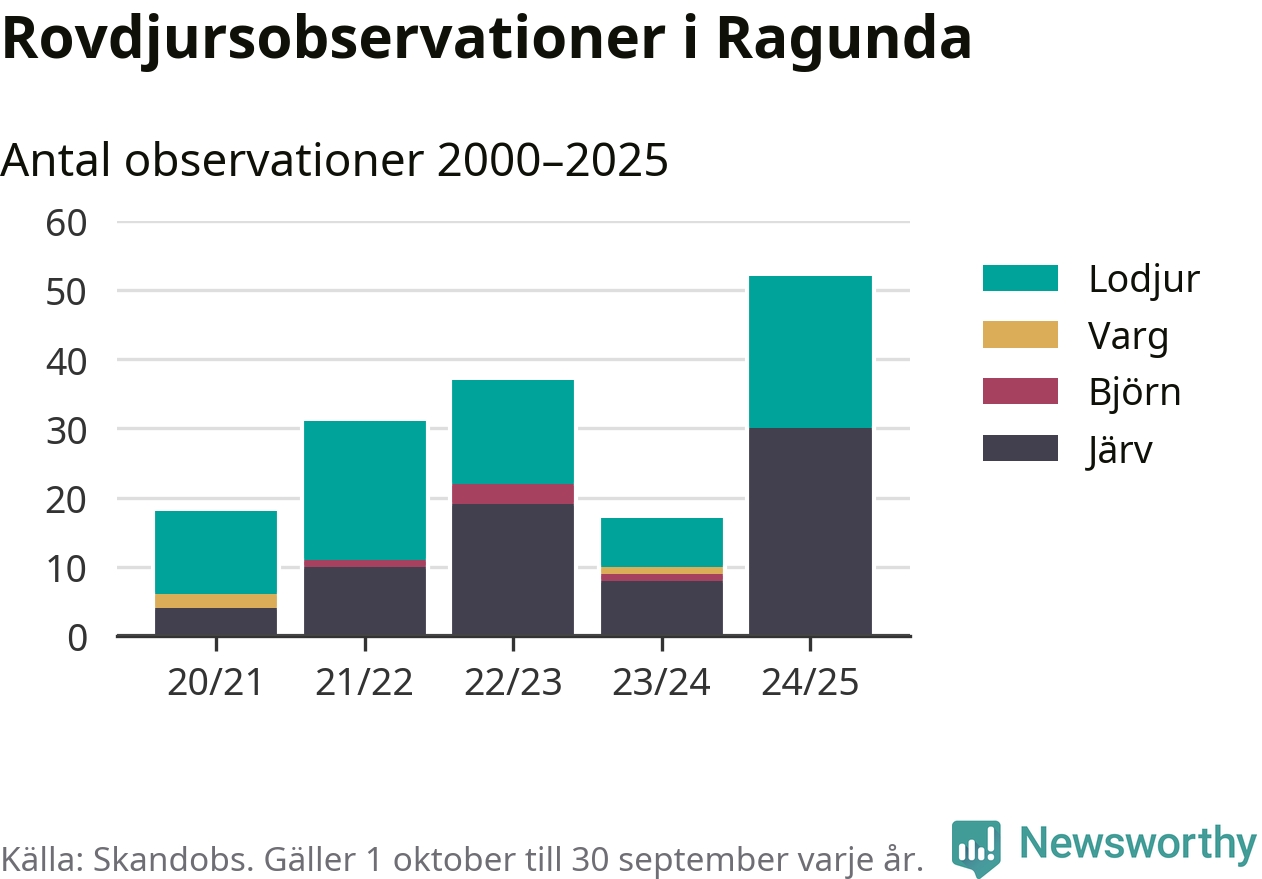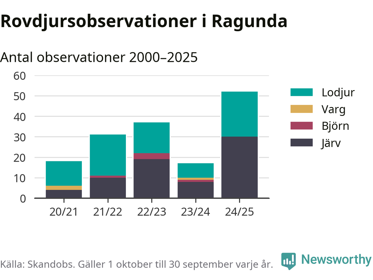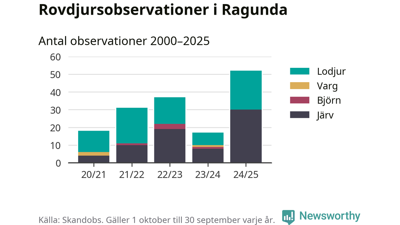 Där kan vem som helst rapportera sina observationer av de stora rovdjuren björn, varg, lodjur och järv. Mellan 1 oktober 2024 och 30 september i år har knappt 10 000 observationer registrerats i landet. Det kan vara synobservationer, foton, spår, spillning, döda bytesdjur eller andra tecken på rovdjursförekomst. I Ragunda handlar det om totalt 52 observationer av järv eller lodjur.