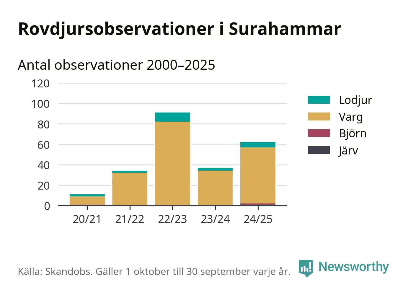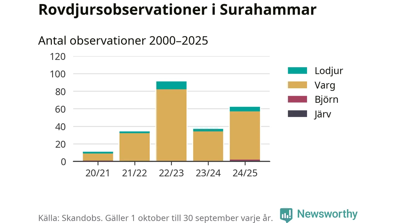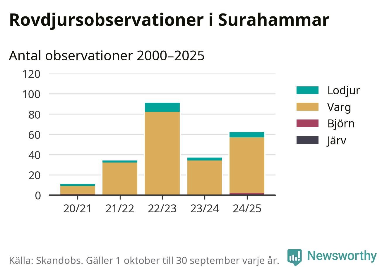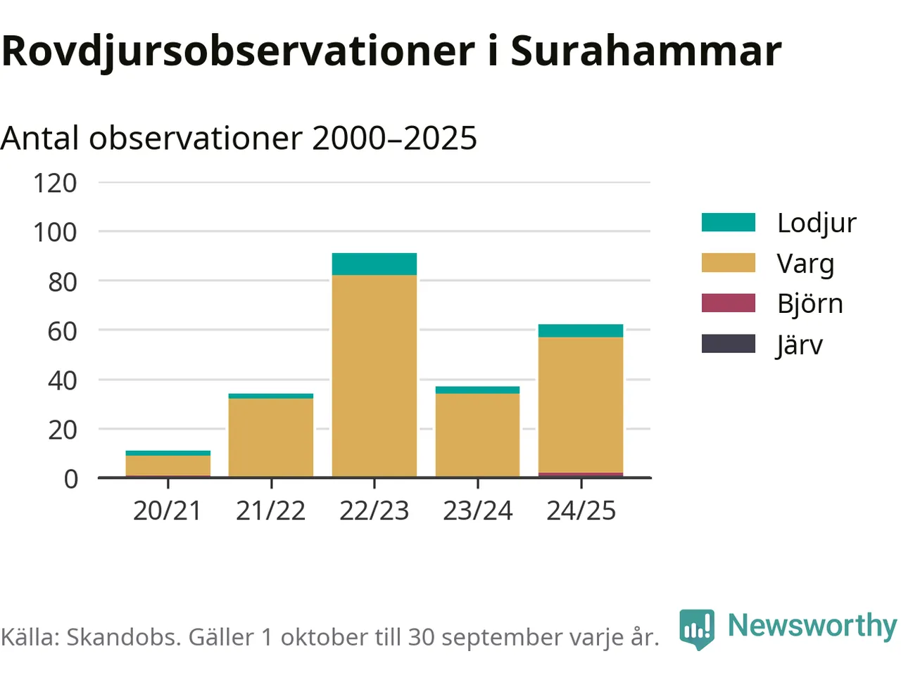 Där kan vem som helst rapportera sina observationer av de stora rovdjuren björn, varg, lodjur och järv. Mellan 1 oktober 2024 och 30 september i år har knappt 10 000 observationer registrerats i landet. Det kan vara synobservationer, foton, spår, spillning, döda bytesdjur eller andra tecken på rovdjursförekomst. I Surahammar finns totalt 62 rapporter, om alla fyra rovdjur.