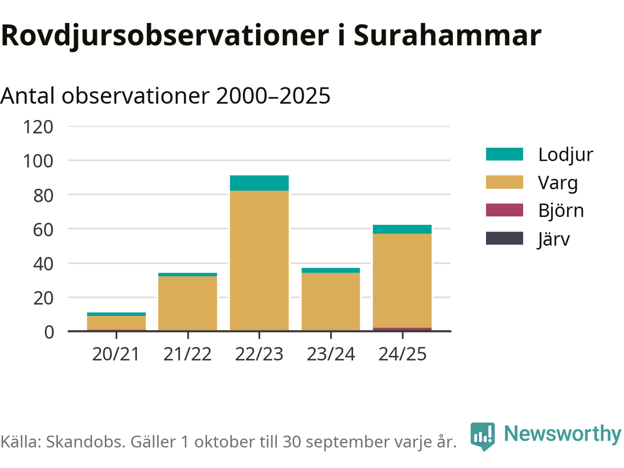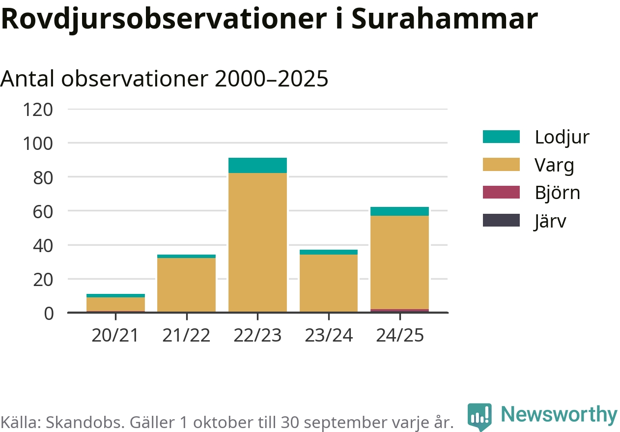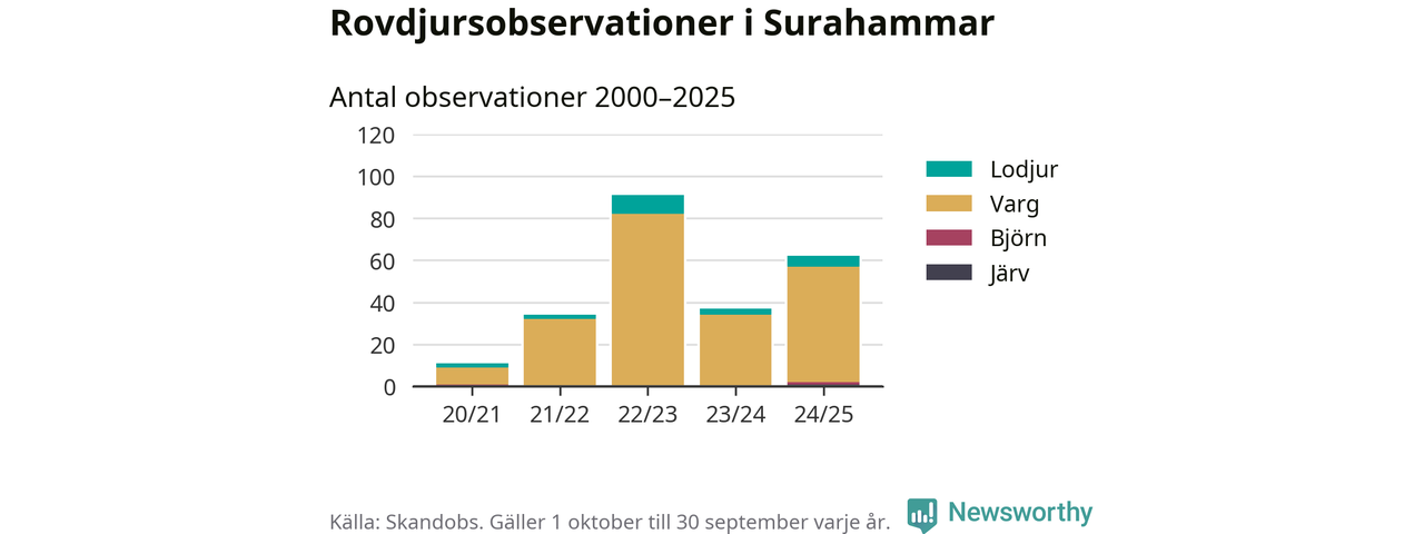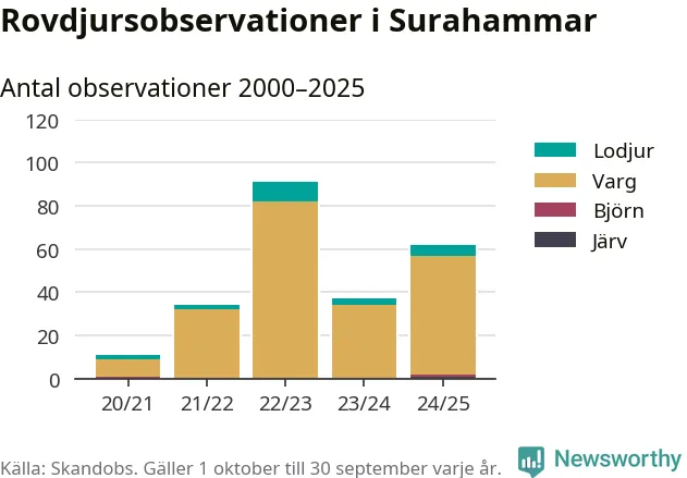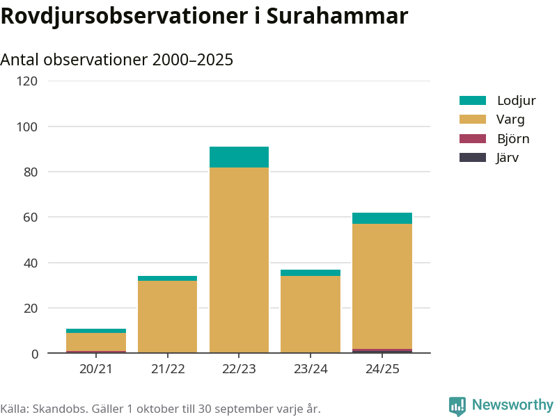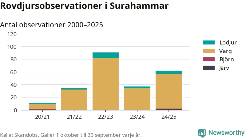 Där kan vem som helst rapportera sina observationer av de stora rovdjuren björn, varg, lodjur och järv. Mellan 1 oktober 2024 och 30 september i år har knappt 10 000 observationer registrerats i landet. Det kan vara synobservationer, foton, spår, spillning, döda bytesdjur eller andra tecken på rovdjursförekomst. I Surahammar finns totalt 62 rapporter, om alla fyra rovdjur.