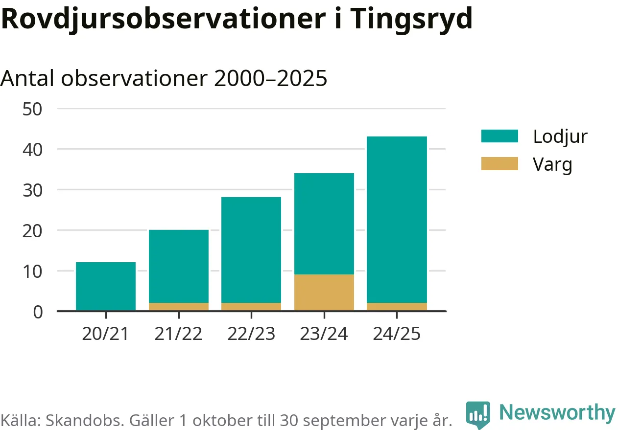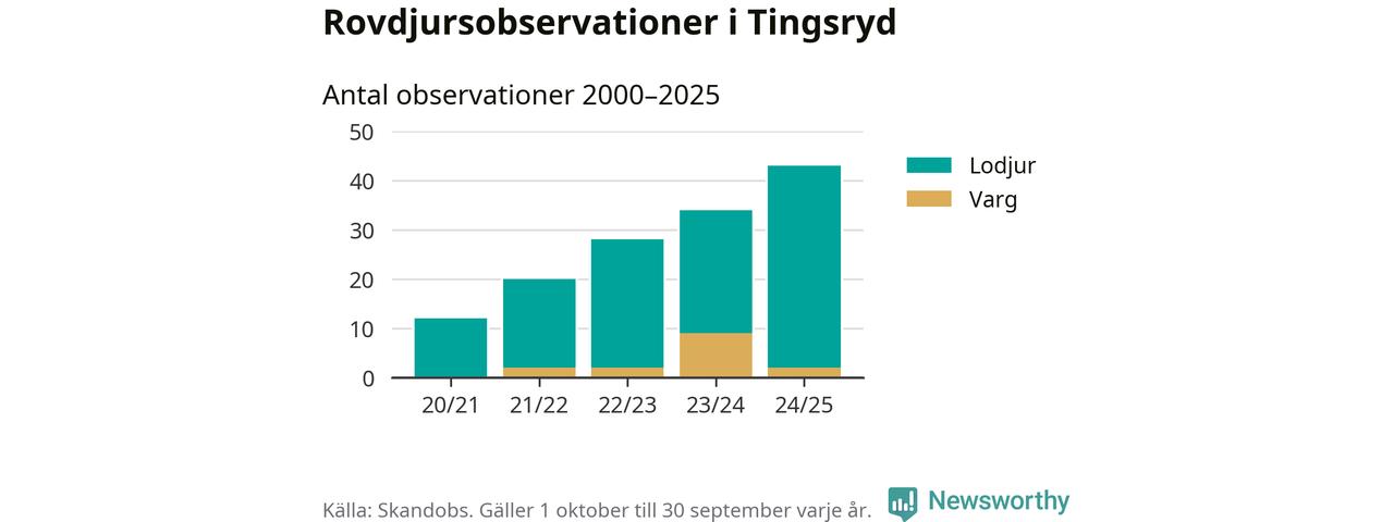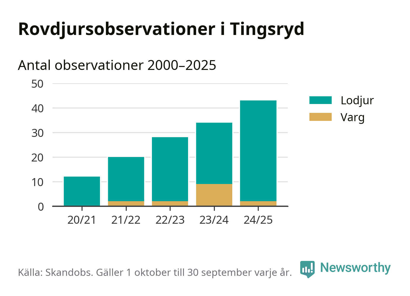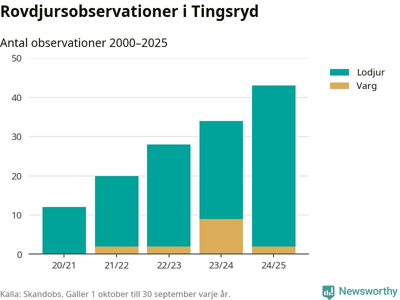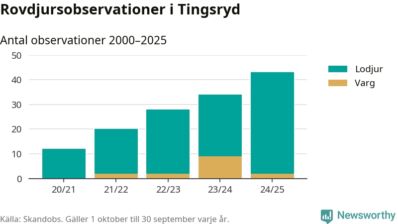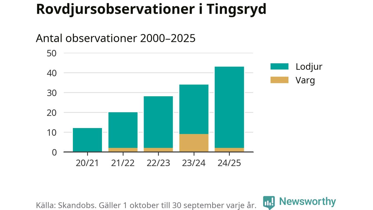 Där kan vem som helst rapportera sina observationer av de stora rovdjuren björn, varg, lodjur och järv. Mellan 1 oktober 2024 och 30 september i år har knappt 10 000 observationer registrerats i landet. Det kan vara synobservationer, foton, spår, spillning, döda bytesdjur eller andra tecken på rovdjursförekomst. I Tingsryd handlar det om totalt 43 observationer av lodjur eller varg.
