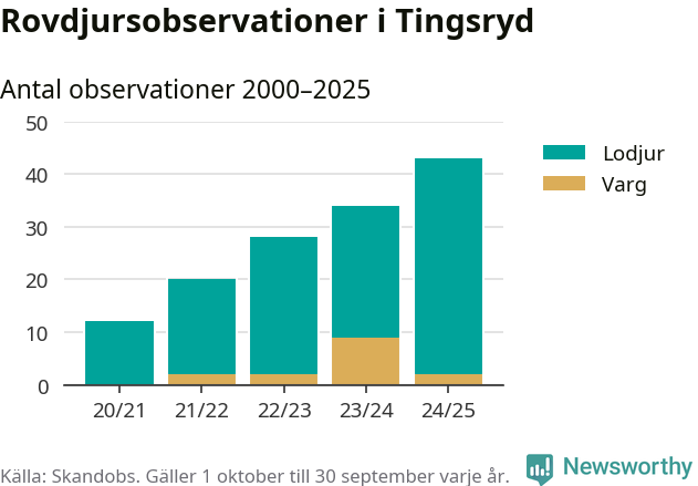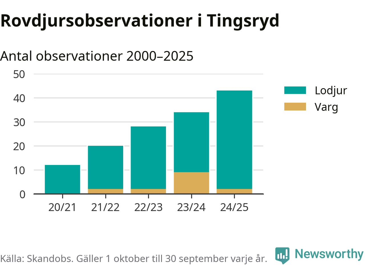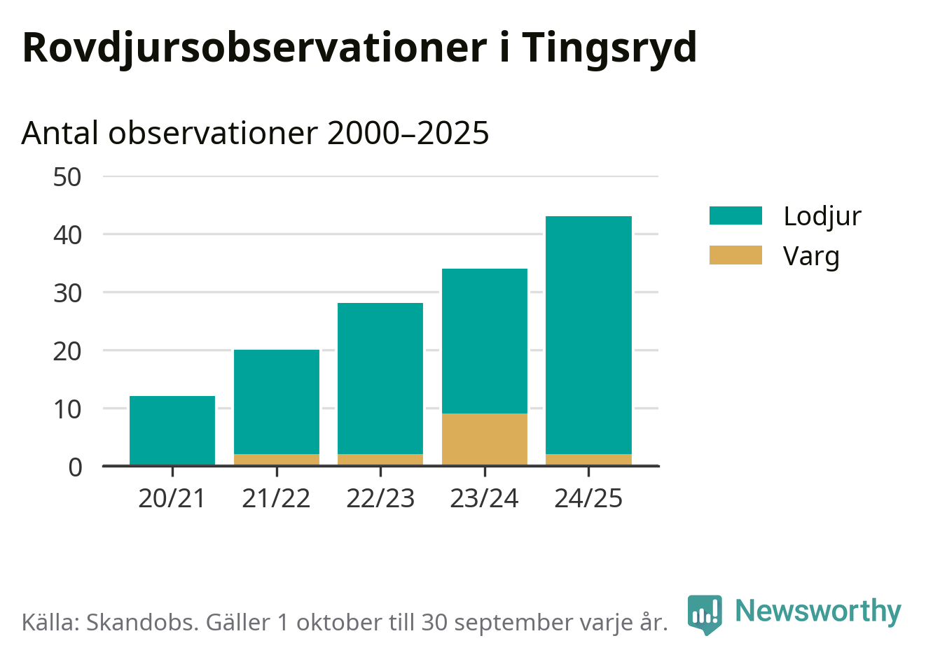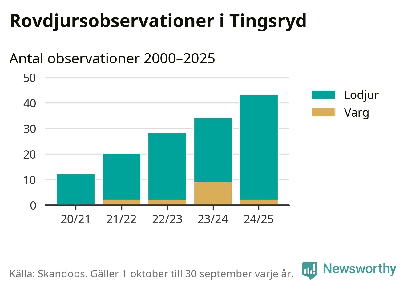 Där kan vem som helst rapportera sina observationer av de stora rovdjuren björn, varg, lodjur och järv. Mellan 1 oktober 2024 och 30 september i år har knappt 10 000 observationer registrerats i landet. Det kan vara synobservationer, foton, spår, spillning, döda bytesdjur eller andra tecken på rovdjursförekomst. I Tingsryd handlar det om totalt 43 observationer av lodjur eller varg.