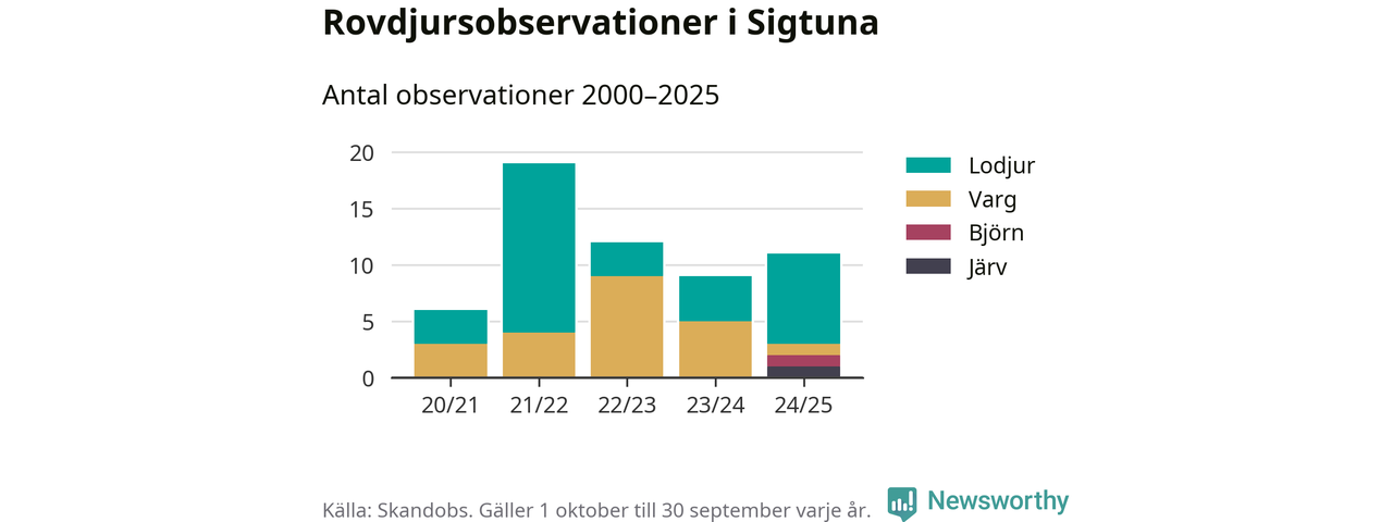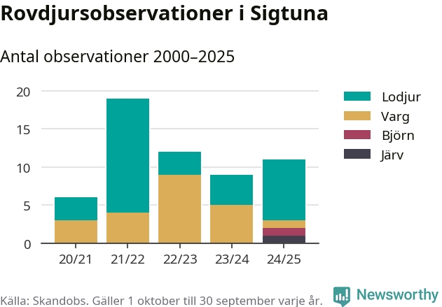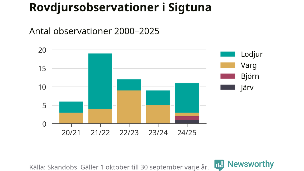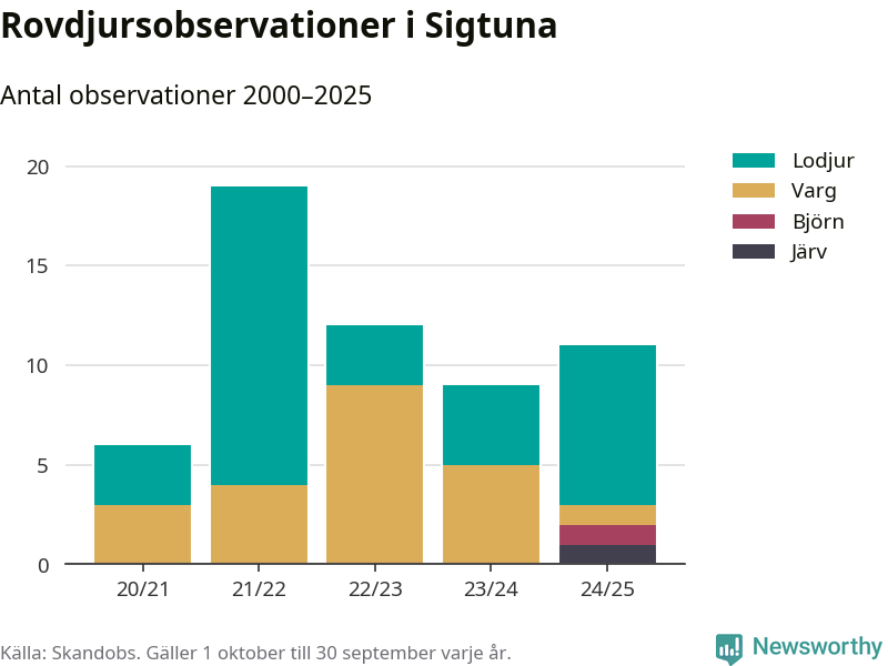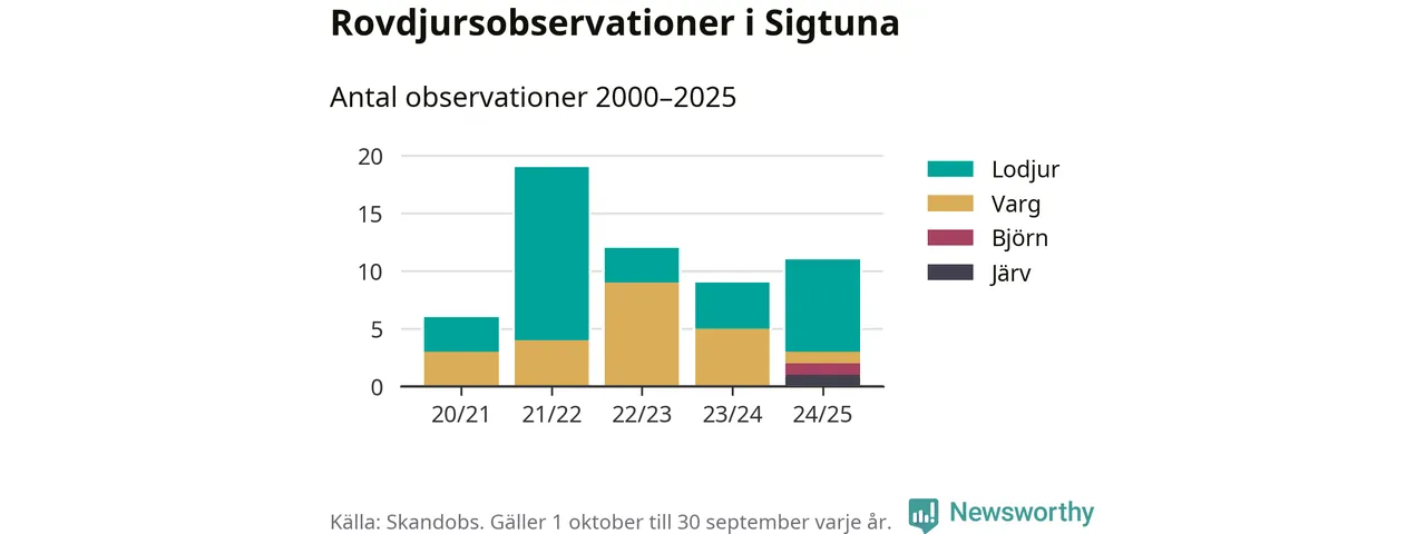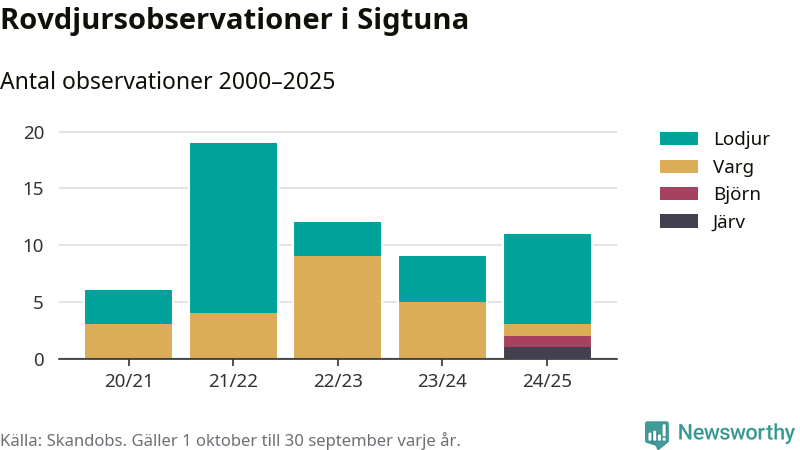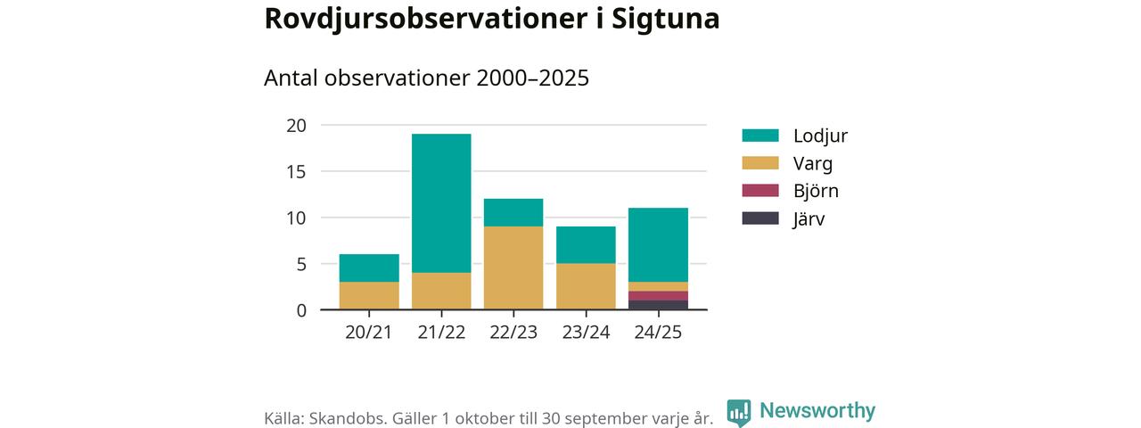 Där kan vem som helst rapportera sina observationer av de stora rovdjuren björn, varg, lodjur och järv. Mellan 1 oktober 2024 och 30 september i år har knappt 10 000 observationer registrerats i landet. Det kan vara synobservationer, foton, spår, spillning, döda bytesdjur eller andra tecken på rovdjursförekomst. I Sigtuna finns totalt elva rapporter, om alla fyra rovdjur.