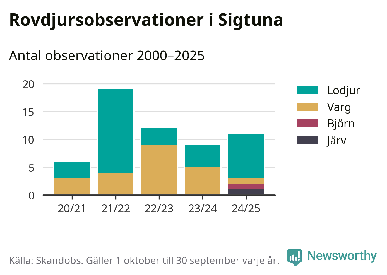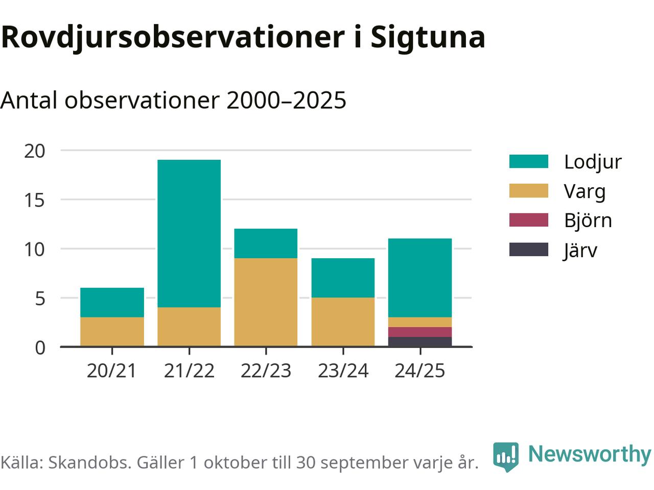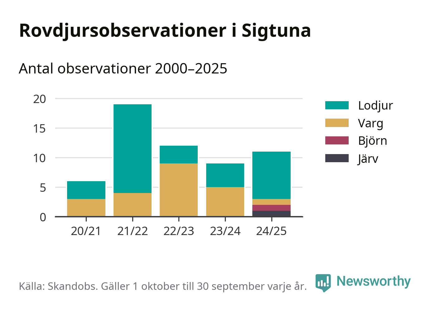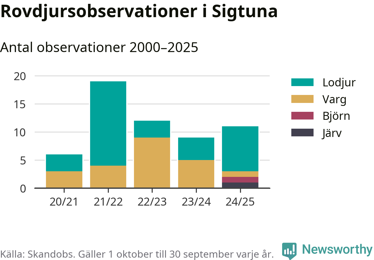 Där kan vem som helst rapportera sina observationer av de stora rovdjuren björn, varg, lodjur och järv. Mellan 1 oktober 2024 och 30 september i år har knappt 10 000 observationer registrerats i landet. Det kan vara synobservationer, foton, spår, spillning, döda bytesdjur eller andra tecken på rovdjursförekomst. I Sigtuna finns totalt elva rapporter, om alla fyra rovdjur.